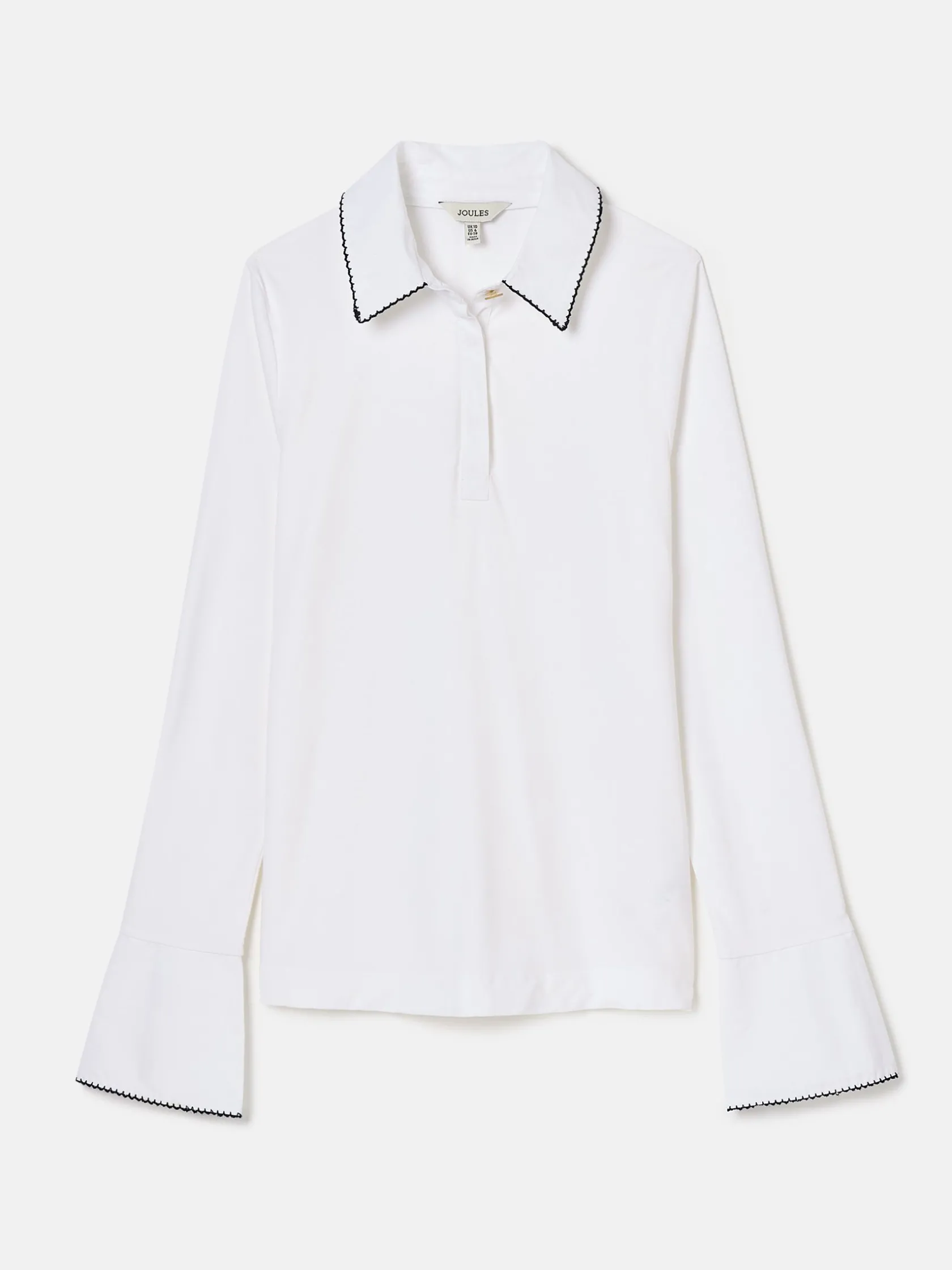 Crafted from a lightweight and easy-to-wear fabric, this top is adorned with an equestrian-inspired repeat geo-pattern, an elegant scallop-stitch collar and exaggerated cuffs. Elegant on its own and perfect underneath a knitted tank, it’s a perfect blend of style and practicality. A great piece to have close by to easy elevate your off-duty wardrobe.nnLightweightnButton scallop stitch collarnExaggerated cuffs with button detail