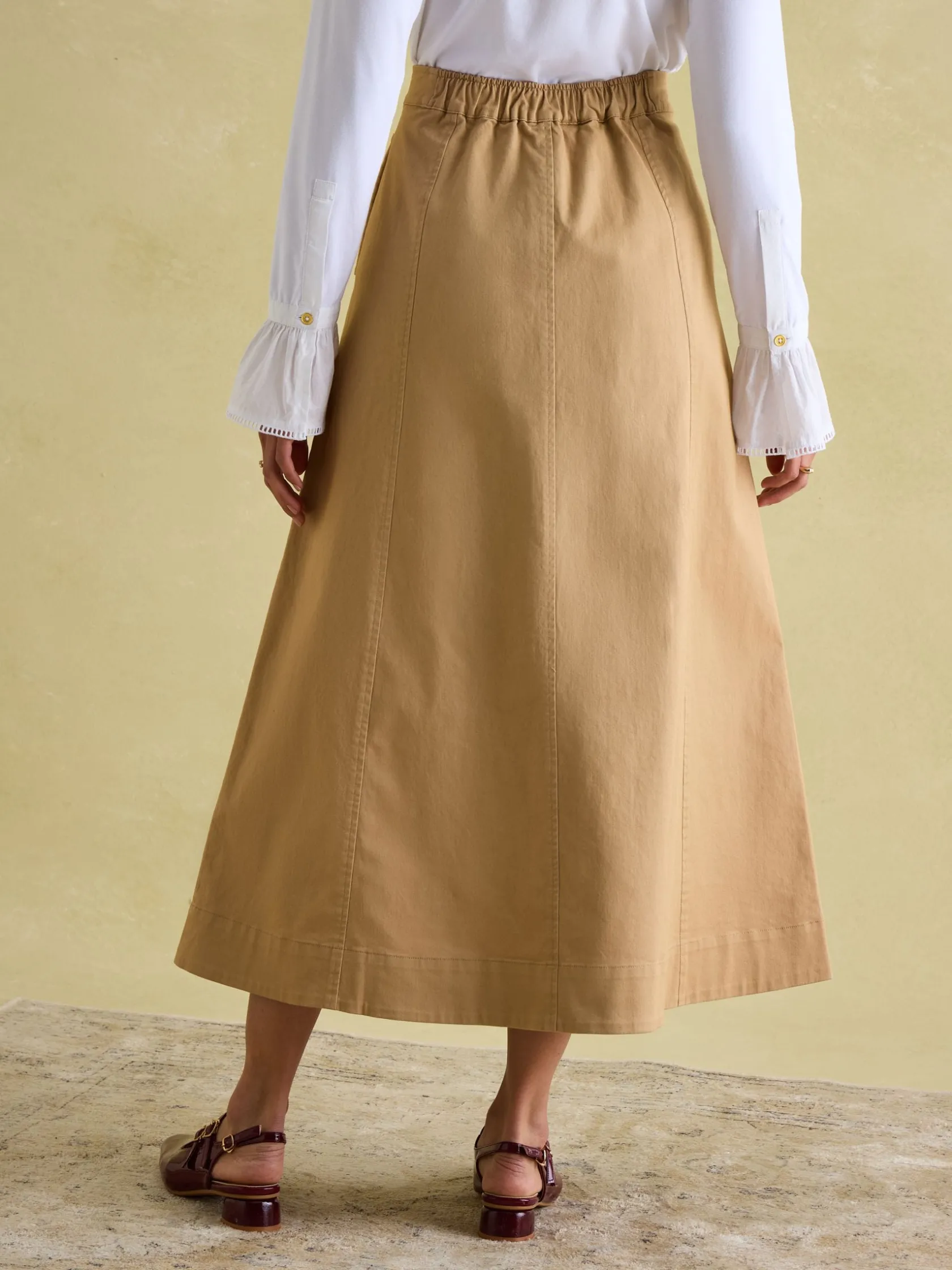 A truly transitional piece, the Meredith skirt will see you move stylishly into autumn and beyond. It falls to a midi length which makes it easy to wear with anything from pumps to leather boots. Our take on utilitarian style, it has a structured a-line shape, wide panels with top stitch detailing, two side pockets with button fastenings and comes in a neutral tan colour. The scalloped trim gives it a feminine feel that will have you reaching for it on any occasion. Cotton blend. Mid rise waist. A-line shape. Midi length. All over panelling. Top stitch detailing. Scalloped hem. Side pockets with button fastenings.