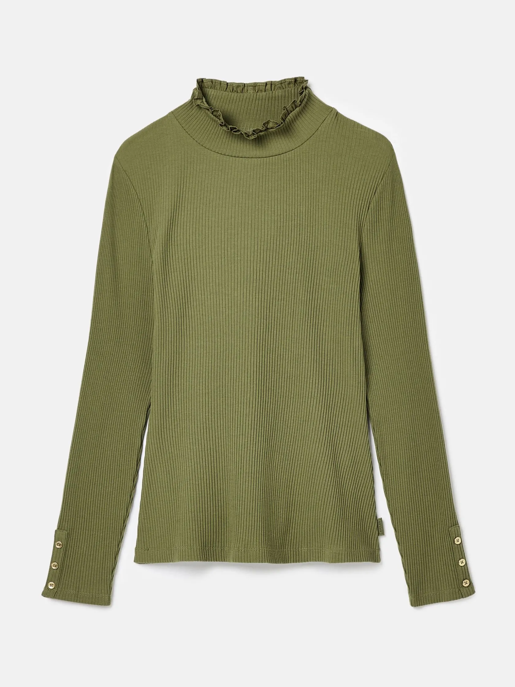 Crafted from cotton that includes a little stretch for a lot of comfort, this top will be the perfect starting point for a lot of outfits. With it’s ribbed texture, high-neck frill collar and button detail to the cuffs, it can sit effortlessly under dresses and shirts for a elegant yet understated look.nnRibbednFrill necknLong sleevesnButton cuff detail