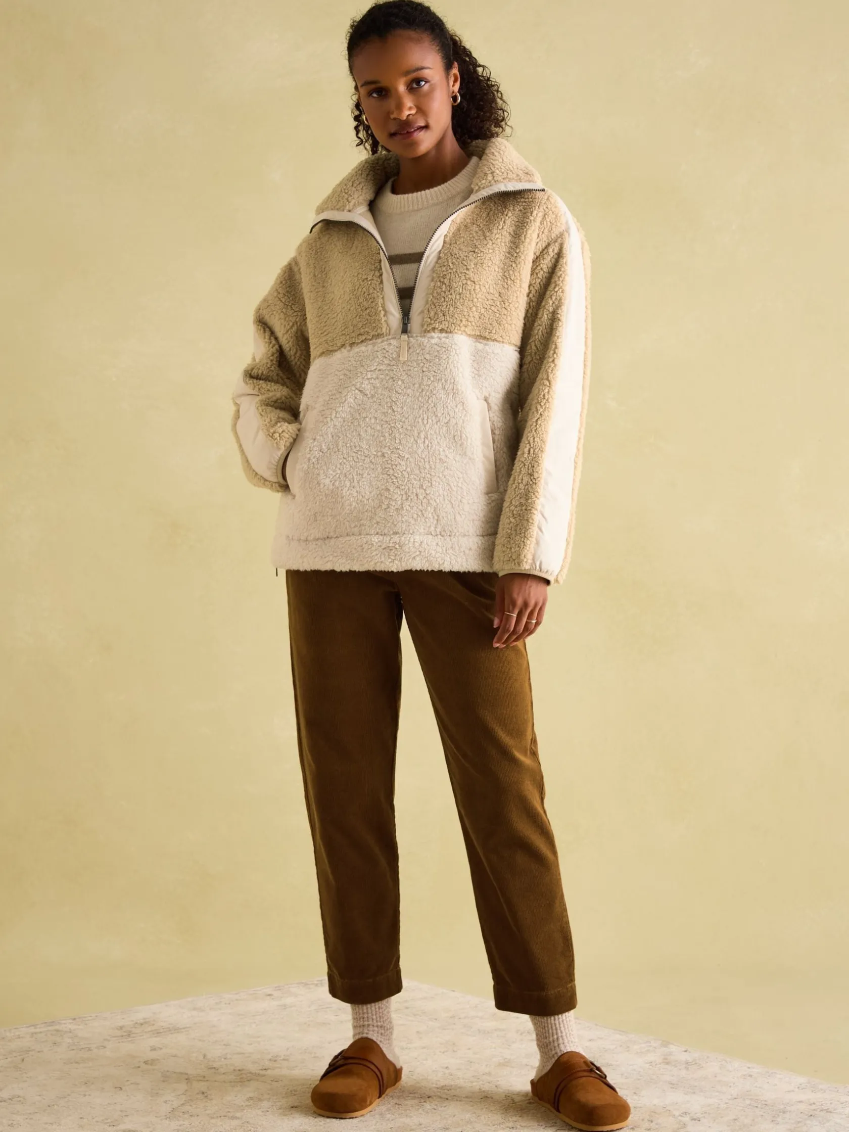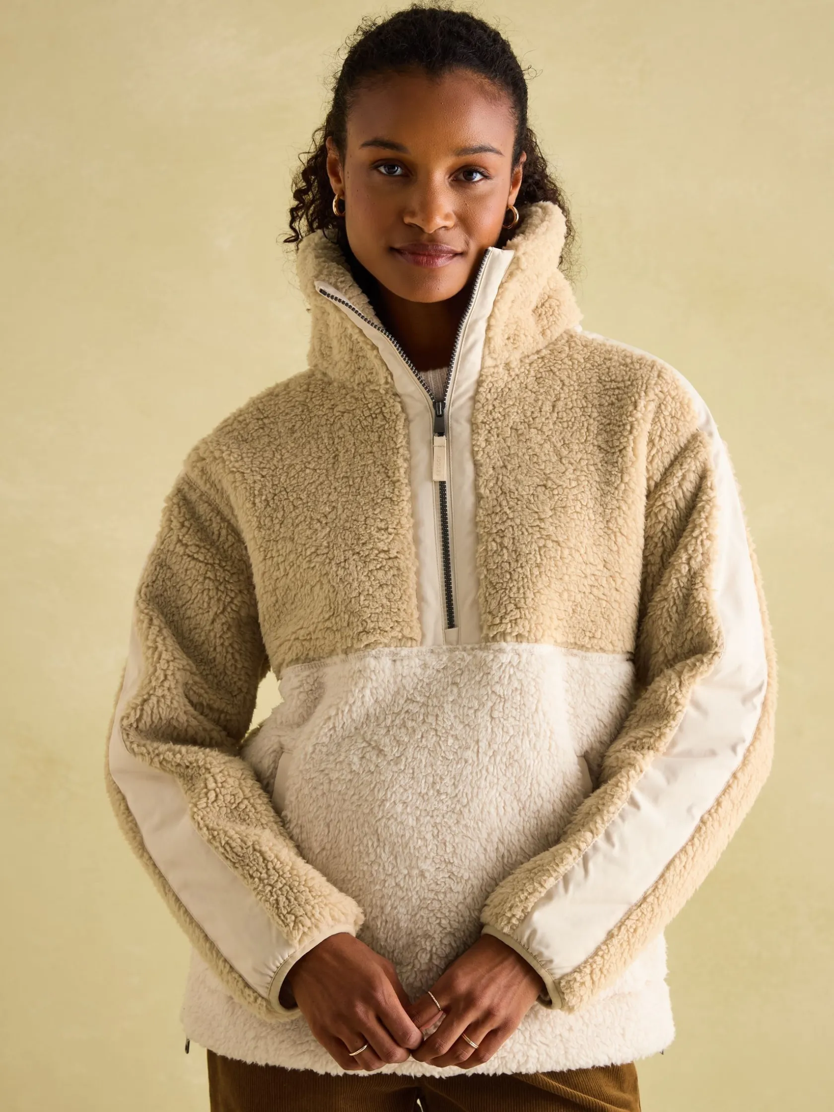 Do you remember the Tilly fleece? It was the style from last season that made cold days something to look forward to and nights even more joyful. Well, it’s back and like an old friend, it’s bringing familiar comfort (with a few inevitable changes made along the way). The cloud-like borg fleece fabric was adored by all, so of course that has stayed but it is now complemented by woven panels to the sleeves, pockets and zip placket for a sporty, ‘athleisure’ edge. The contemporary oversized fit, quarter zip fastening and zipped side vents allow you the room to build layers beneath it. And as for the Joules detail to the back neck, well that serves as a nice reminder of your favourite brand. Borg fleece. Relaxed fit. A bestselling style. Dropped shoulders. Half zip fastening. Woven panels to the sleeves, pockets and placket. Zipped side vents. Side pockets. Tonal Joules woven detail under the collar