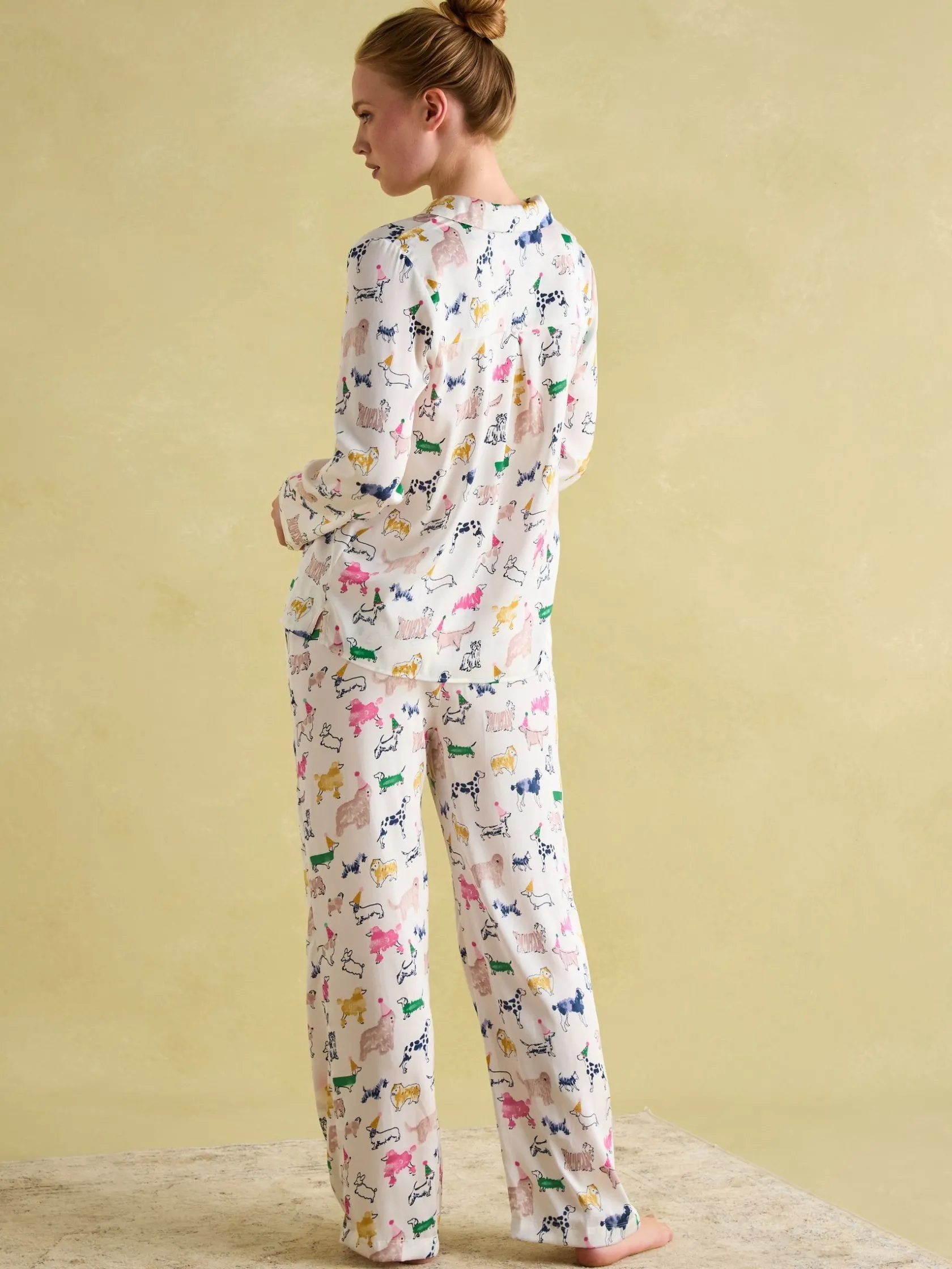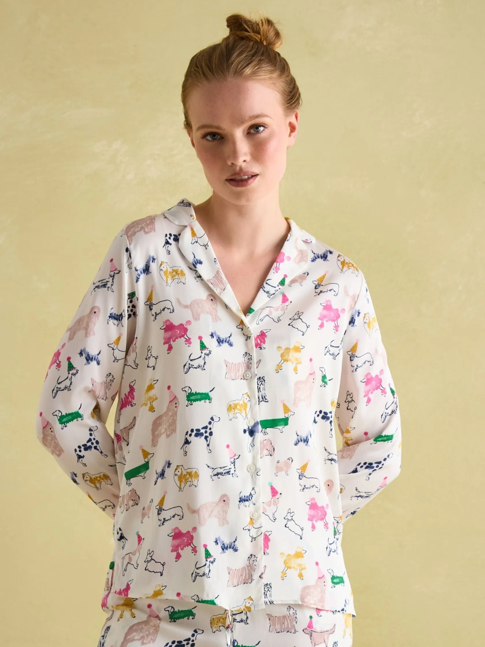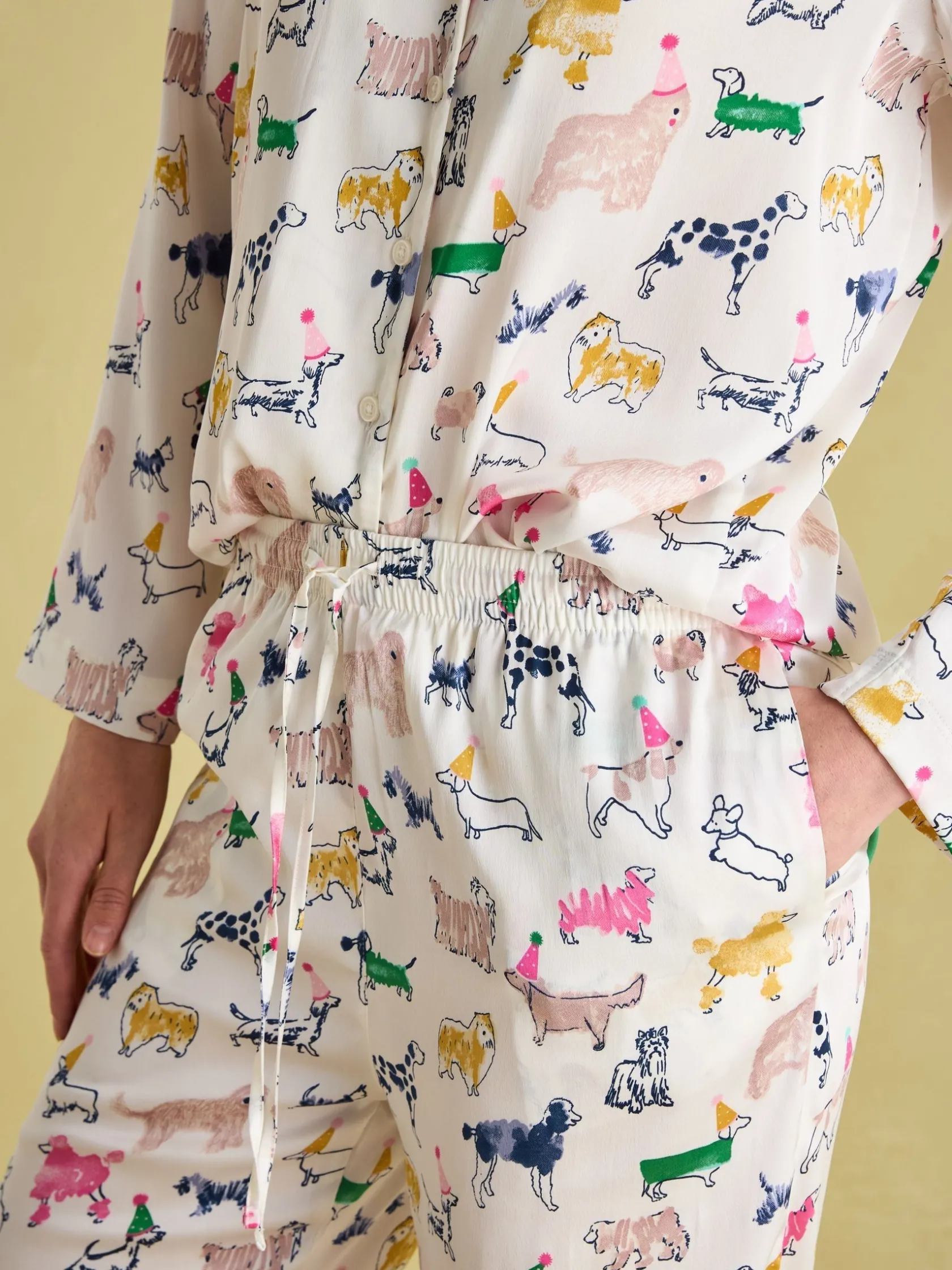 These green pyjamas are packed with personality, perfect for those who love life in the slow lane. The lightweight, soft satin fabric is adorned with an eye-catching print. The button fastening to the top and elasticated waistband to the button – along with handy pockets – are practical touches, whilst the pleating and trim details elevate this set further. Satin pyjama set. Top and bottoms. Button fastening on top. Elasticated waist on bottoms. Pockets.