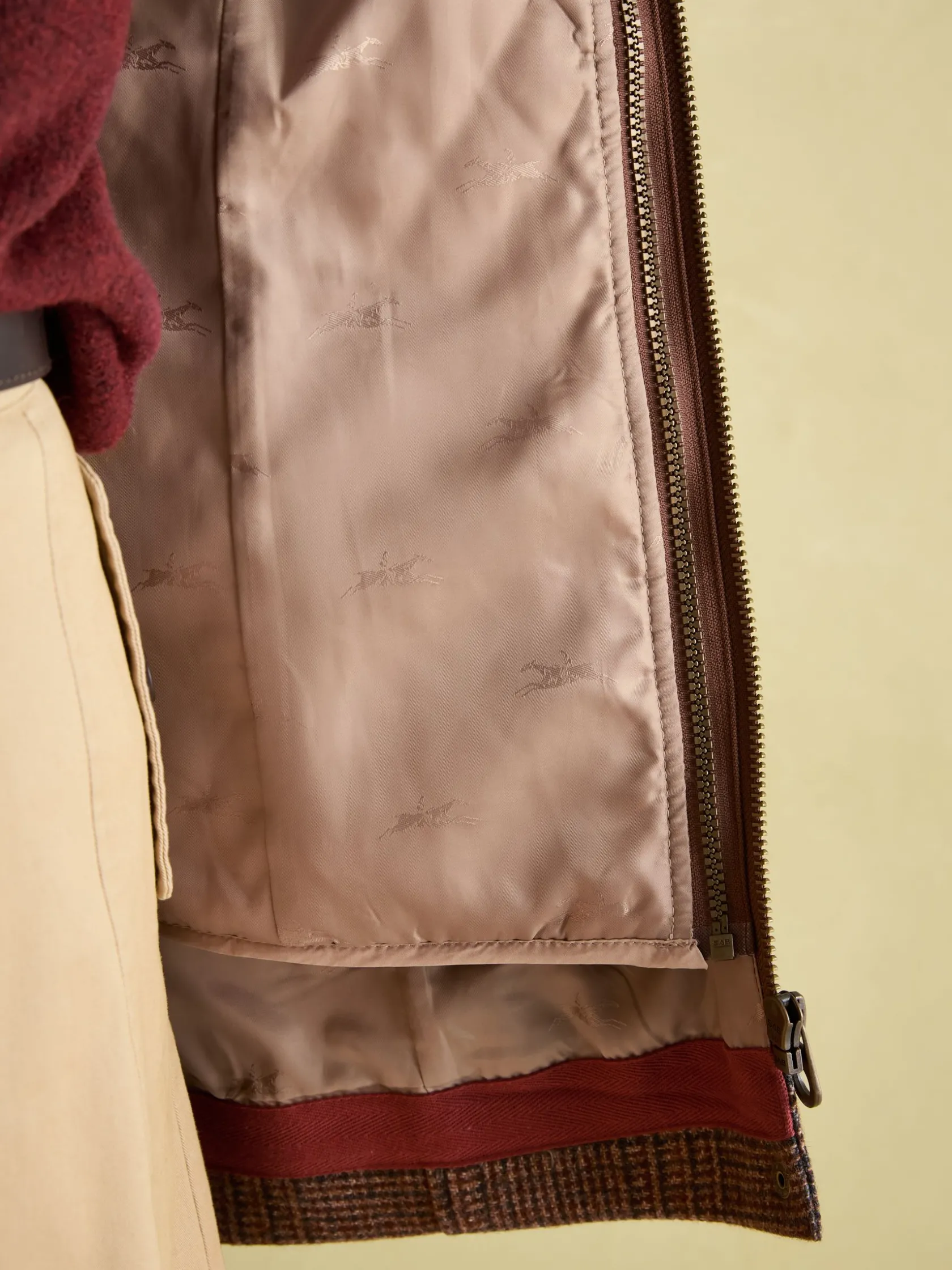 This is a sophisticated yet functional take on a traditional tweed fieldcoat. The details have been inspired by outdoor pursuits and the colours of the hardwearing tweed echo the rich landscape of the British countryside. Faux suede and antique-style brass trims add a little extra heritage, whilst the detachable luxury faux fur collar is a good-looking and practical feature. Lastly, the lightly quilted inner gilet easily detaches from the main jacket and when worn alone will make a perfect lighter layer. An investment piece that captures life in the countryside. Tweed. Zip and popper fastening. Removable quilted gilet. Equestrian-inspired printed lining. Antique-style brass trims. Detachable faux fur collar. Suede detailing. Adjustable cuffs with poppers. Patch pockets and side pockets with popper fastenings. Length: 77cm (based on UK size 12).