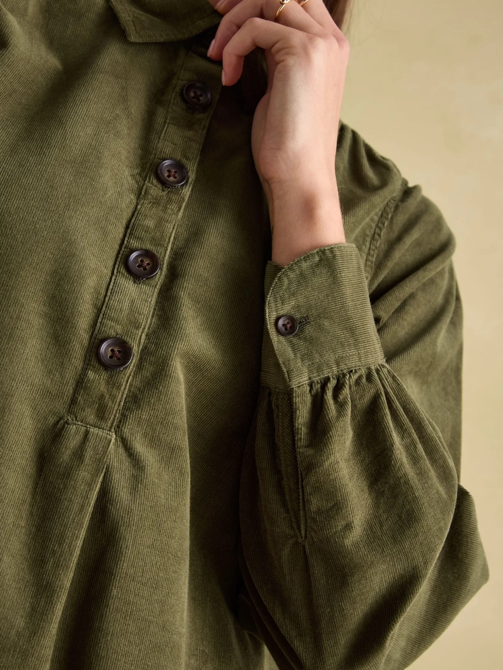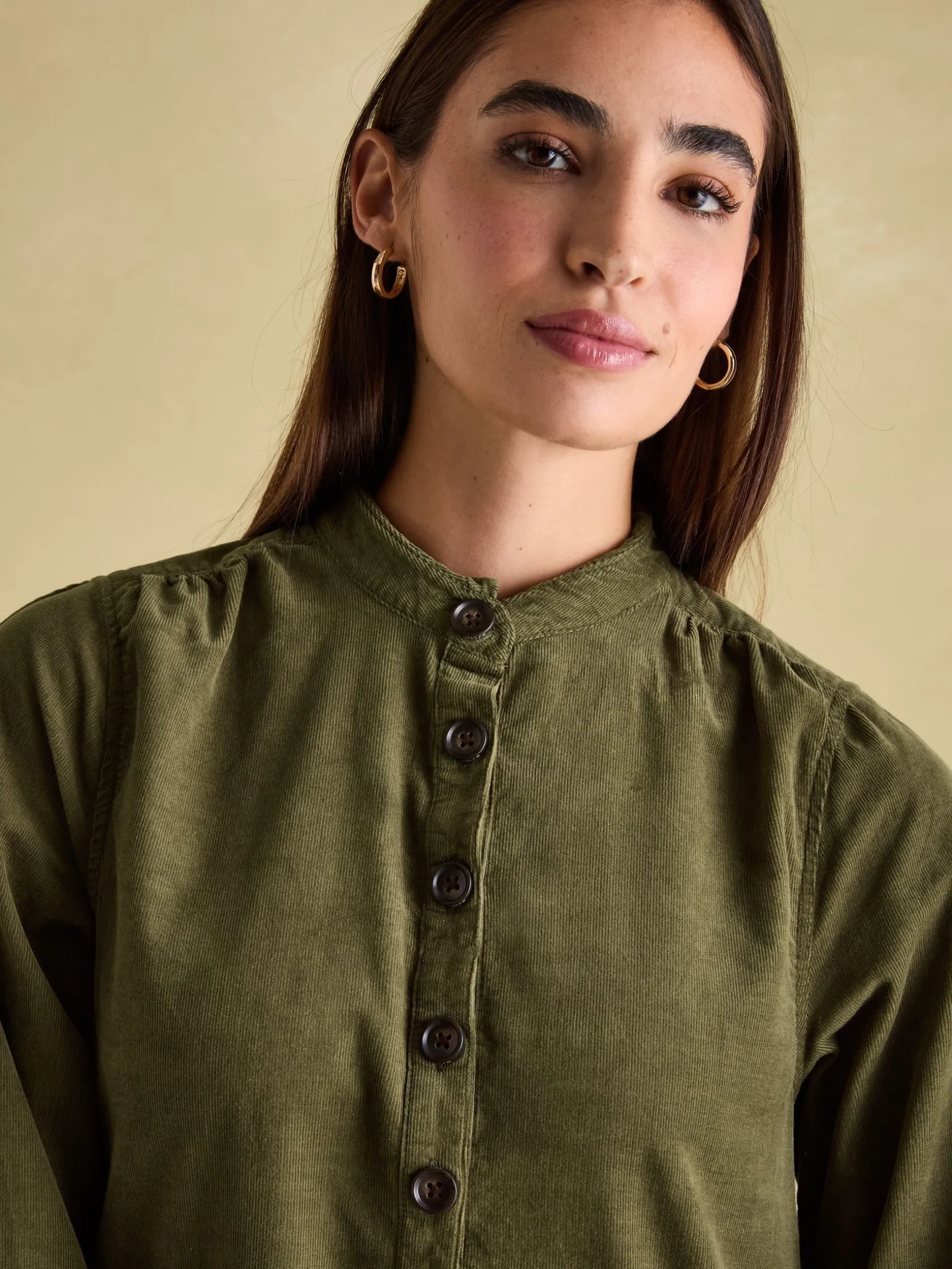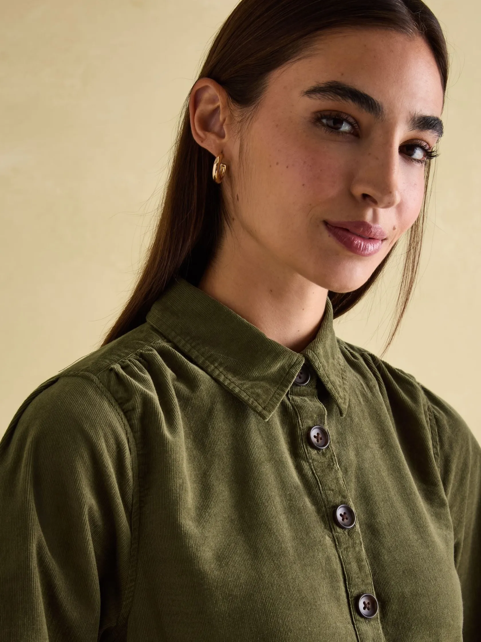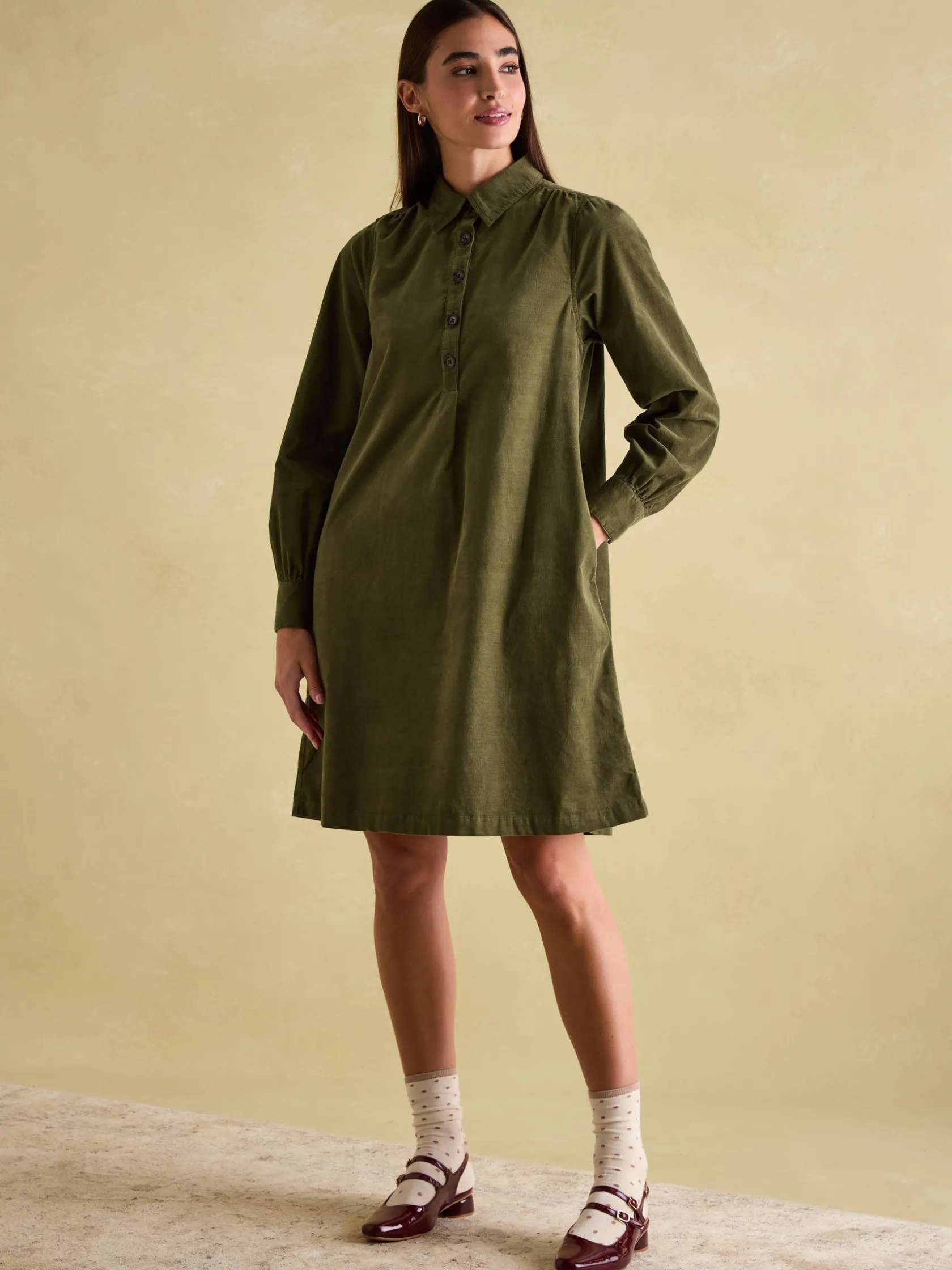 Introducing Maple – the dress you’ll lean on throughout the autumn and winter months. It’s made from 100% cotton corduroy making it a staple for the season, sits at a knee length and is a shirt-style with a button placket and collar. The long sleeves with gathered shoulders adds to its colder-weather appeal, while its curved button cuffs allow you to roll the sleeves up for a laid-back feel. Pockets in the side seams are a practical, finishing detail. 100% cotton. Knee length. Button placket. Long sleeves with gathered shoulders. Curved cuff with button fastenings. Pockets in the side seams. Collar. Pleated detailing to the front