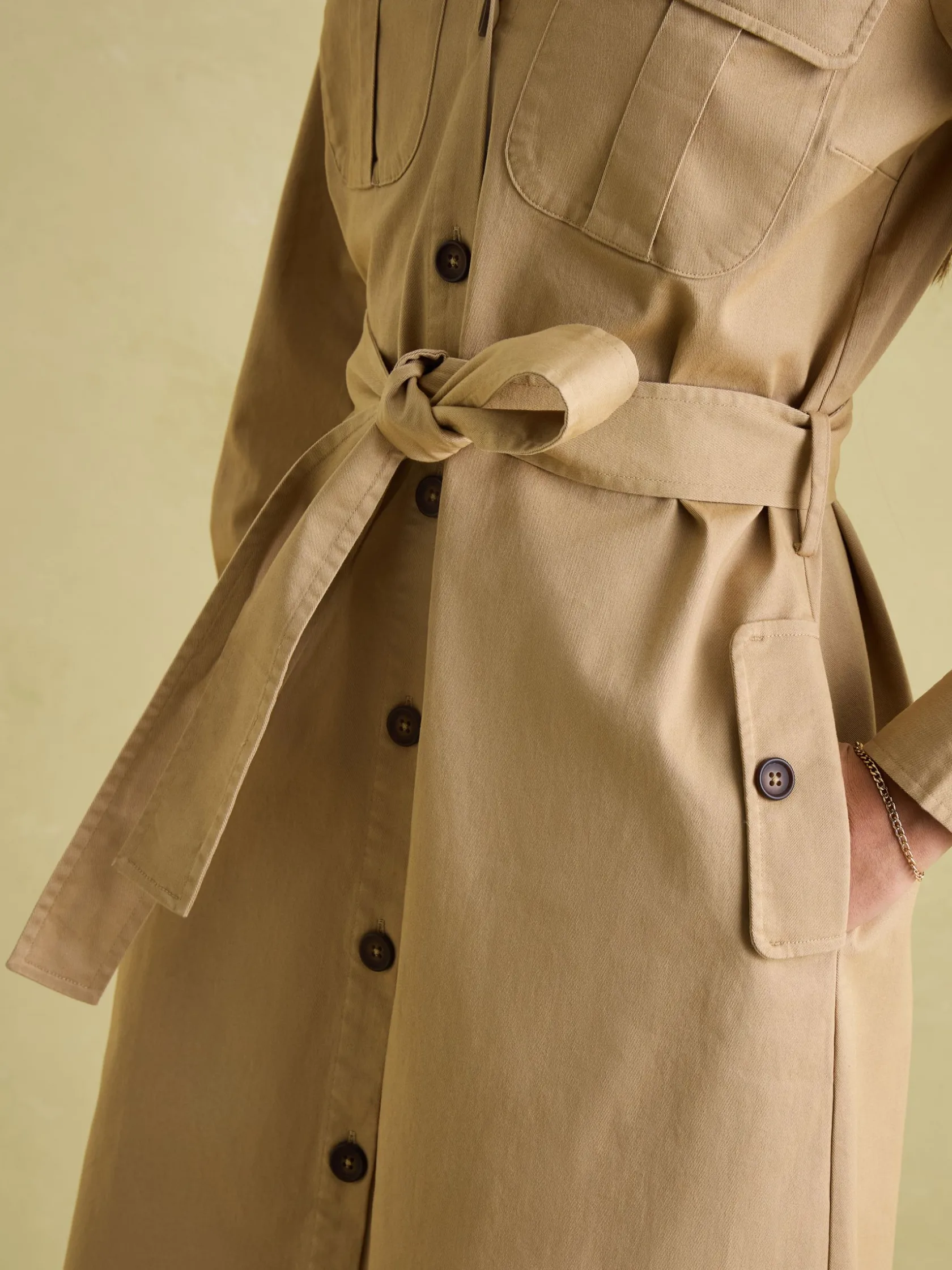Combining utilitarian style with flattering details, the Meredith dress is a great piece to welcome into your autumn wardrobe. The full button down fastening, abundance of pockets (two at the chest and two on each side) is a nod to its utilitarian influence, while the removable belt allows you to cinch it at the waist, or wear it without for a more relaxed fit. It sits at a midi length and has long sleeves with button cuffs making it a wonder for the cooler months. Wear it with a style of leather riding-style boots for a look that screams British elegance, or pumps for a cool casual feel. Cotton. Midi length. Utilitarian style pockets to the chest and side. Full button down fastening. Collar. Long sleeves with button cuffs. Removable belt at the waist.