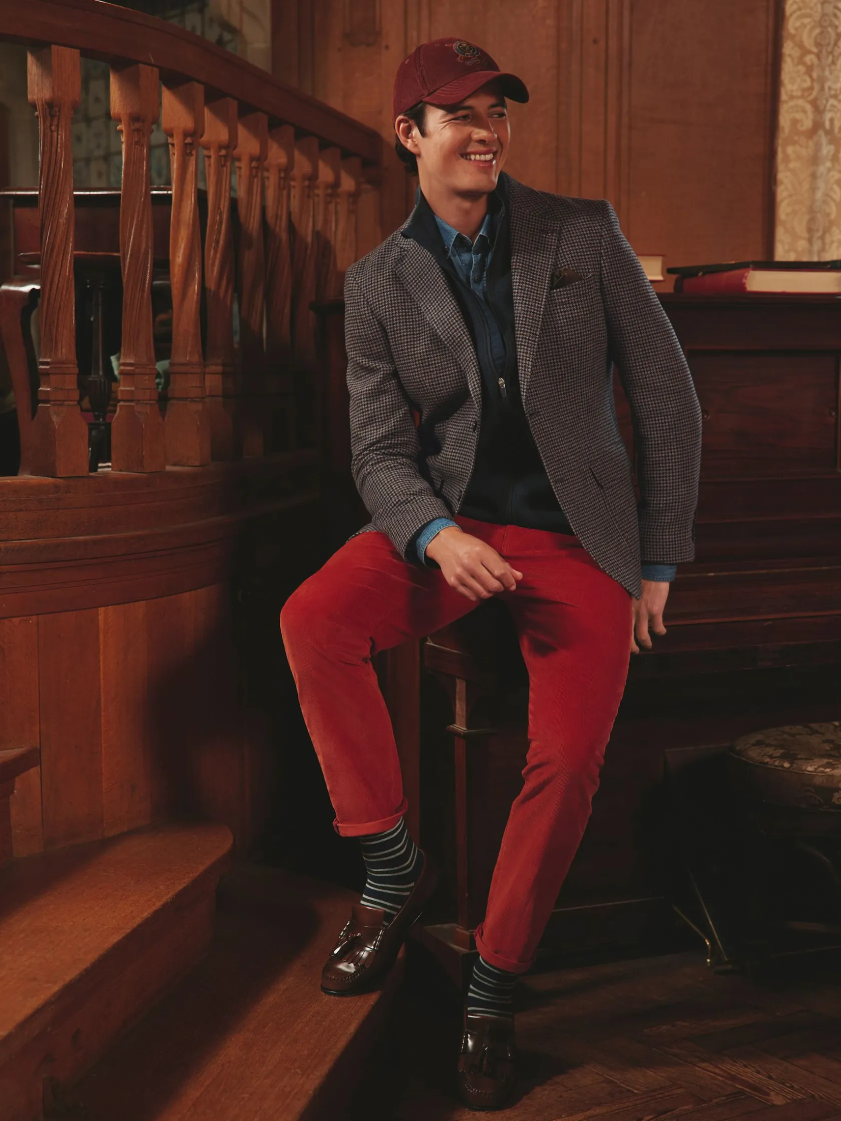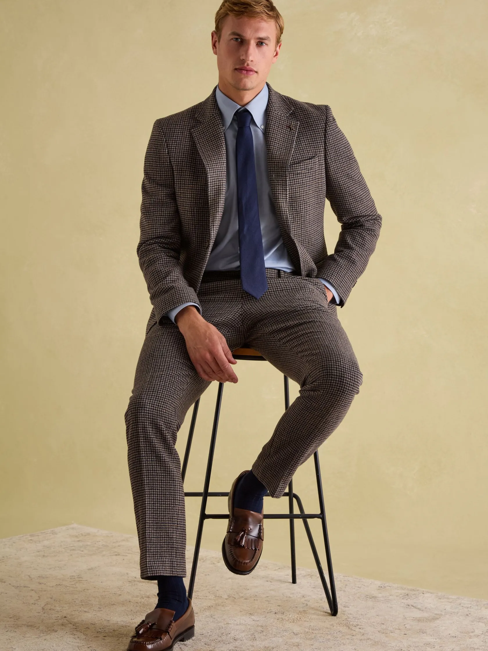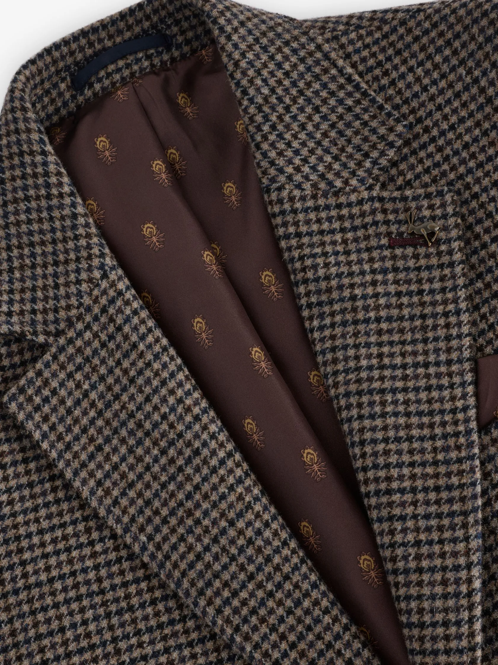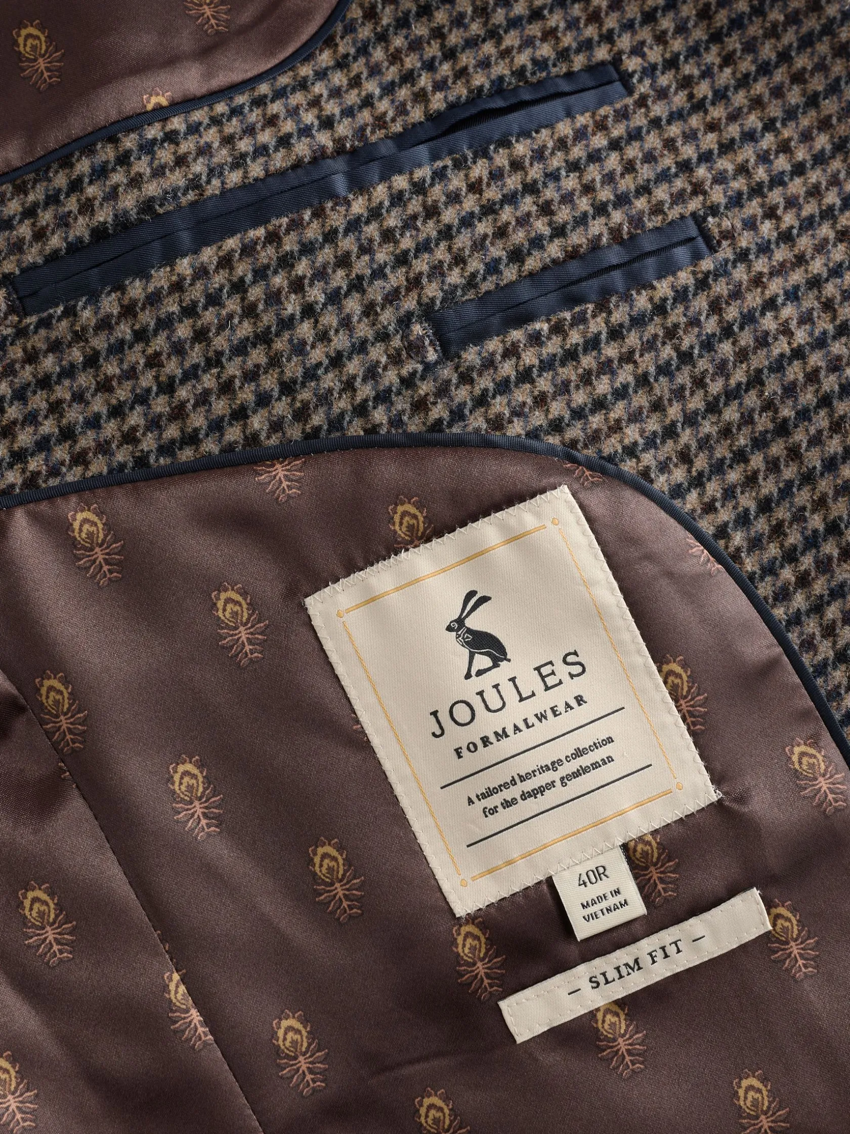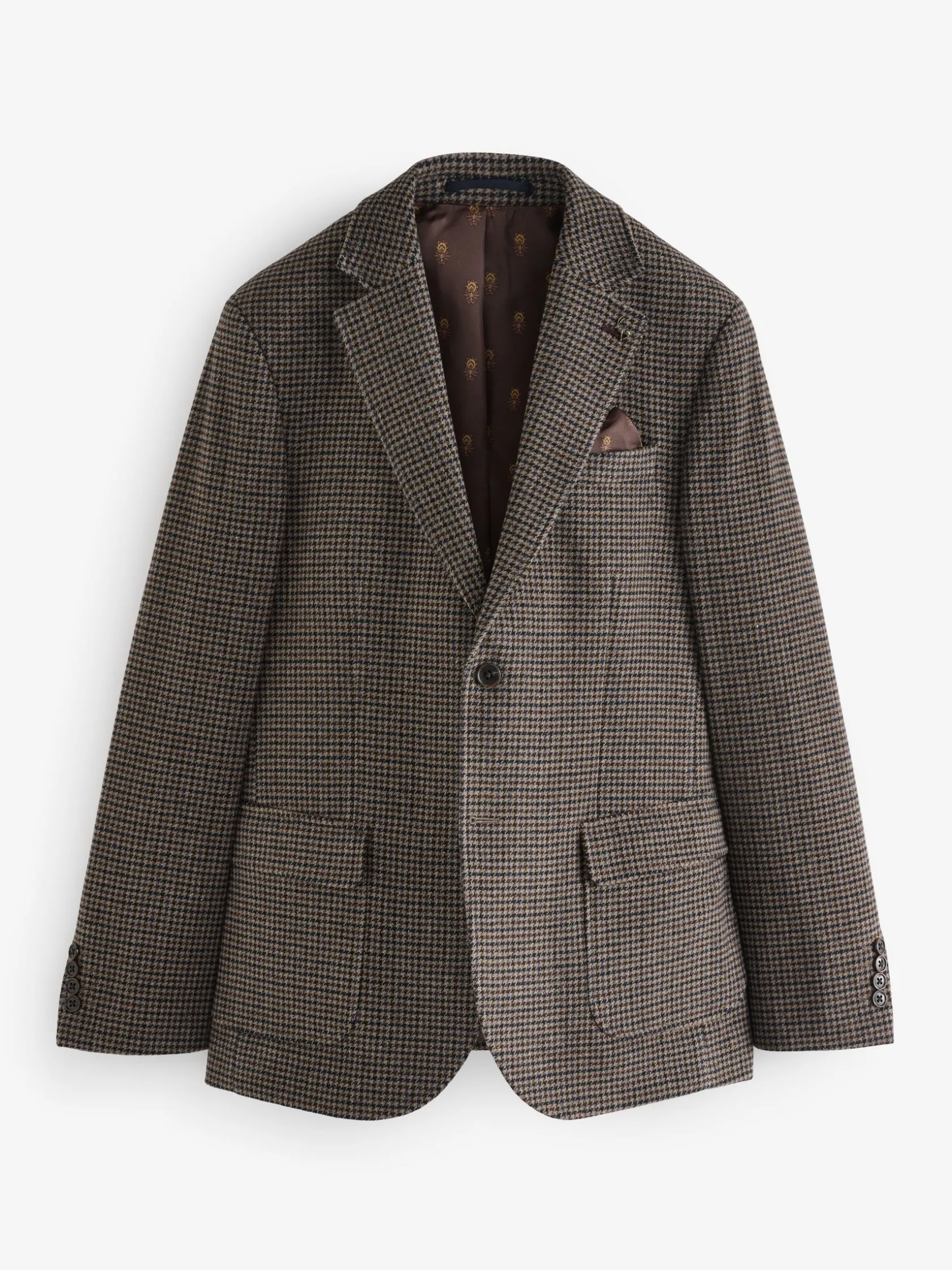 Combining a traditional dogtooth pattern with a modern slim fit, this suit jacket will make a suave addition to your wardrobe. It’s made from quality Italian fabric that looks as good as it feels and has been crafted with great attention to detail. It’s single breasted with two button fastenings, kissing buttons to the cuffs, two flap pockets to the front and an additional chest pocket complete with stitched-in satin pocket square. The notch lapel collar gives it a classic look and comes with a removable Joules hare pin. What’s on the inside is just as stylish, with a printed satin lining adding that all-important flash of personality and plenty of pockets for stashing those important items. For a smart casual look, wear over a plain t-shirt and pair with jeans but for the full dapper ensemble, add a shirt and the matching dogtooth trousers.n n- Slim fitn- Italian dogtooth fabricn- Single breastedn- Notch lapel collar with detachable Joules hare pinn- Printed satin liningn- Two faux horn buttons to the frontn- Kissing buttons to the cuffsn- Single chest pocket with pull-out pocket square (to match the lining)n- Hidden branded detailing under the collar n- Two flap pockets to the front