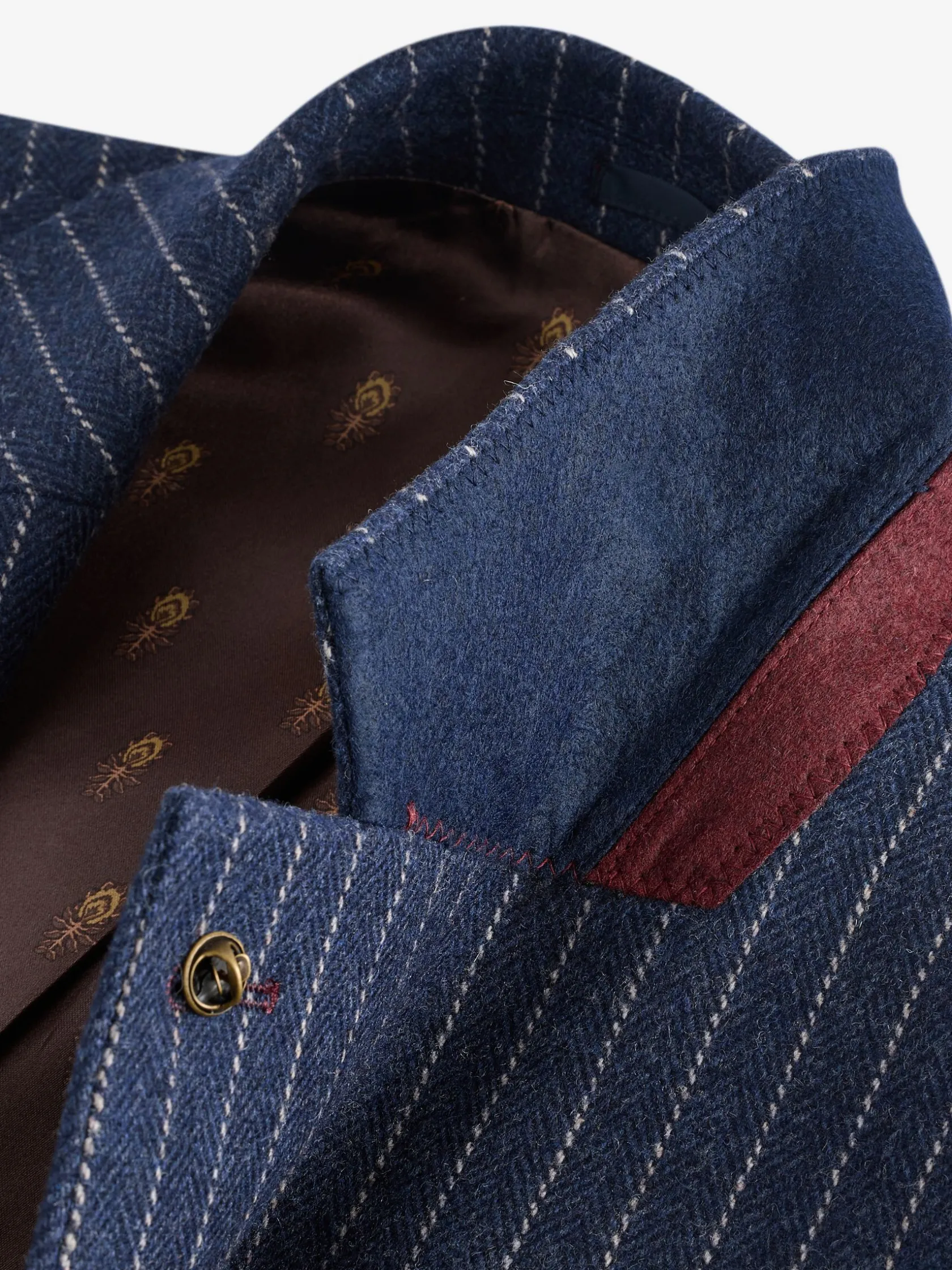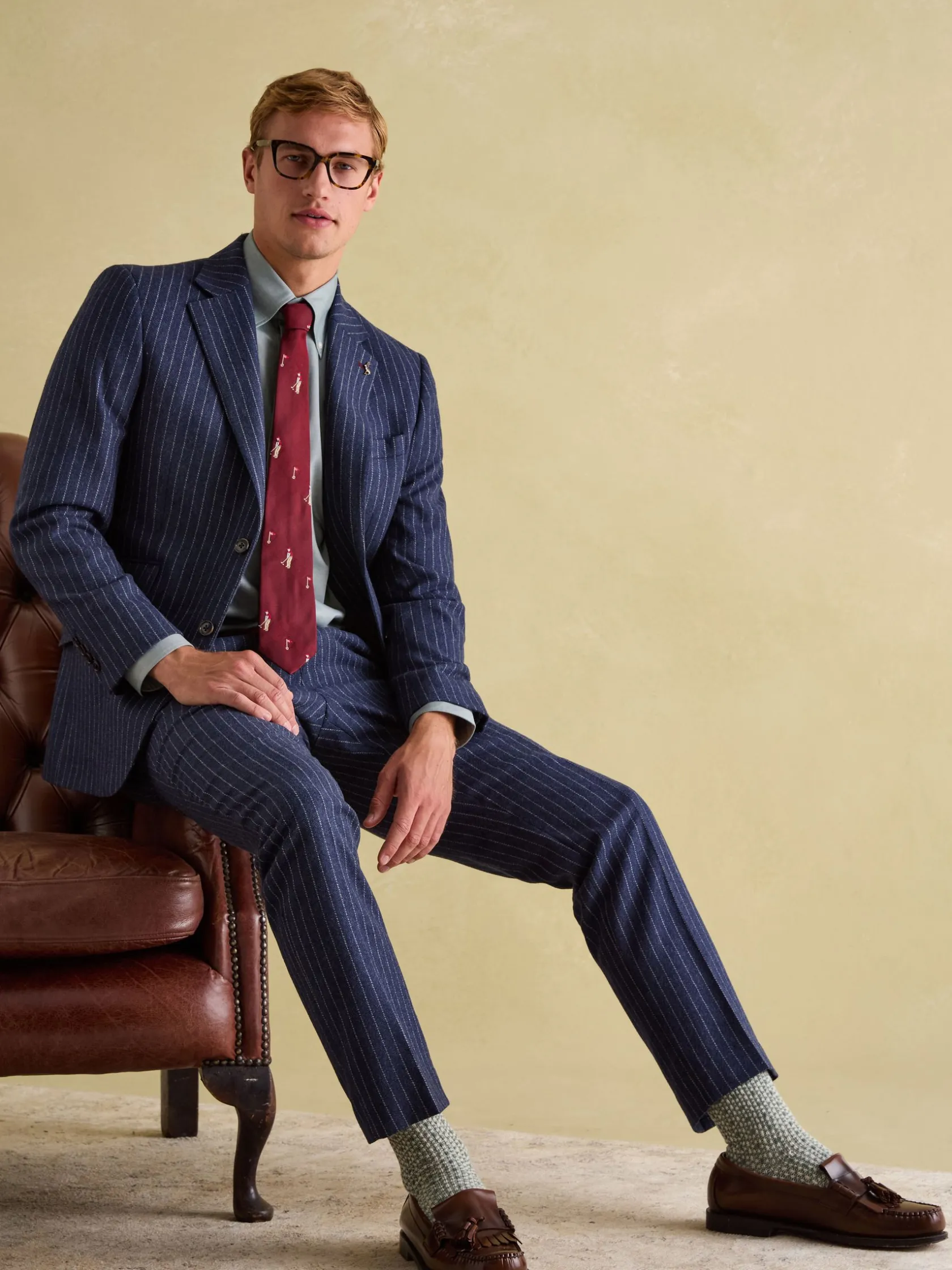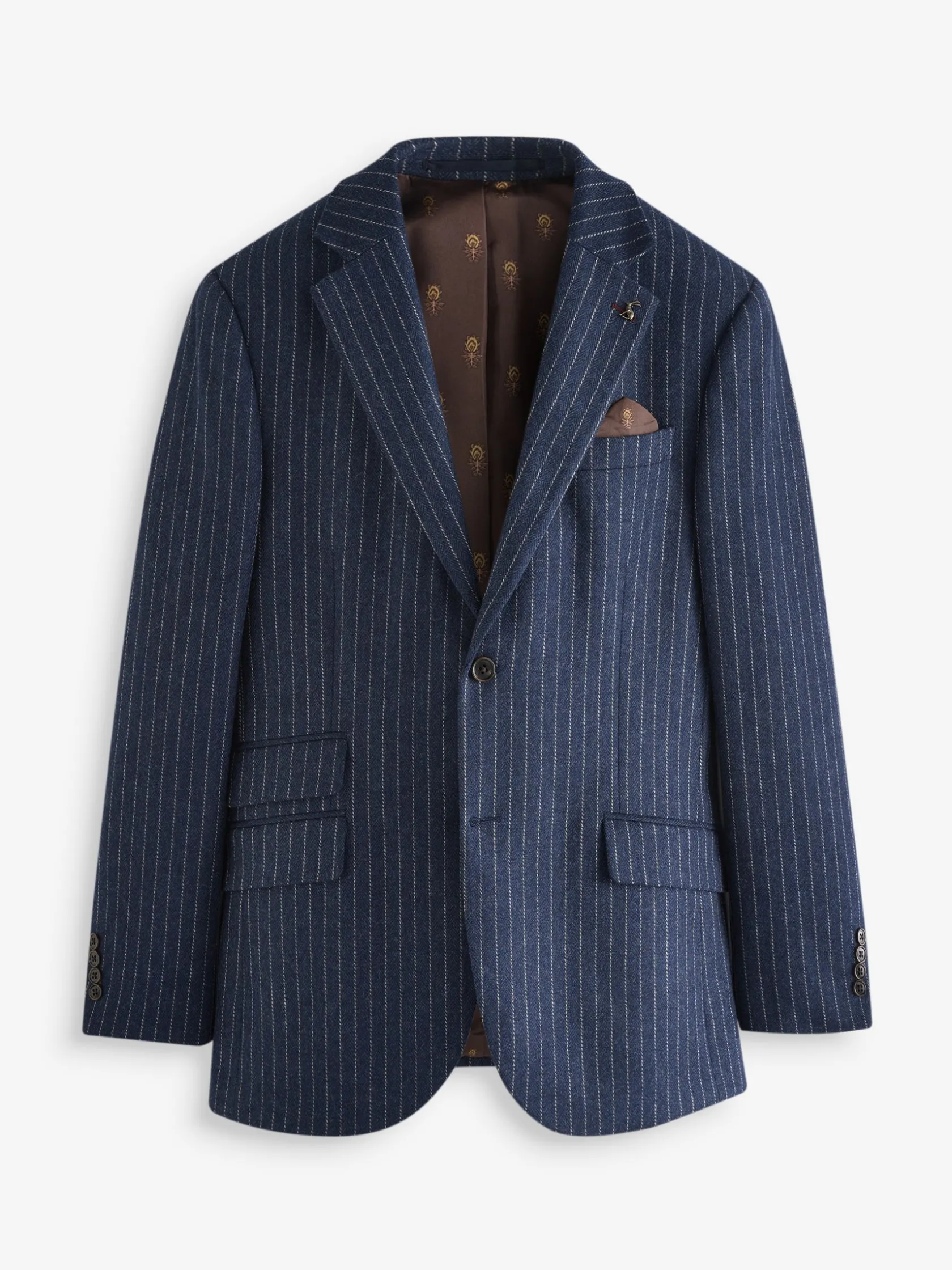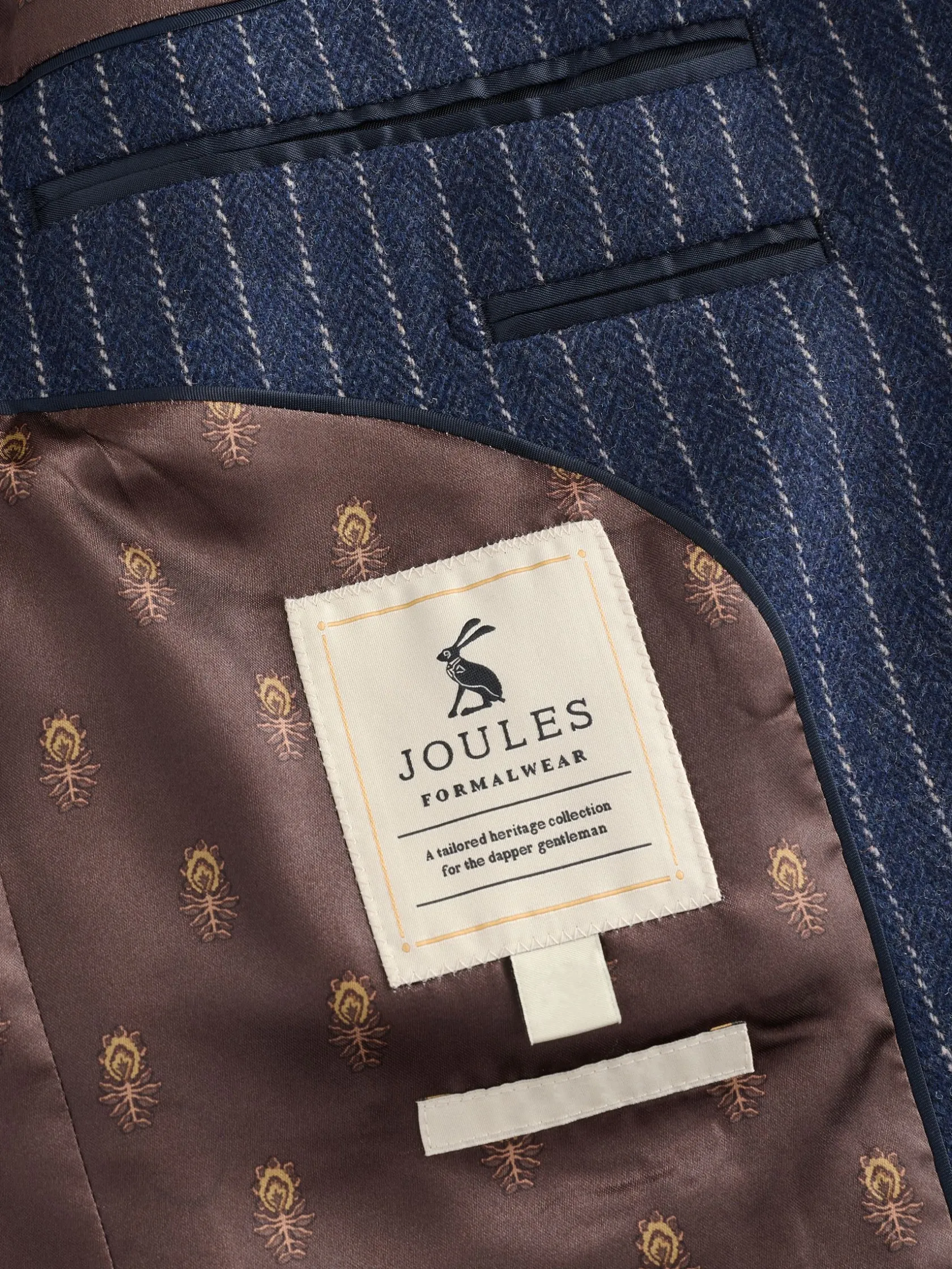 Made popular in the roaring 20s, the striped suit continues to serve serious style and remains a staple choice for men’s formalwear. This suit jacket is made from fine Italian fabric with an enduring quality that will stand the test of time, and is cut to a slim fit guaranteed to make you feel (and look) the part. With a classic single breasted design, a two-button fastening and notch lapel collar, it’s a truly timeless piece. It features kissing buttons to the cuffs, mock pocket detailing to the front and a single chest pocket with a stitched-in satin pocket square. Attention has been paid to the inside too, with a printed satin lining to add a flash of personality and a range of slip-in pockets for stashing your keys, wallet, phone and more. Team it with the matching striped trousers and a shirt to create a full suave look.nn- Slim fitn- Italian striped fabricn- Single breastedn- Notch lapel collar with detachable Joules hare pinn- Printed satin liningn- Two faux horn buttons to the frontn- Kissing buttons to the cuffsn- Single chest pocket with pull-out pocket square (to match the lining)n- Hidden branded detailing under the collar n- Two flap pockets to the front