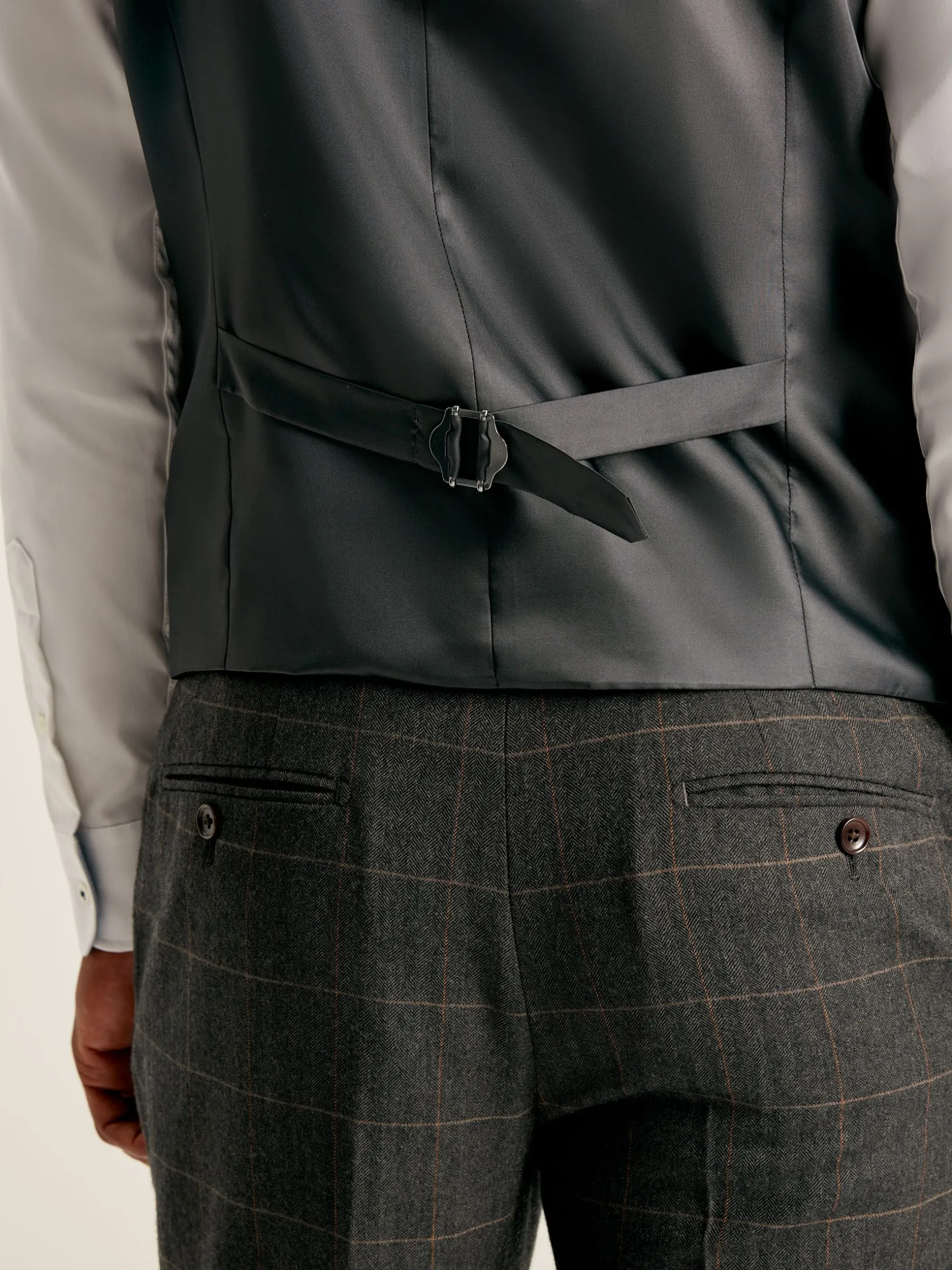 Stand out from the crowd in our heritage inspired windowpane check suit waistcoat. A timeless addition to your wardrobe, this smart waistcoat is crafted from 100% wool woven in Britain and boasts a five button fastening and jetted pockets to the front with an adjustable strap to the back to give you the perfect fit. team with the matching jacket and trousers to elevate the look.nnWoven at Alfred Brown mill in Yorkshire, Great Britain.