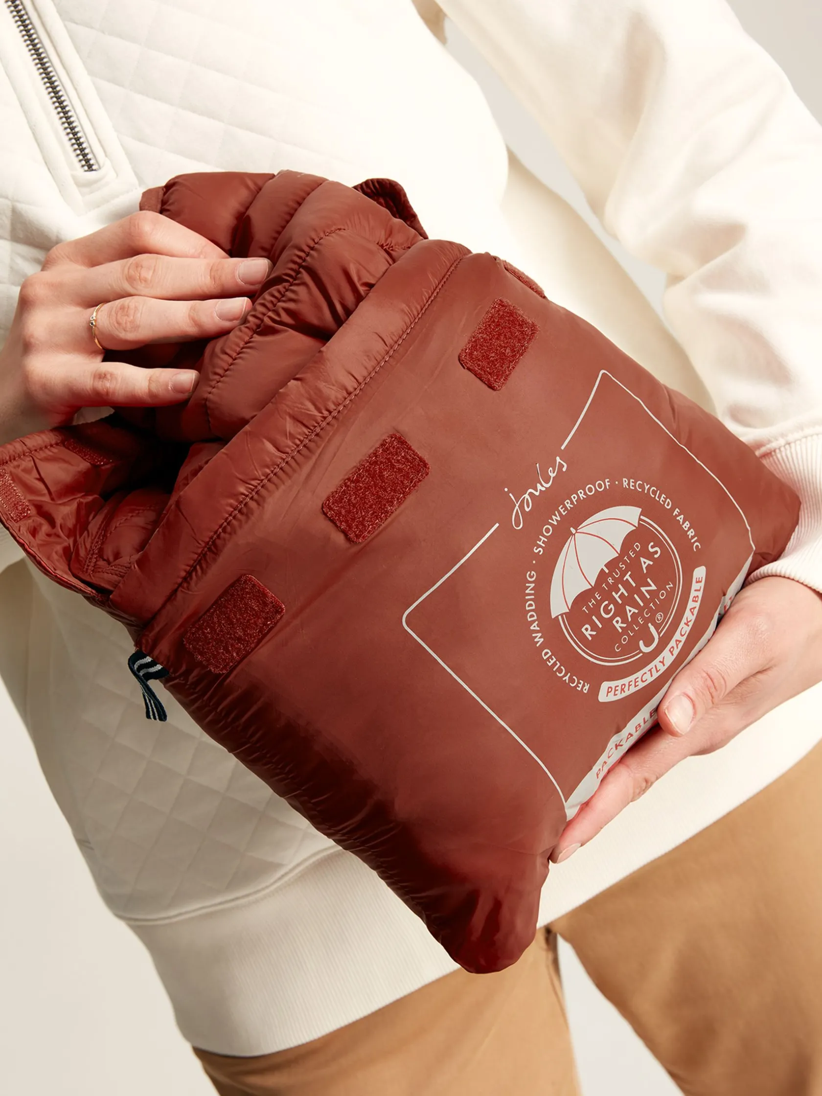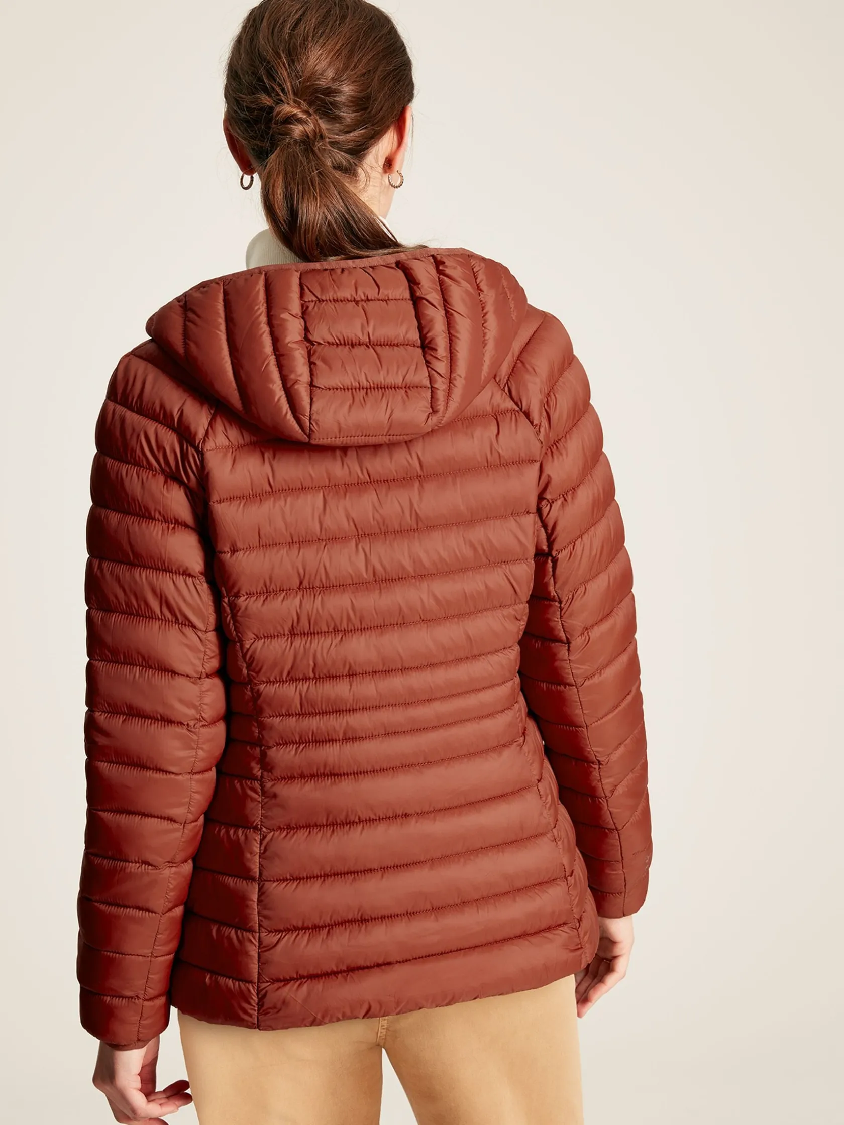 For the unpredictable British weather, you need a jacket that’s predictably reliable. Our Bramley padded jacket is perfect for keeping in the car, as it packs away into its own pocket for an instant layer of warmth whenever you need it. Unlike other bulkier padded jackets, this one has been designed to fit and flatter, with curved seams and thinner baffles to the waist. The fabric has a buttery soft hand-feel and is showerproof, making it ideal for light bursts of rain. You’ll find a contrast lining with a pearlised finish inside, and we’ve added invisible zip pockets into the side seams. Our Joules hare is printed to the bottom hem – a mark of quality you can always trust. Packs away into internal pocket. Showerproof. Hood. Variegated baffles to flatter the waist. Contrast lining. Silicone trims. Buttery soft hand-feel. Joules hare screenprint and logo to the sleeve. Two invisible zip pockets to side seams. Length: 65cm (based on UK size 12).