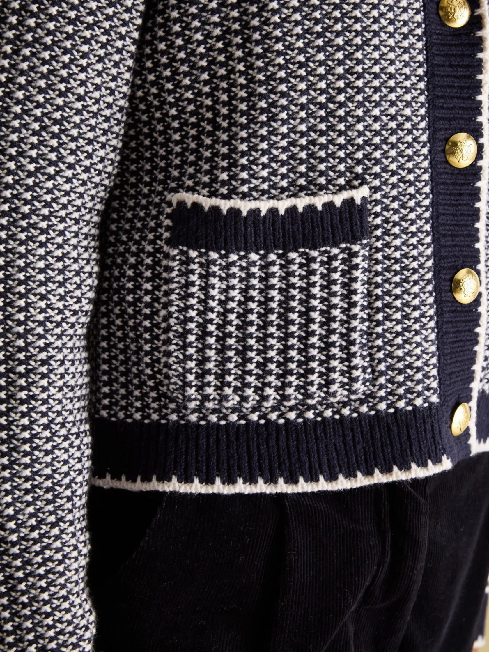 Introducing Bridget – the sophisticated cardigan you’ll reach for all autumn and winter. It has a structured, boxy fit, five metal shank buttons to the front and a round neck. Crafted from an enduring cotton blend and using a textured tweed stitch it’s a true love forever piece. Details such as front pockets and a contrasting cream trim only enhance its appearance. Wear it open over a long-sleeve top for a casual, layered look, or button it up for a more formal finish. Cotton blend. Textured tweed stitch. Structured, boxy fit. Round neck. Metal shank buttons. Two front pockets. Cream coloured hem, cuffs and placket trim.