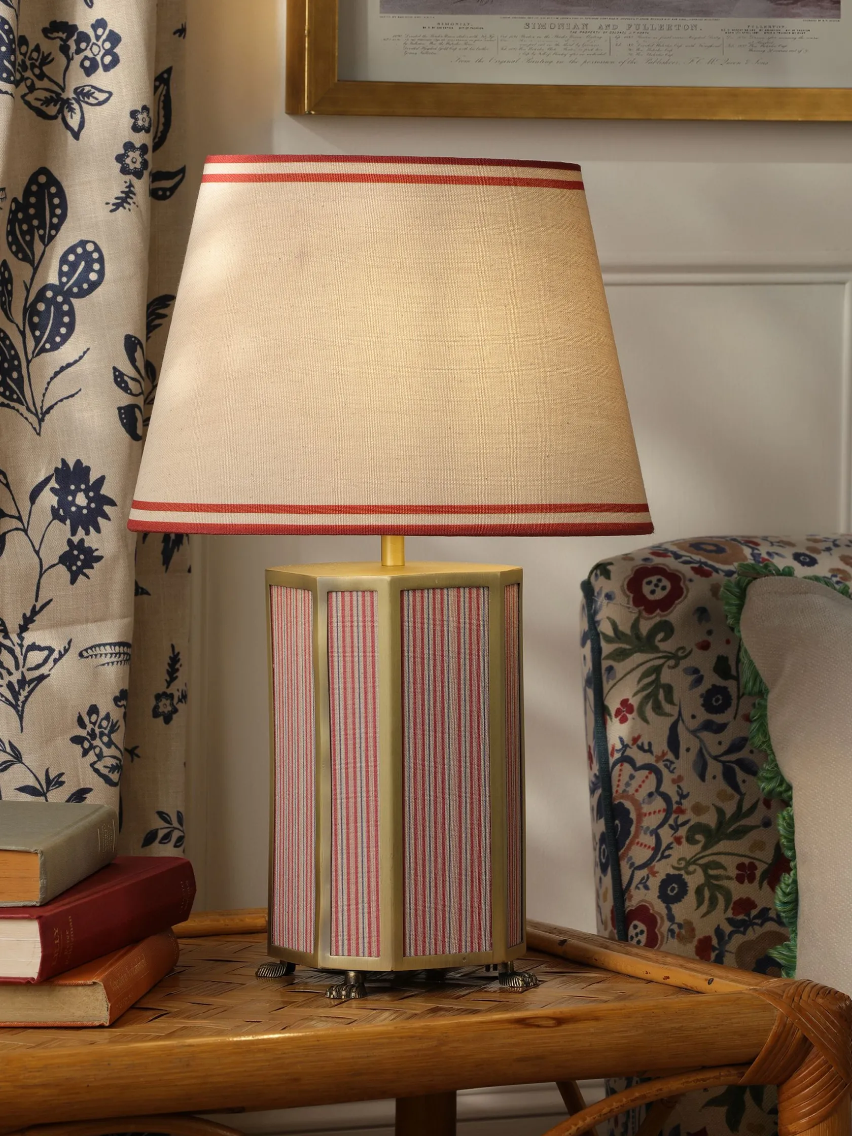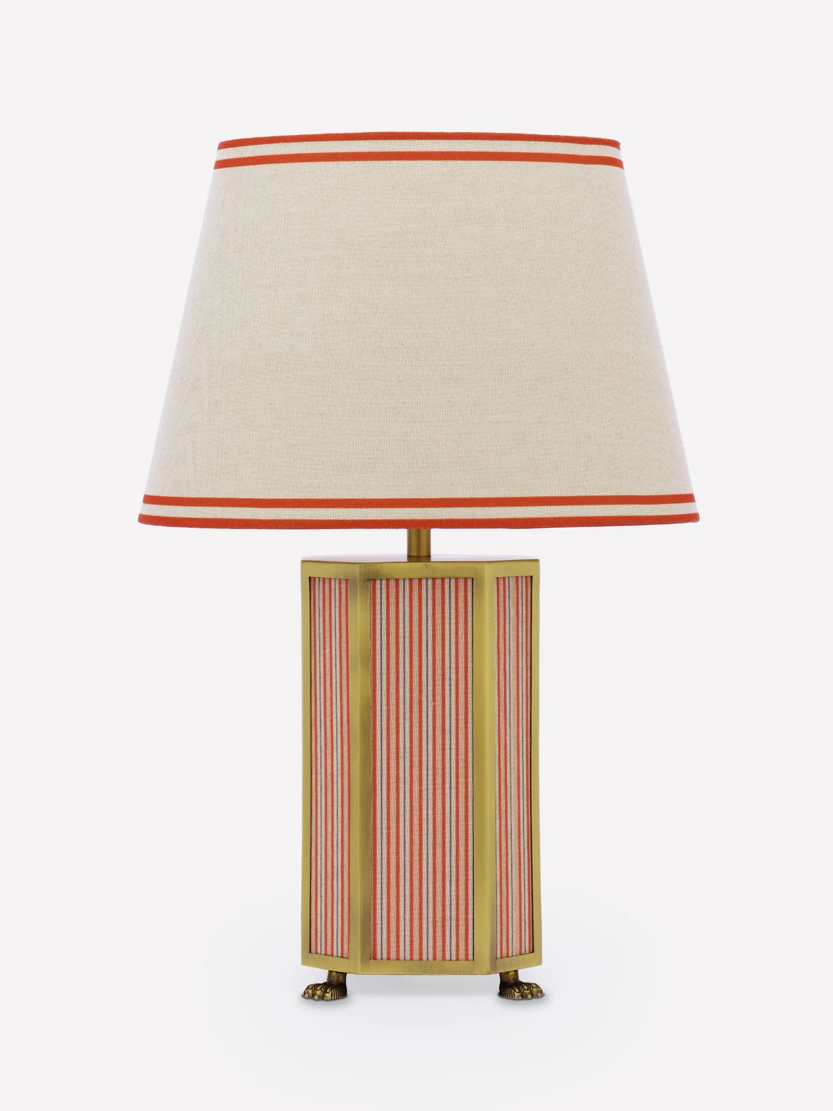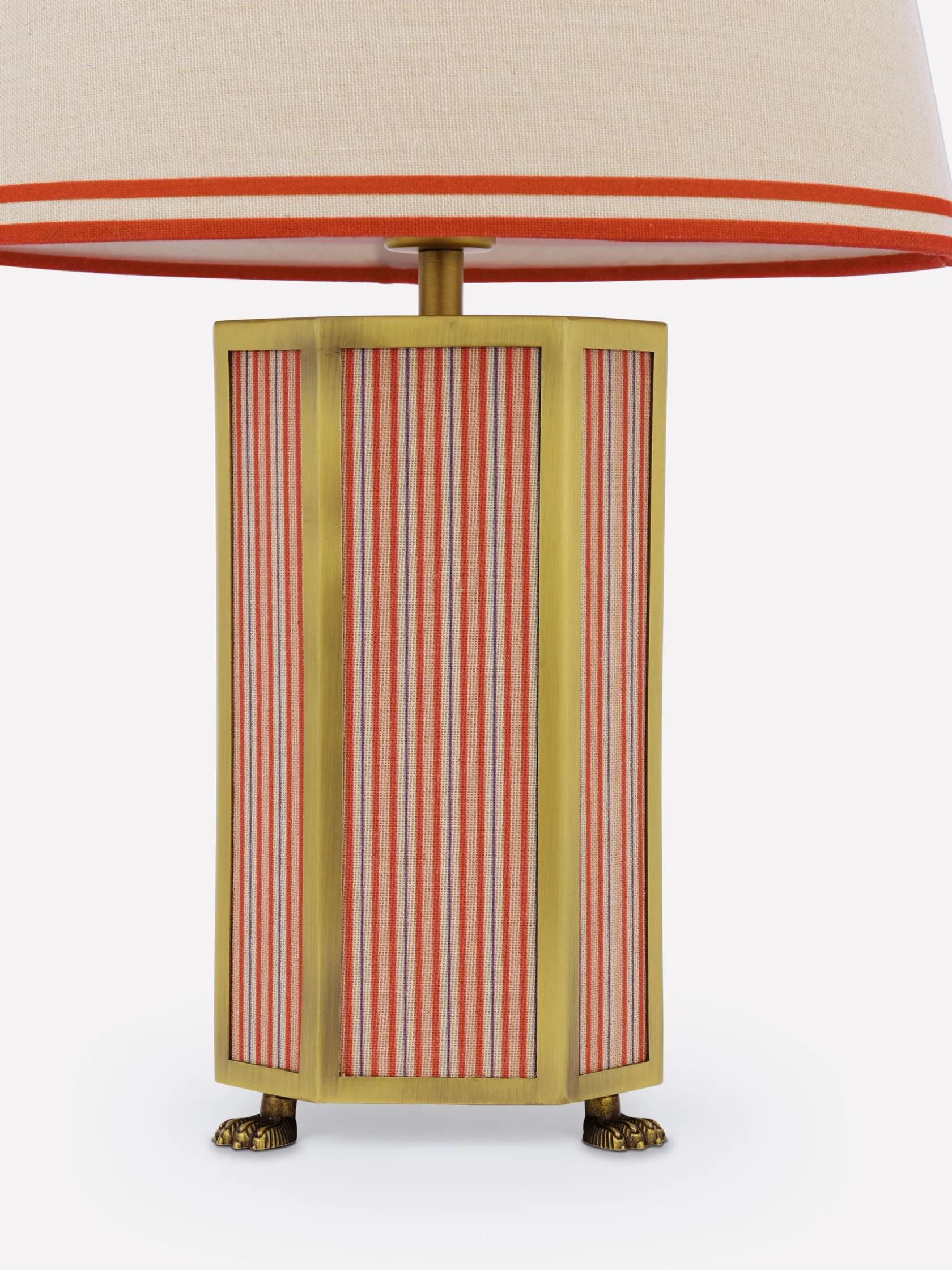 With the Helmingham table lamp creating a welcoming glow to the corners of your home, you’ll never want to turn the ‘big’ lights on again. This ornate piece combines a hexagonal matte antique brass base with striped fabric panelling and a claw foot for an opulent look that commands attention. The lamp shade has a classic tapered shape in a neutral colour and is finished with a coloured border that complements its base. Picture it nestled within a reading corner surrounded by your well-loved book collection.nnTable lampnHexagonal matte antique brass base with striped fabric panellingnClaw foot nTapered lamp shade with border nDi: 280mm x H.440mm