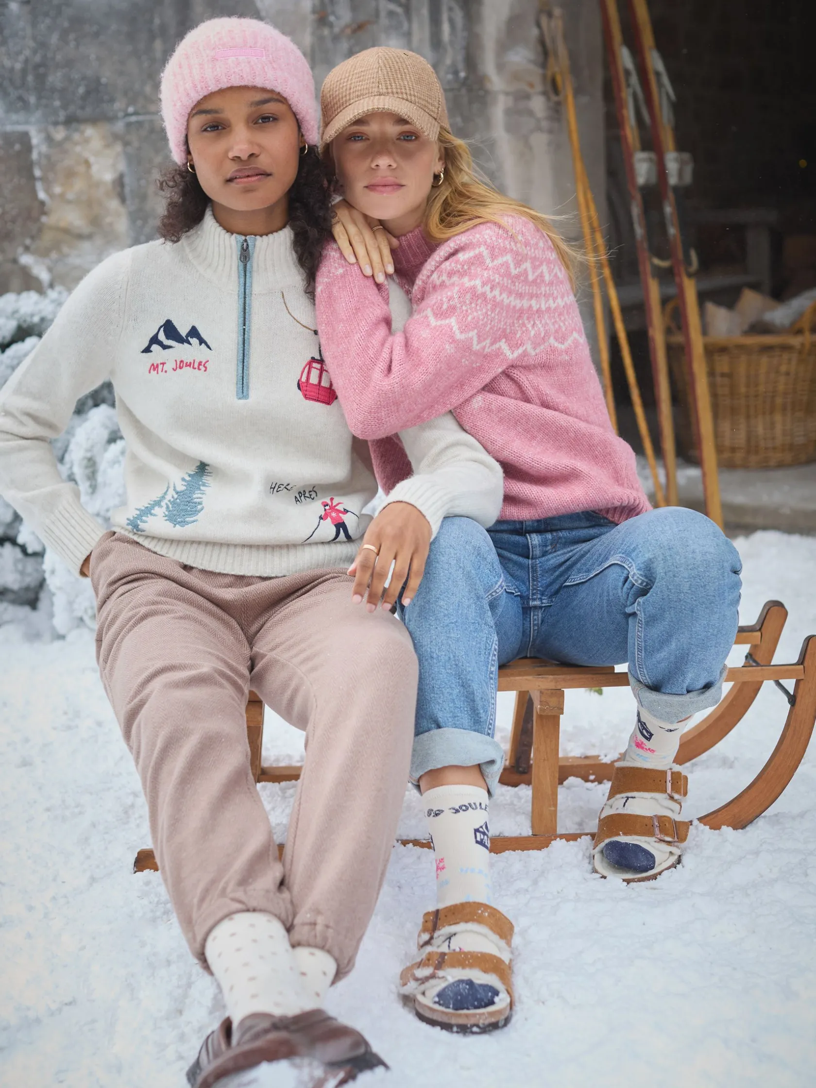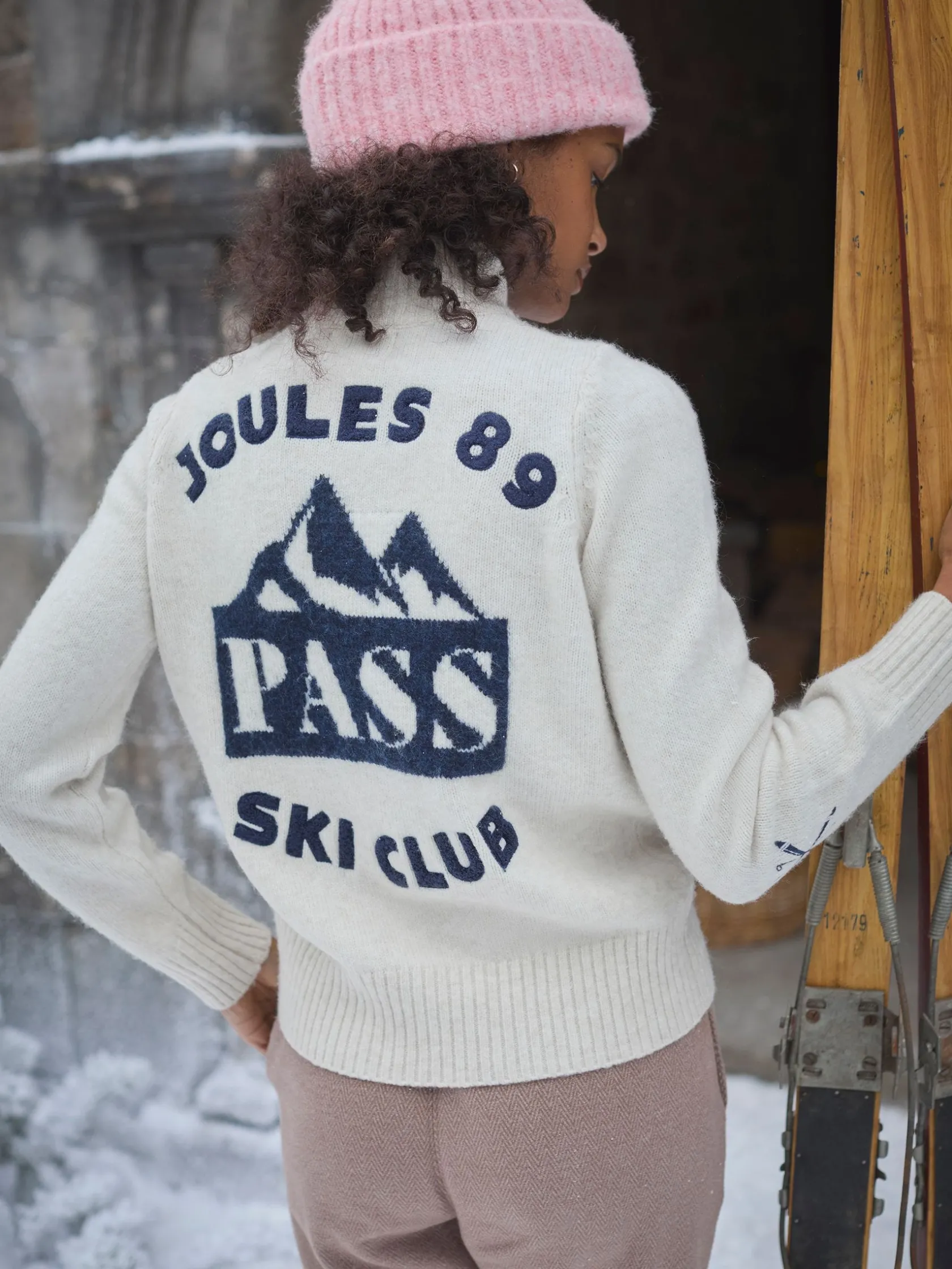Whether you’re hitting the slopes this winter, or just looking for a fun jumper for the season, the Summit will be the peak of your cold-weather wardrobe. It features an assortment of hand-designed ski-themed embroideries and appliques such as a ski-lift, snow-topped mountains and a snow-plowing skiier. The slogan ‘Here for the Après’ adds an element of humour to the piece that is sure to make it a winner. Flip the jumper around for a large-scale ‘Joules Ski Club’ applique on the back. As for the jumper itself, it’s made from a soft wool blend, has a quarter zip fastening, ribbed collar and is finished with ribbed hem and cuffs. Wool blend. Dropped shoulders. Quarter zip fastening. Ribbed collar. Ribbed hem and cuffs. Embroidery and applique details.