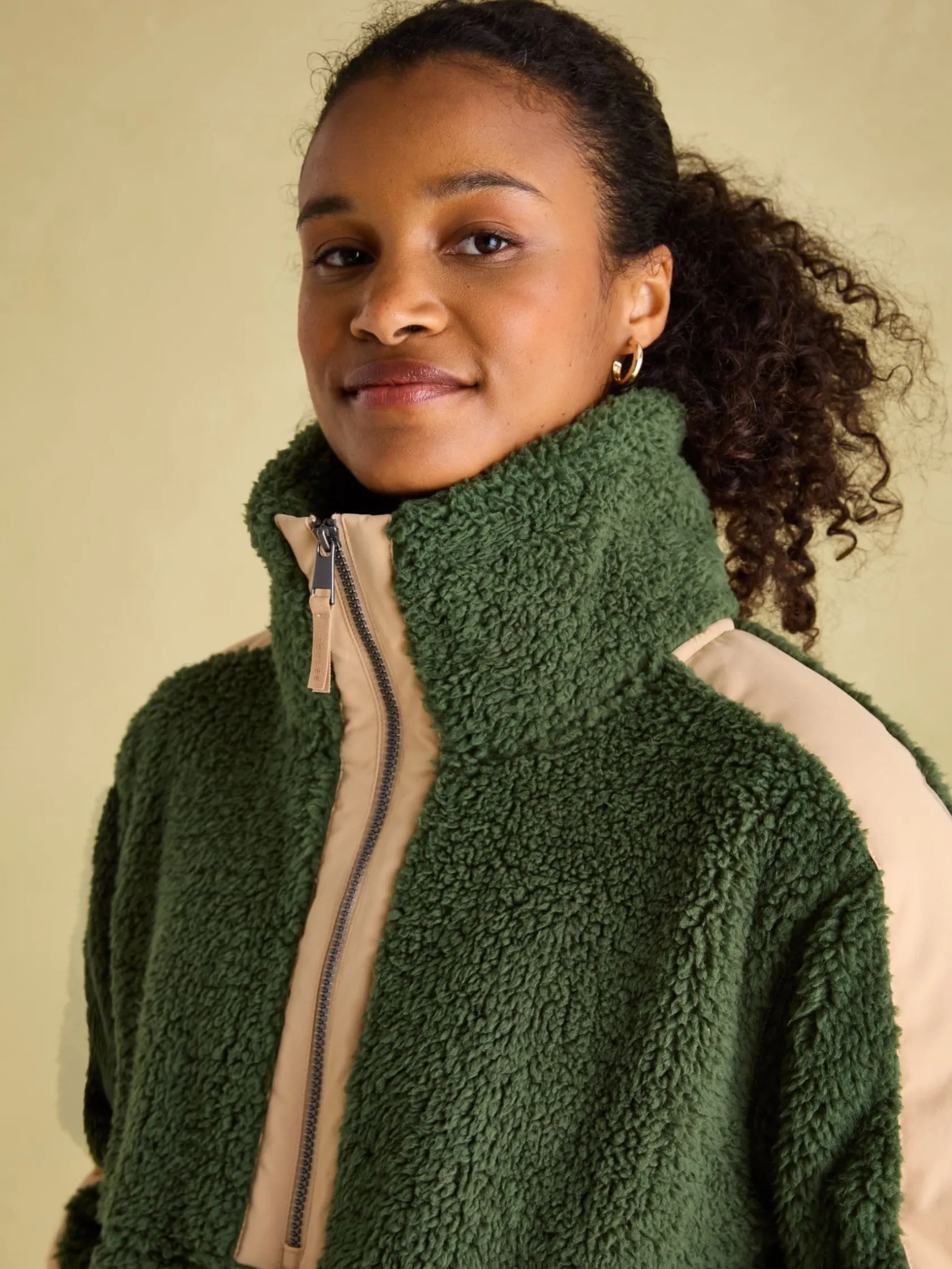Do you remember the Tilly fleece? It was the style from last season that made cold days something to look forward to and nights even more joyful. Well, it’s back and like an old friend, it’s bringing familiar comfort (with a few inevitable changes made along the way). The cloud-like borg fleece fabric was adored by all, so of course that has stayed but it is now complemented by woven panels to the sleeves, pockets and zip placket for a sporty, ‘athleisure’ edge. The contemporary oversized fit, quarter zip fastening and zipped side vents allow you the room to build layers beneath it. And as for the Joules detail to the back neck, well that serves as a nice reminder of your favourite brand. Borg fleece. Relaxed fit. A bestselling style. Dropped shoulders. Half zip fastening. Woven panels to the sleeves, pockets and placket. Zipped side vents. Side pockets. Tonal Joules woven detail under the collar