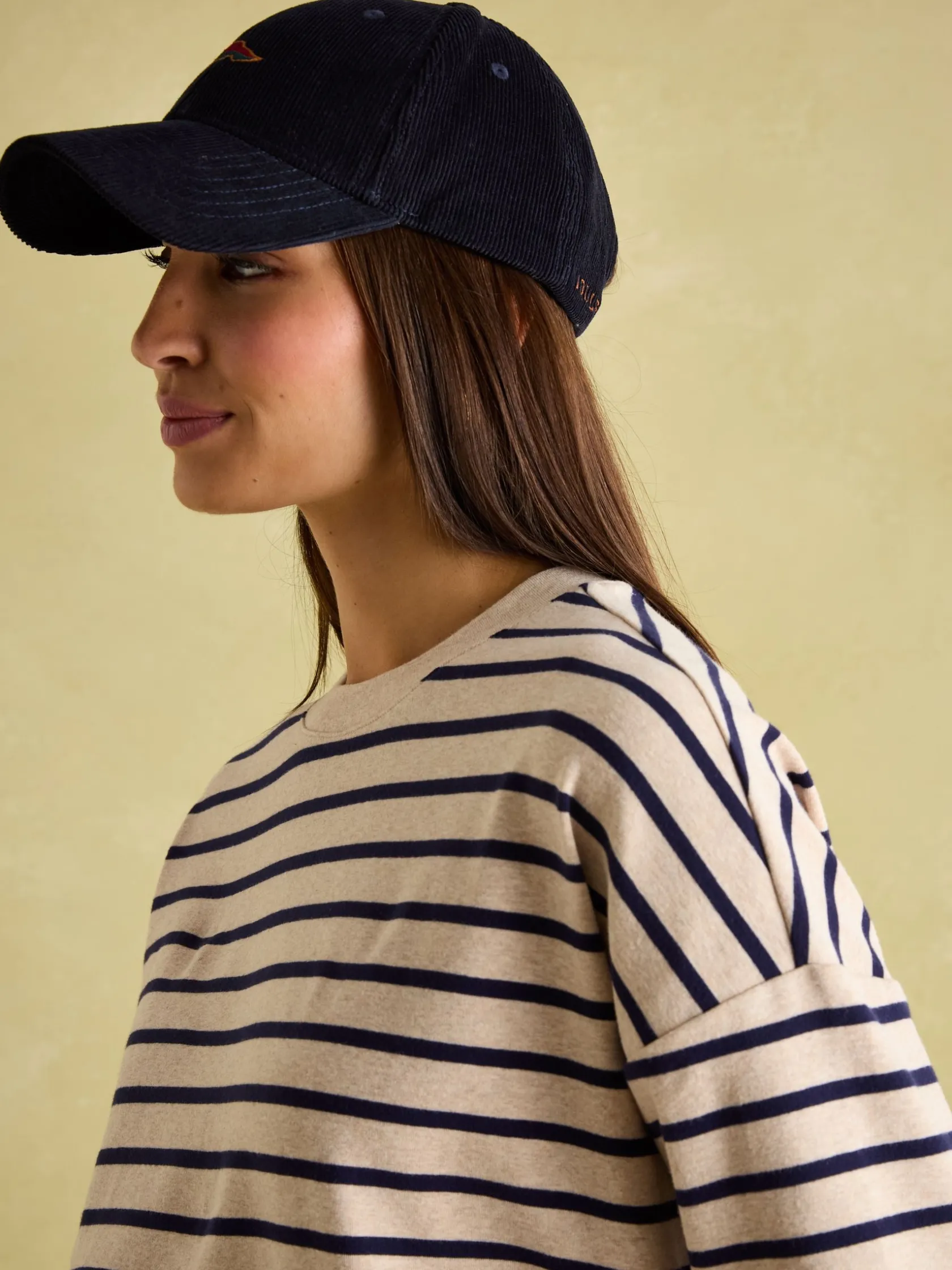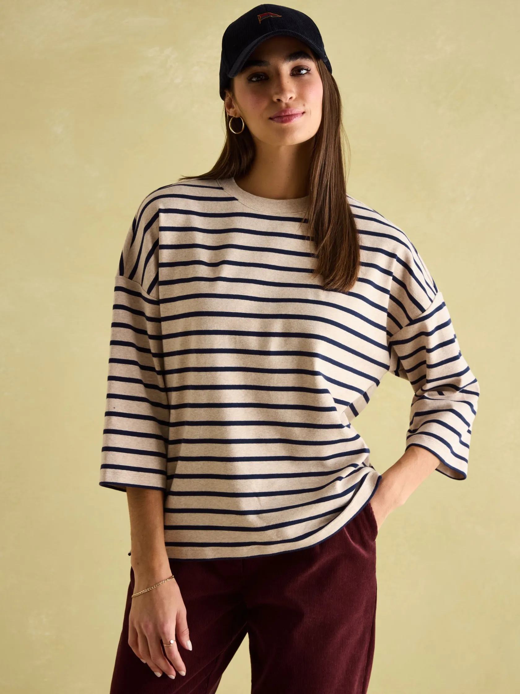 The Amelia top is a style that will look great as part of your time-off wardrobe. It has a relaxed, boxy fit with dropped shoulders and 3/4 length sleeves creating a laid-back silhouette. The quality soft cotton blend will ensure it remains a key part of your looks for years to come, while its round neck makes it easy to layer-up too. Finished with side splits and an adornment of stripes. Cotton blend. Relaxed, boxy fit. 3/4 length sleeves. Round neck. Dropped shoulders. Side splits. Striped.