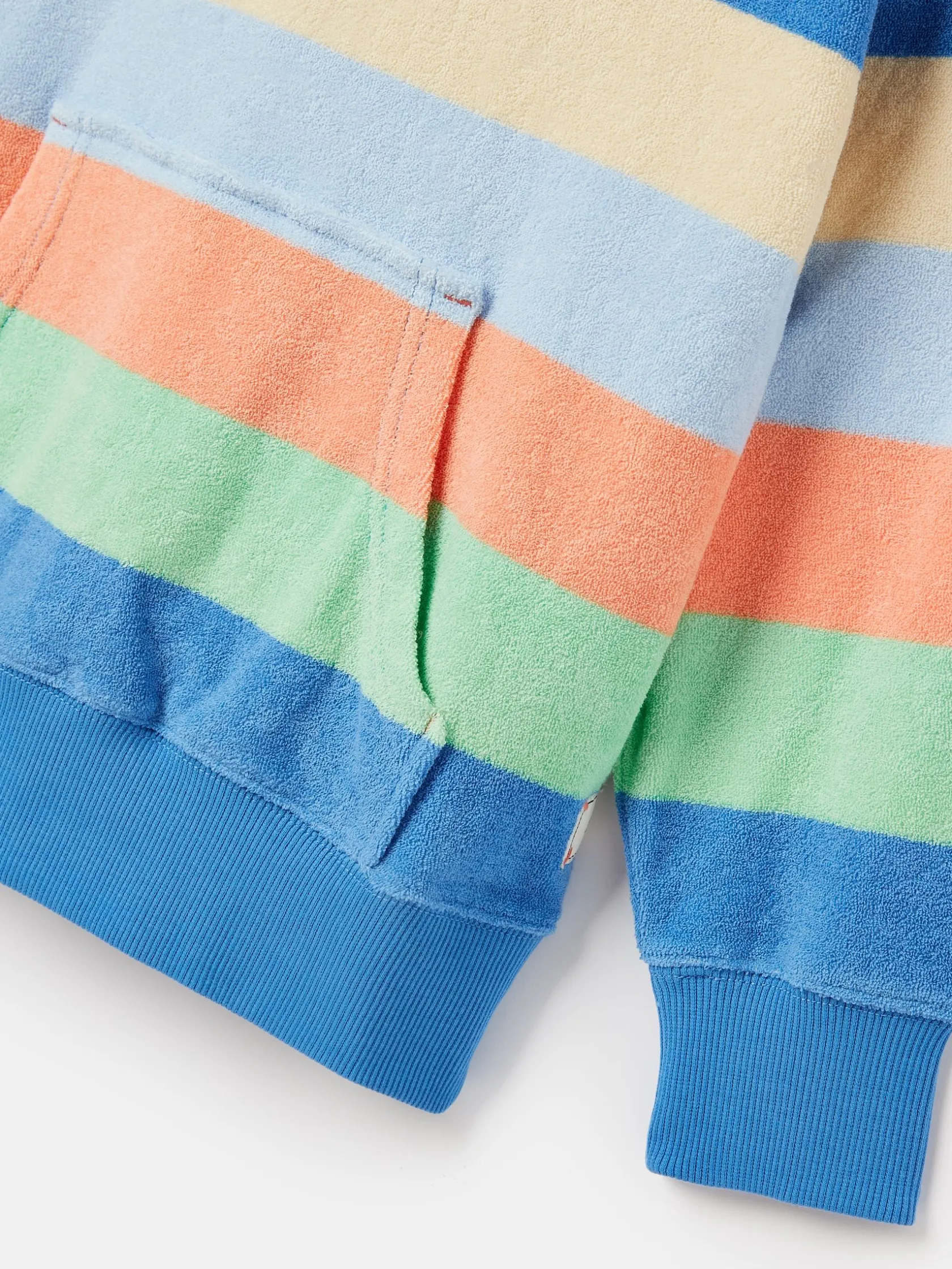 On those summer days when they’re in and out of the water, this absorbent towelling hoodie is a must-have. As well as playing a practical part, it is stylish too thanks to the multi-coloured stripes and laid-back look. It has a hood, kangaroo pocket to the front and deep ribbed hem and cuffs. Why not pair it with the matching towelling shorts too? Cotton. Towelling fabric. Hood. Kangaroo pocket to the front. Deep ribbed hem and cuffs. Striped. Matching shorts available separately.