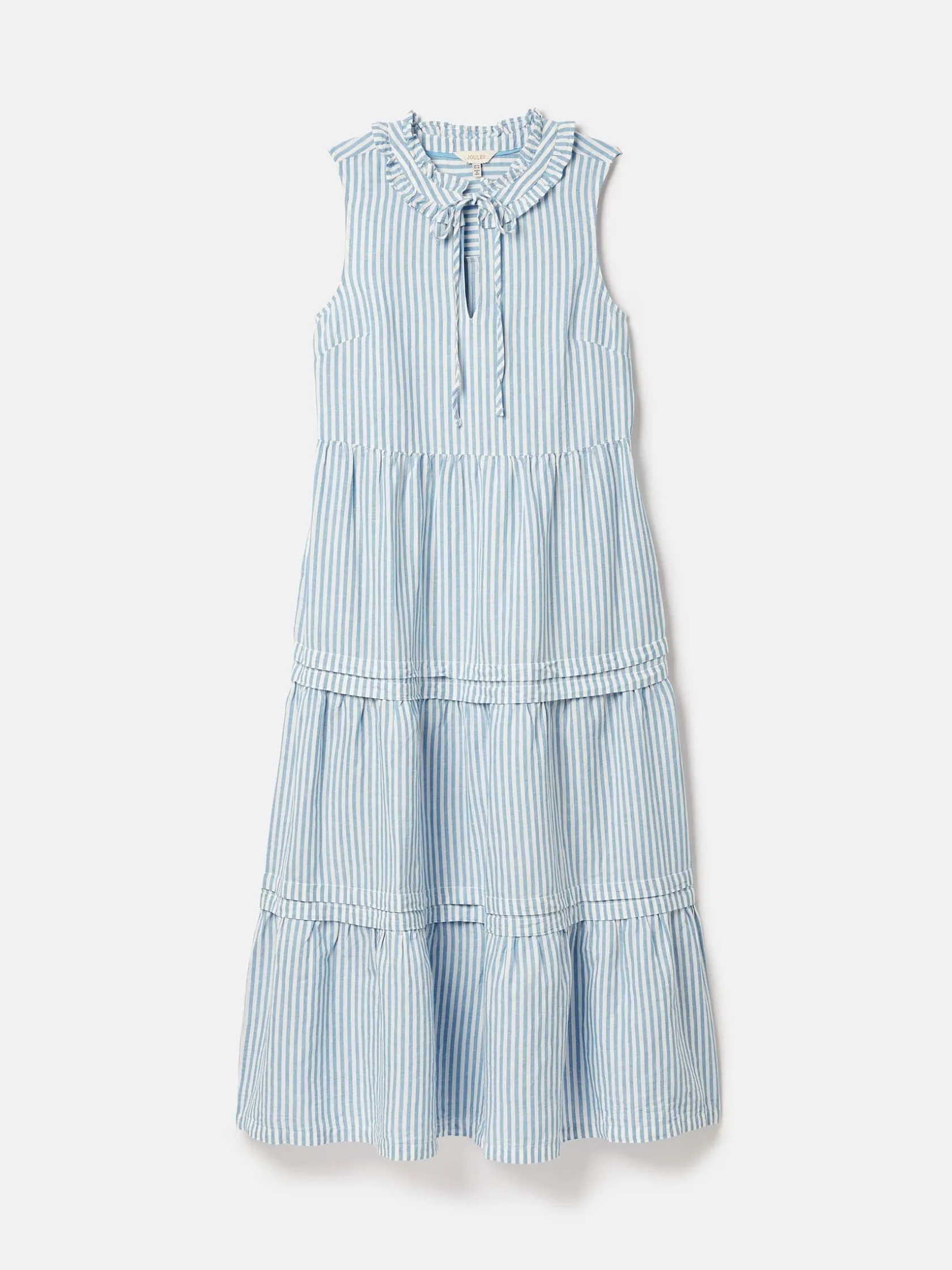 Breeze through the summer in style with the Ophelia dress. The crisp, airey cotton fabric and sleeveless design is perfect for the warmer weather, while the midi length makes it easy to pair with loafers, sandals and even flip flops. It has a tiered skirt with gentle gathering, a gathered waistband and a frilled neck with fabric ties. Pockets in the side seams are a practical addition you’re sure to love. Cotton and linen blend. Midi length. Sleeveless. Tiered skirt with gathers. Gathered waistband. Pockets in the side seams. Ruffle frill neck with fabric ties.