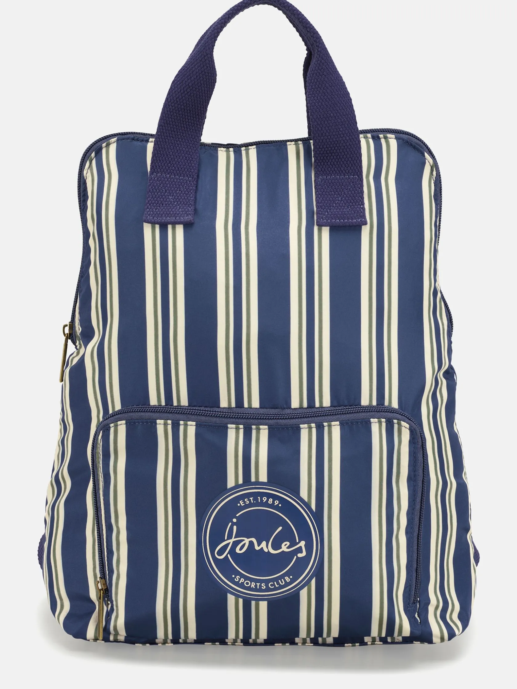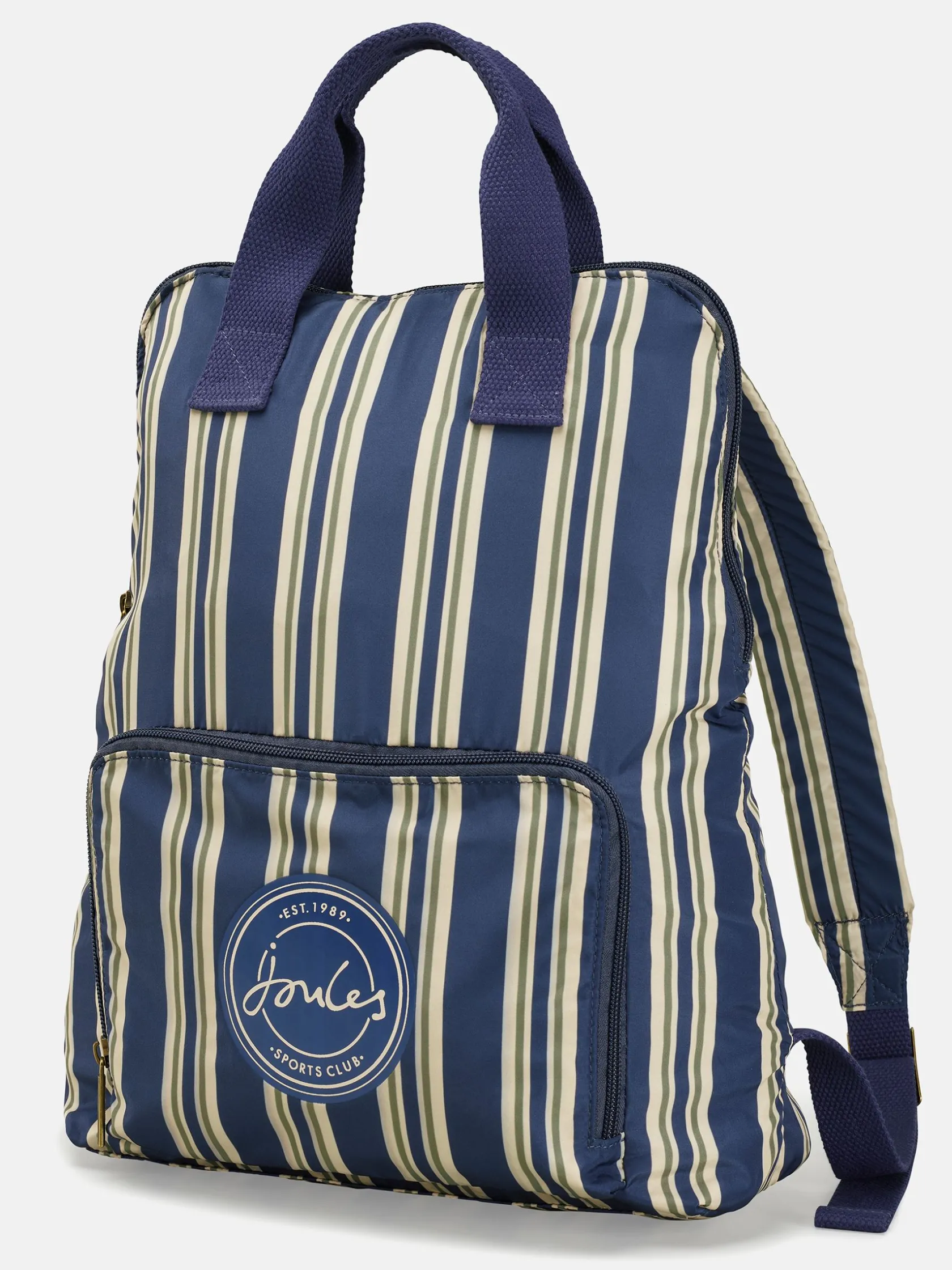 The Joules packable backpack is designed with both functionality and style in mind. It’s lightweight making it perfect for the day-to-day, but is roomy enough to hold essentials for a short trip away too (if you travel light). The striped design and ‘Sports Club’ emblem to the front gives it a preppy look while remaining timeless through the navy, green and cream colour palette. Its packable function means it won’t take up space when it’s unused and can go anywhere with you. The backpack features a main zipped compartment with an additional front pocket (which it packs away into) which are secured with zip fastenings. Two handles are fixed to the top of the bag with adjustable padded shoulder straps offering a more traditional way to wear it. Pick up the matching packable duffle bag for a complete look. 36 x 27 x 10cm. Packable function. Fixed carry handles to the top. Adjustable padded shoulder straps. Zipped main compartment. Zipped front pocket. Additional zipped back pocket. Joules Sports Club emblem to the front