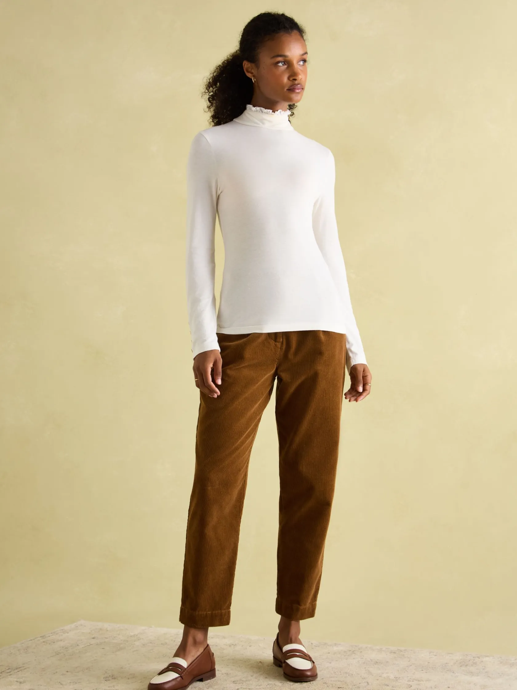 With a slim fit that hugs the body, the Amy jersey roll neck is the perfect base layer to build your outfits around. But it’s certainly not without its details. The long sleeves feature five gold metal accent buttons and the neck is trimmed with a woven frill – we think it’ll look quite the part popped out of a knit. Add one (or a few) of these beyond basics to your wardrobe and you’ll forever have a favourite. Jersey. Slim fit. Long sleeves. Roll neck. Woven frill neck. Five gold metal buttons on the cuffs.