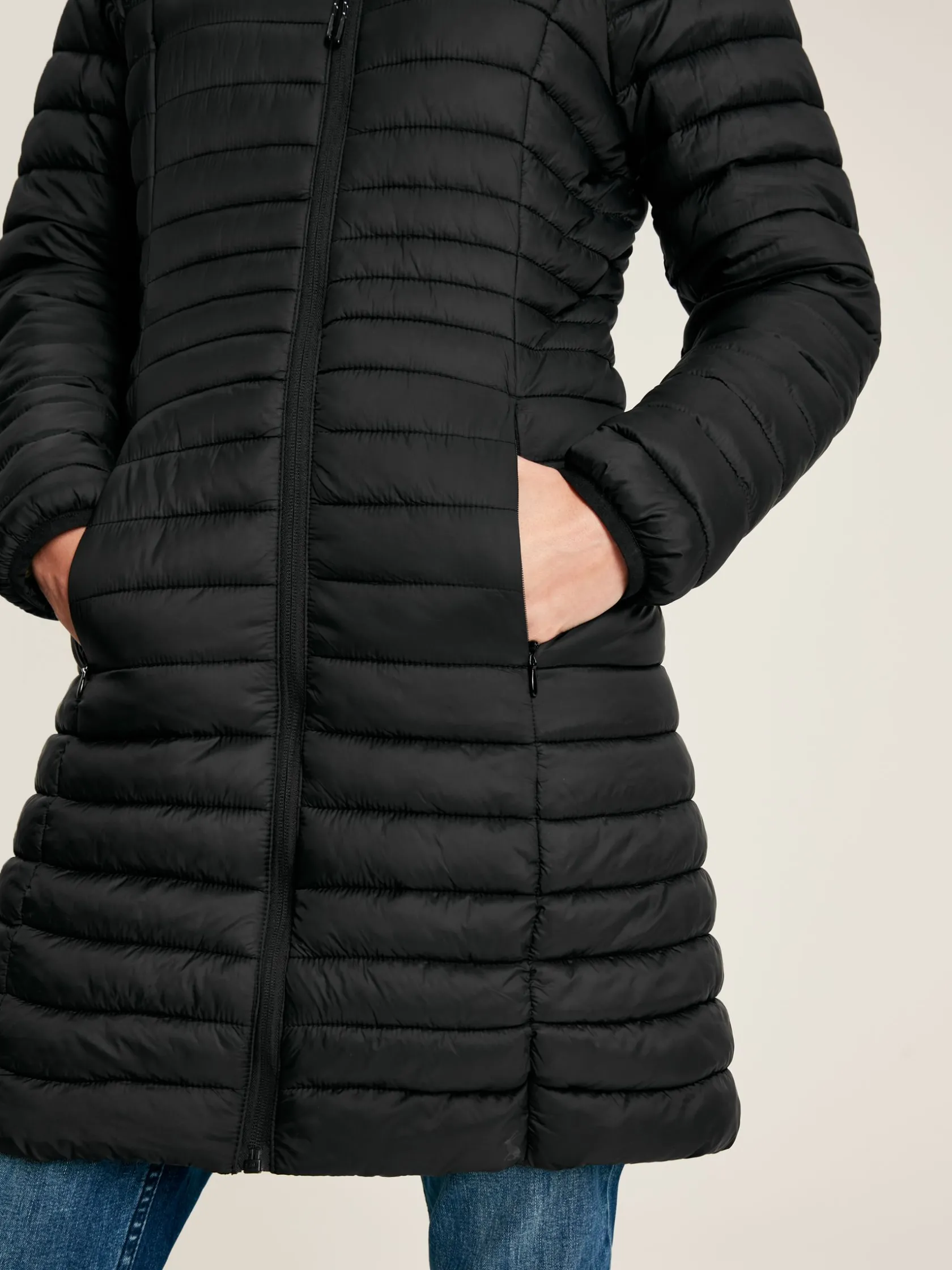 For the unpredictable British weather, you need a jacket that’s predictably reliable. Our longer-style Bramley puffer jacket is perfect for keeping in the car when journeying to your next outdoor adventure, as it packs away into its own pocket for an instant layer of warmth whenever you need it. Unlike other bulkier padded jackets, this one has been designed to fit and flatter, with curved seams and thinner baffles to the waist. The fabric has a buttery soft hand-feel and is showerproof, making it ideal for light bursts of rain. You’ll find a contrast lining with a pearlised finish inside, and we’ve added invisible zip pockets into the side seams. Our Joules hare is printed to the bottom hem – a mark of quality you can always trust. Packs away into internal pocket. Longline. Hood. Showerproof. Variagated baffles to flatter the waist. Contrast lining. Silicone trims. Buttery hand-feel. Two invisible zip pockets to side seams. Length: 92cm (based on UK size 12).