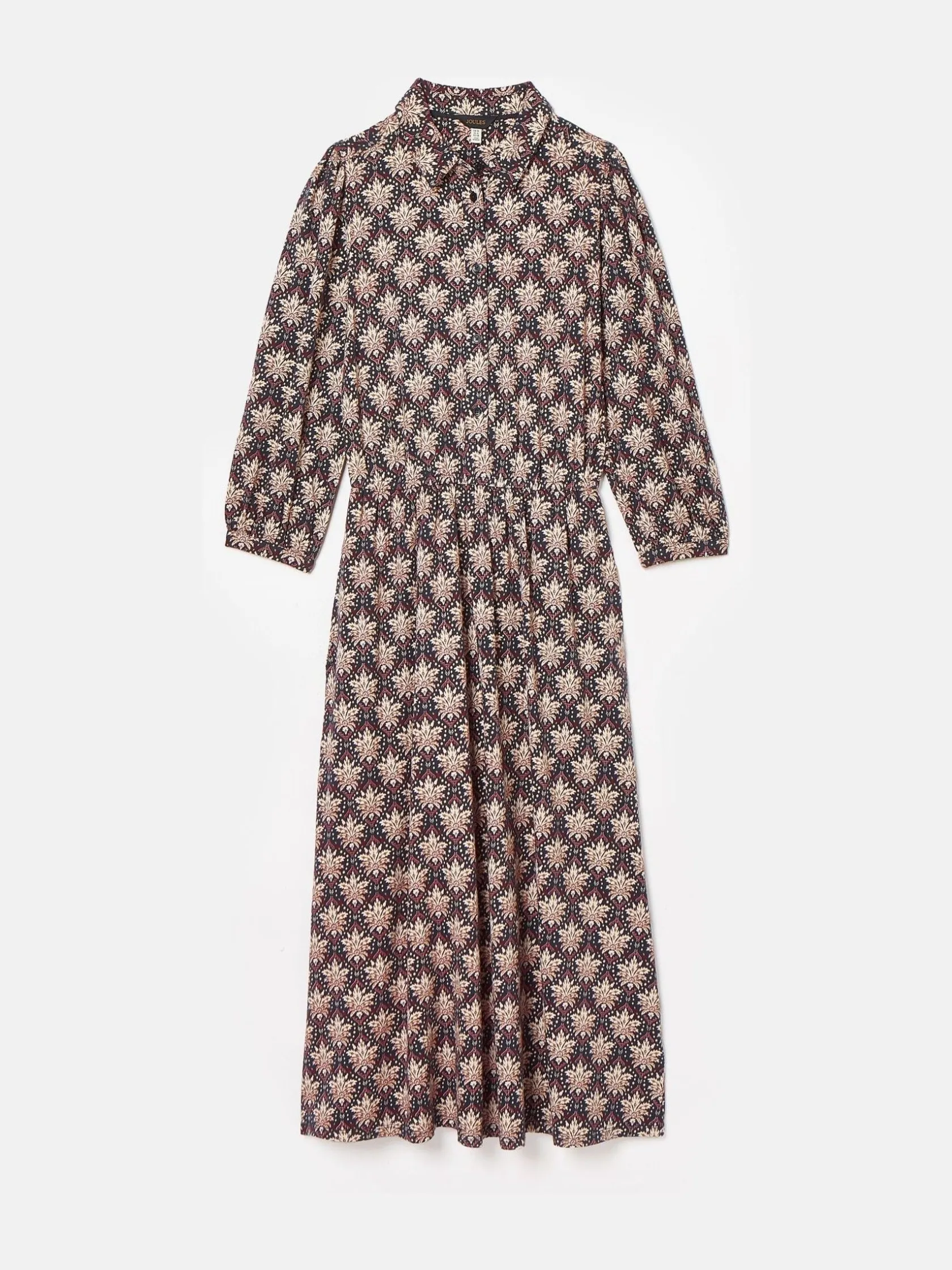 Easy-to-wear while remaining elegant and stylish, the Hazel dress is perfect for the autumn and winter season. It features a unique hand-drawn print and uses an opulent colour palette. The cotton jersey fabric makes it beautifully soft, while the midi length allows you to pair it with all kinds of footwear. A shirred waistband gives it a flattering cinch at the waist and a button placket lends itself to layering in the colder weather. Finished with pockets in the side seams! Cotton jersey blend. Midi length. Long sleeves with gathered shoulders. Button placket. Collar. Shirred waistband. Pockets in the side seams.
