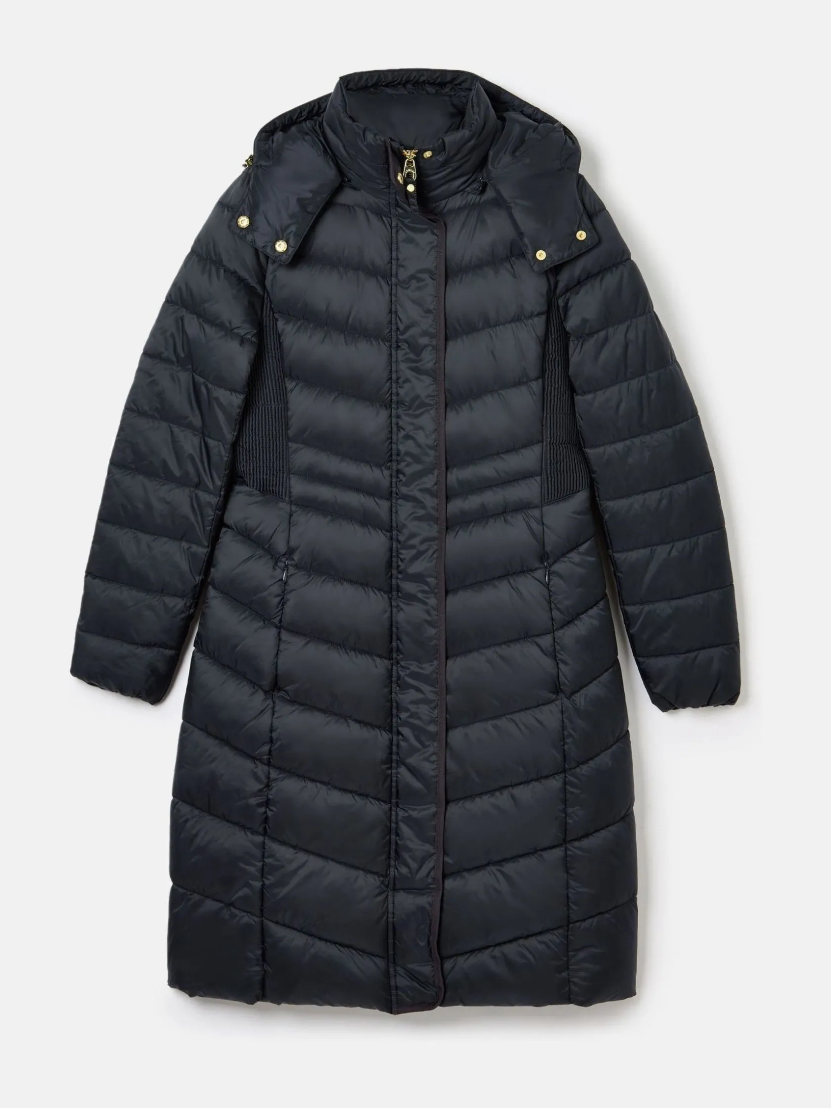 It’s just not winter without our Pembury coat – so it’s back to warm up your outdoor attire. Cut to a longline length for all-over warmth, it’s a true cold-weather wonder. Our designers have cleverly added shirred side panels, slimmer chevron baffles to the waist and curved seams to the centre to balance out its shape for a more flattering fit. The fabric has a soft-to-touch pearlised finish that’s also showerproof, making it perfect for light bursts of rain, and the hood is detachable so you can decide your level of protection before you head out. The high neck and chin guard with popper fastenings also add an additional touch of coverage to hide behind when the wind starts to whistle on through. You’ll find two invisible zip pockets to each side too. Longline. Showerproof. Padded with chevron quilting and variegated baffles to the waist. Shirred side panels. Detachable hood with zip and internal waist adjusters. Pearlised fabric finish. Printed lining. Zip and popper fastening. Two hidden zip side pockets. Length: 103cm (based on UK size 12)