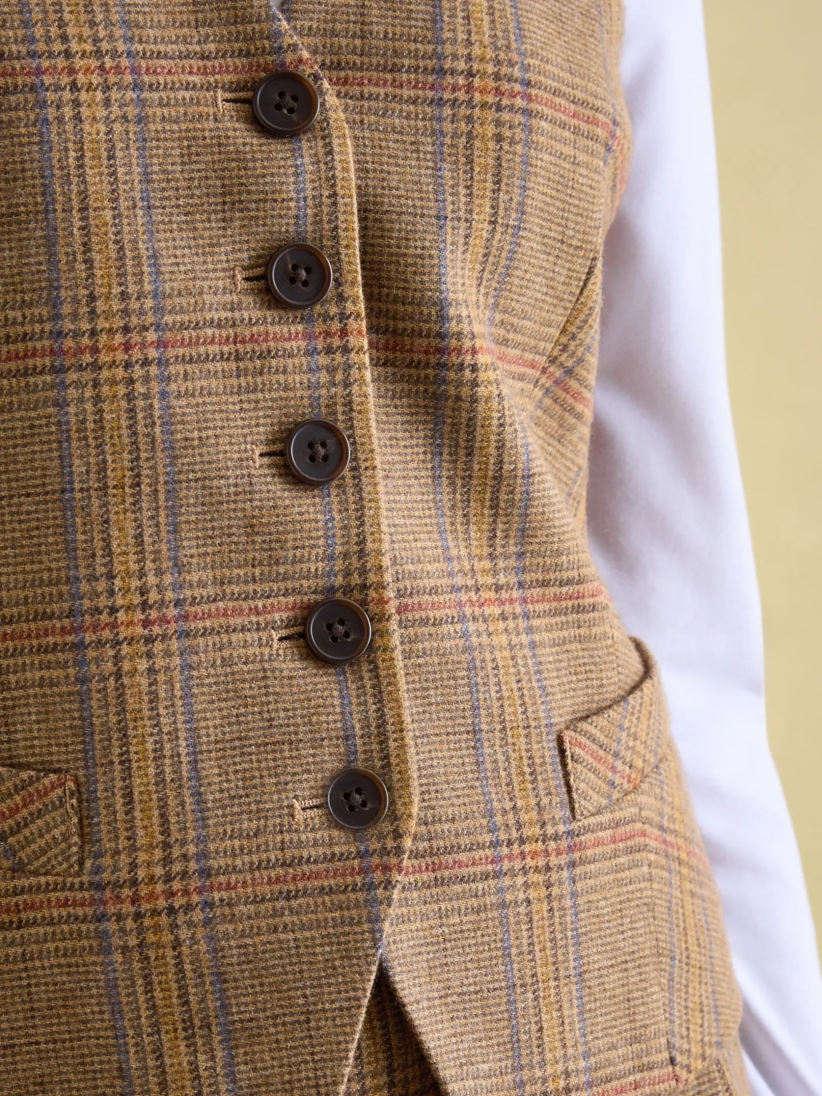 With the Penrose waistcoat, well-dressed style is easy to achieve. Made from a wool blend and using a unique-to-Joules tweed you won’t find anywhere else, this is a piece of enduring quality and distinctive style. Darts to the front of the waistcoat and a row of five faux horn buttons gives it a structured fit, while three welt pockets are a classic touch. On the inside a printed satin lining elevates it further and stands as a nod to our heritage. Wear it over a ruffle blouse or team it back with the matching suit trousers and blazer. Wool blend. Unique-to-Joules tweed. Single breasted. Five faux horn button fastenings to the front. Darts to the front for a structured shape. Three welt pockets to the front. Printed satin lining.