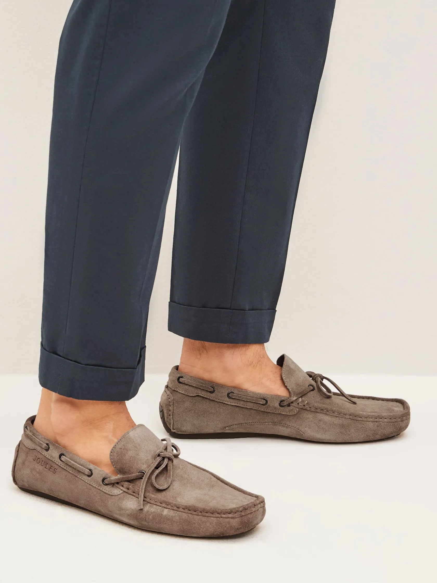 Whether worn with or without socks, the classic Driver shoe remains king of the moccasins, with a versatile slip-on design that looks fantastic with chinos, linen trousers, denim jeans and shorts. Upgrade your casual look with a hint of heritage.nnA soft premium suede upper gives the Driver shoes a timeless feel, boasting a square moccasin toe, a lace-up fastening and lace detailing to the side, decorated with an embossed Joules logo to the side of the heel. The leather and textile lining ensures comfortable wear, with an Ortholite footbed for cushioning with every step. A slimline outsole has a grippy tread, for lightweight traction.