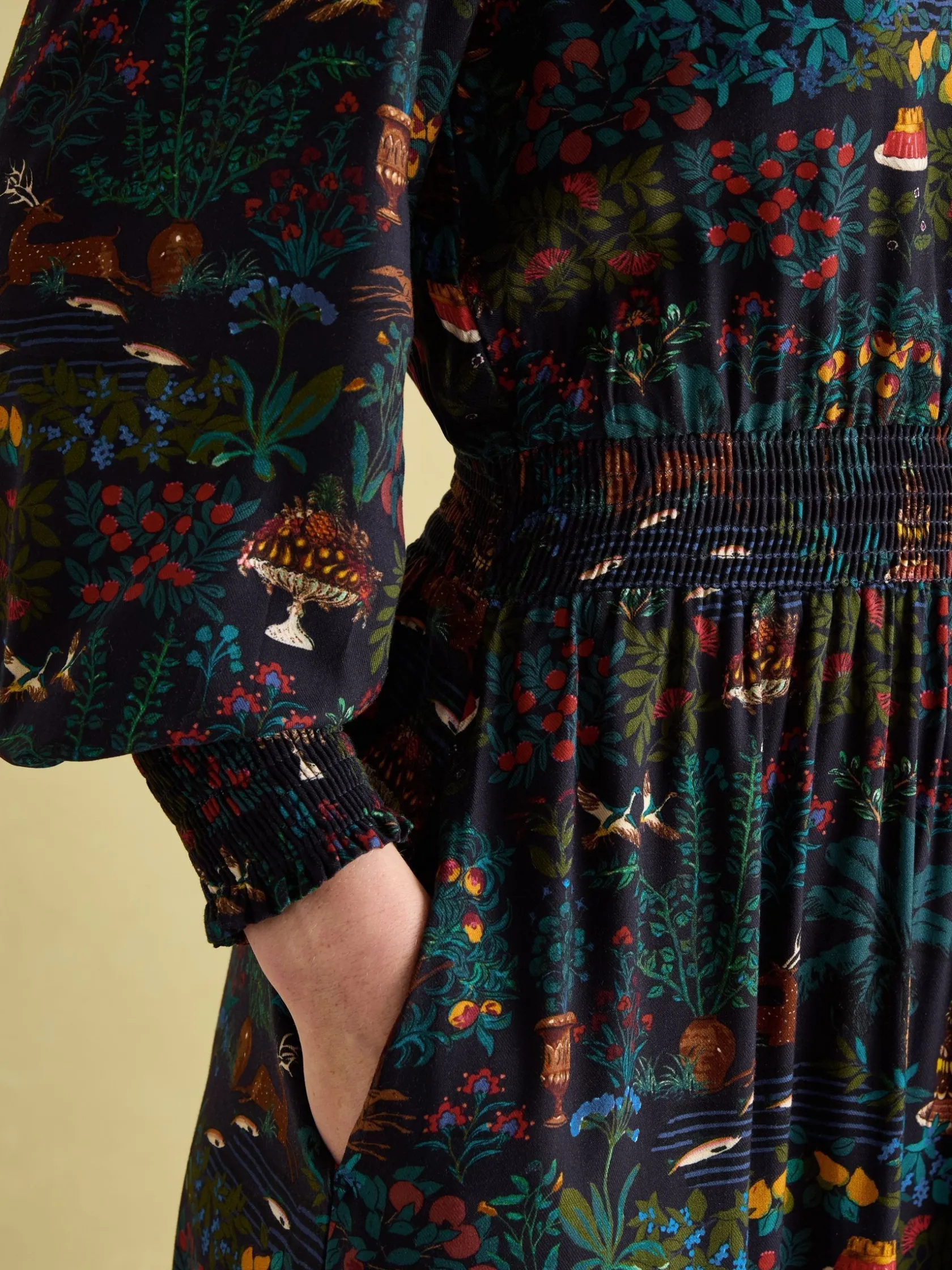 Pull out all the stops this season with the Georgina dress. Easy to dress up for parties and occasions, or dress down for the day-to-day, it’s the versatile piece your wardrobe needs. A round high neck, long sleeves with gathered shoulders and a maxi length work together to create a truly elegant silhouette you’ll never tire of wearing. Other elevating details include buttons to the bodice, shirred cuffs and waist for a flattering cinch and pockets in the side seams. An elaborate hand-drawn print adorns it which has been designed by our in-house print team, which means you won’t find it anywhere else. Maxi length. Long sleeves with gathered shoulders. Shirred cuffs. Shirred waistband. Round neck. Four fabric-covered buttons. Pockets in the side seams. Hand-drawn print.