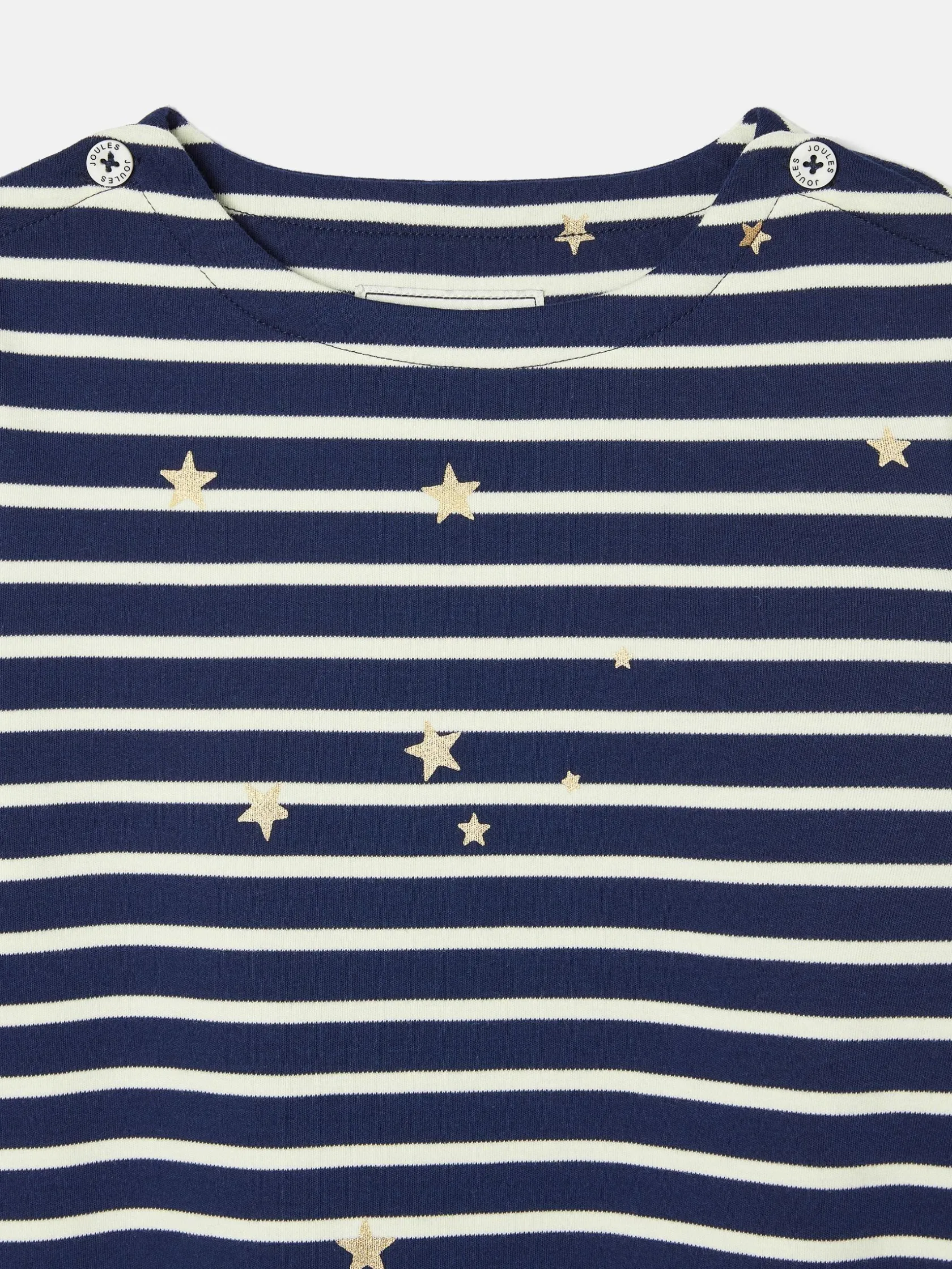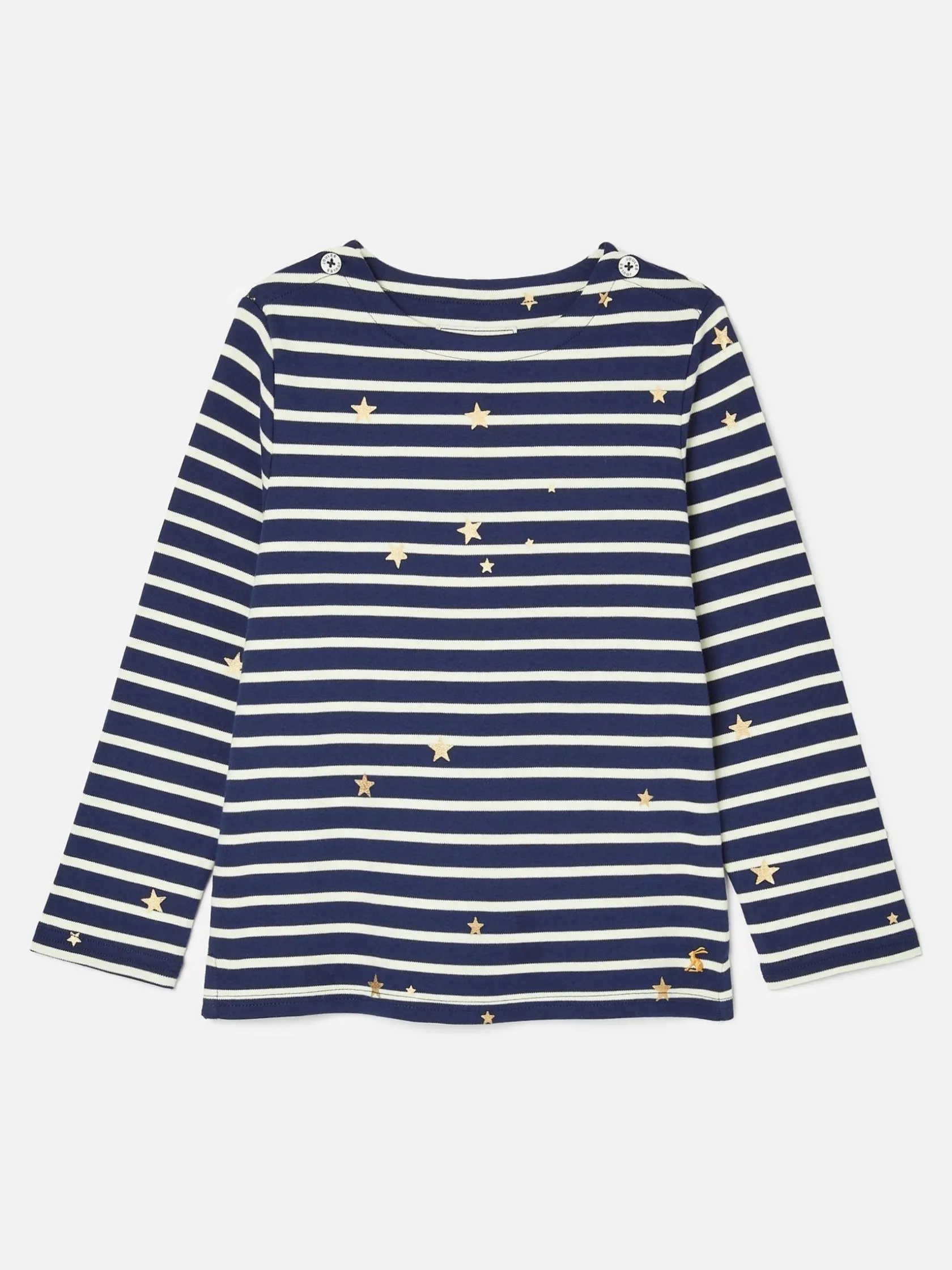 A beloved favourite returns for another season! Crafted from hardwearing jerseys, this top will see them through all kinds of mischief-making. It has long sleeves and a boat neck making it the perfect layering number, while the relaxed fit offers comfort any little one needs.It’s finished with button fastenings to each shoulder, nautical stripes and Joules branded detailing to the hem, sleeve and outer back neck. Pair with a fun full skirt and pumps for an outfit they’ll always want to wear. Cotton jersey with a soft hand-feel finish. Relaxed fit. Long sleeves. Boat neck. Button fastening to each shoulder. Striped. Side splits. Joules embroidered hare to the hem and badge to the sleeve