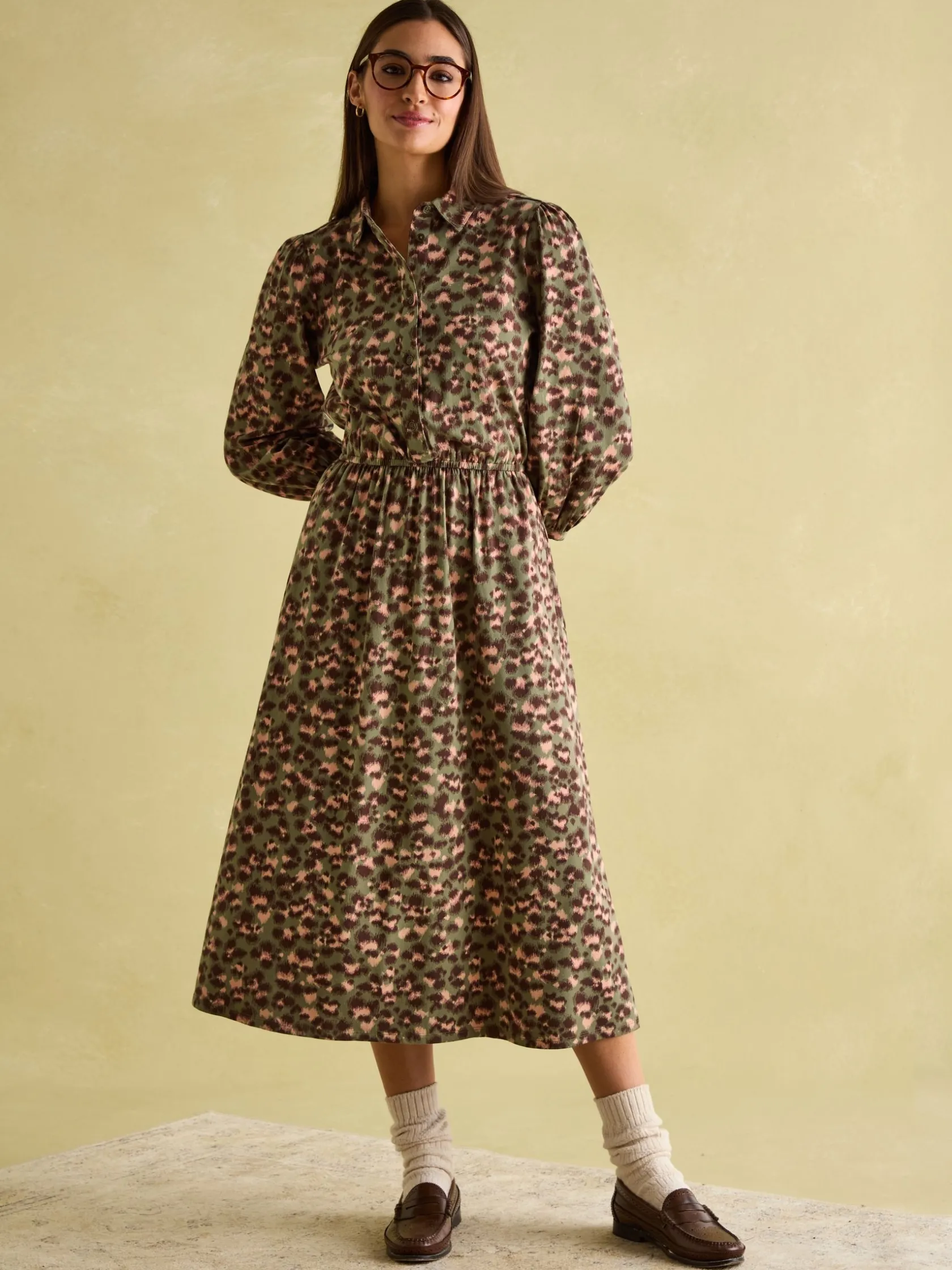 Easy-to-wear while remaining elegant and stylish, the Hazel dress is perfect for the autumn and winter season. It features a unique hand-drawn print and uses an opulent colour palette. The cotton jersey fabric makes it beautifully soft, while the midi length allows you to pair it with all kinds of footwear. A shirred waistband gives it a flattering cinch at the waist and a button placket lends itself to layering in the colder weather. Finished with pockets in the side seams! Cotton jersey blend. Midi length. Long sleeves with gathered shoulders. Button placket. Collar. Shirred waistband. Pockets in the side seams.