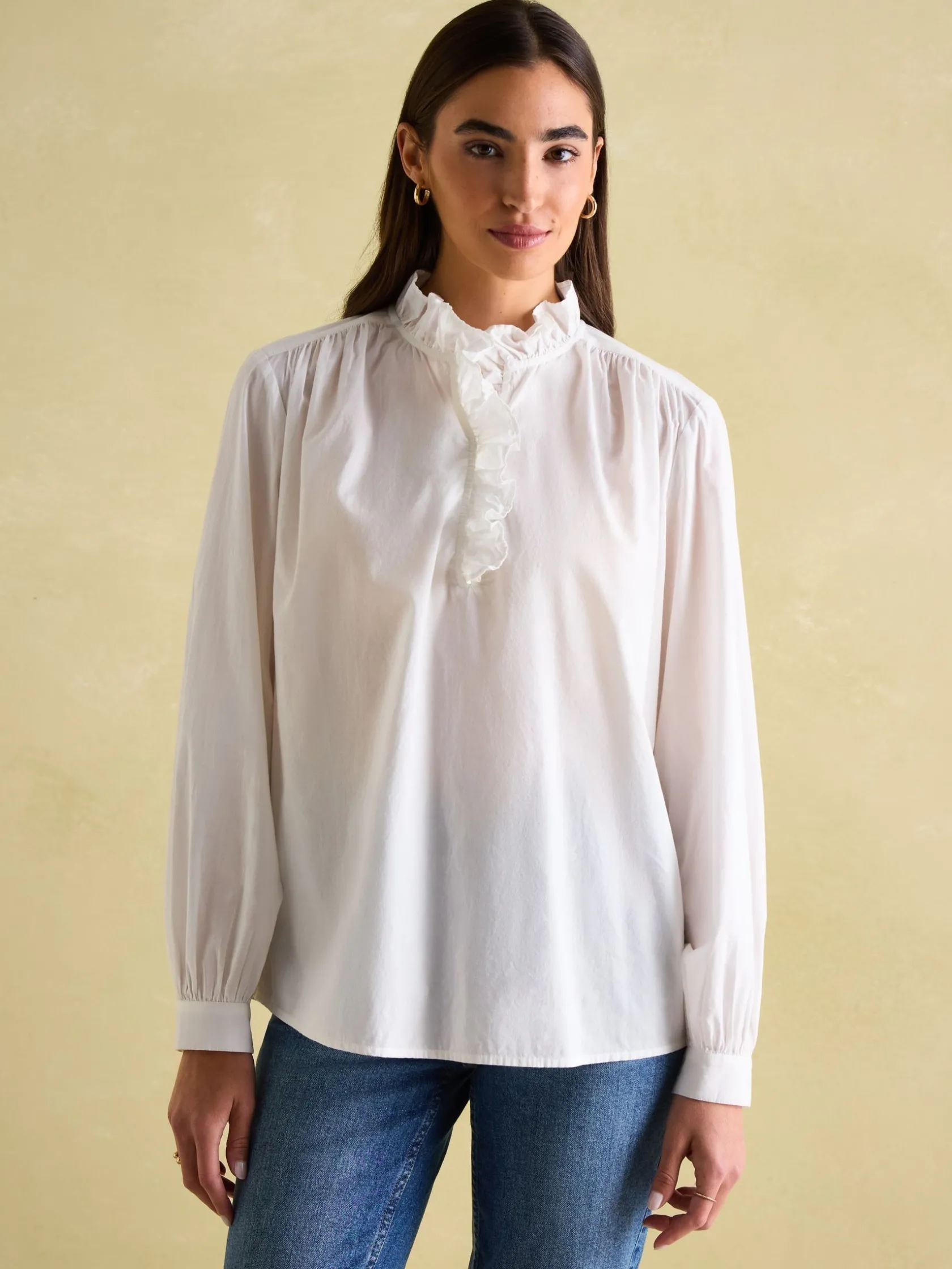 The Melanie blouse will be a timeless piece in your wardrobe you’ll come to rely on for any affair. It’s been lovingly crafted from quality cotton voile for a lightweight feel. The concealed button placket allows for versatile styling and has an elegant frilled trim which extends to the neckline and will look great peeking out from a layered-on sweatshirt or knit. It has long sleeves with button cuffs and gentle gathering to the shoulders, cuffs and back. This is a style that can stay with you all year round. Cotton voile. Woven. Lightweight. Long sleeves with button cuffs. Concealed button placket. Frill trim to the placket and neckline. Gentle gathering to the shoulders, cuffs and back.