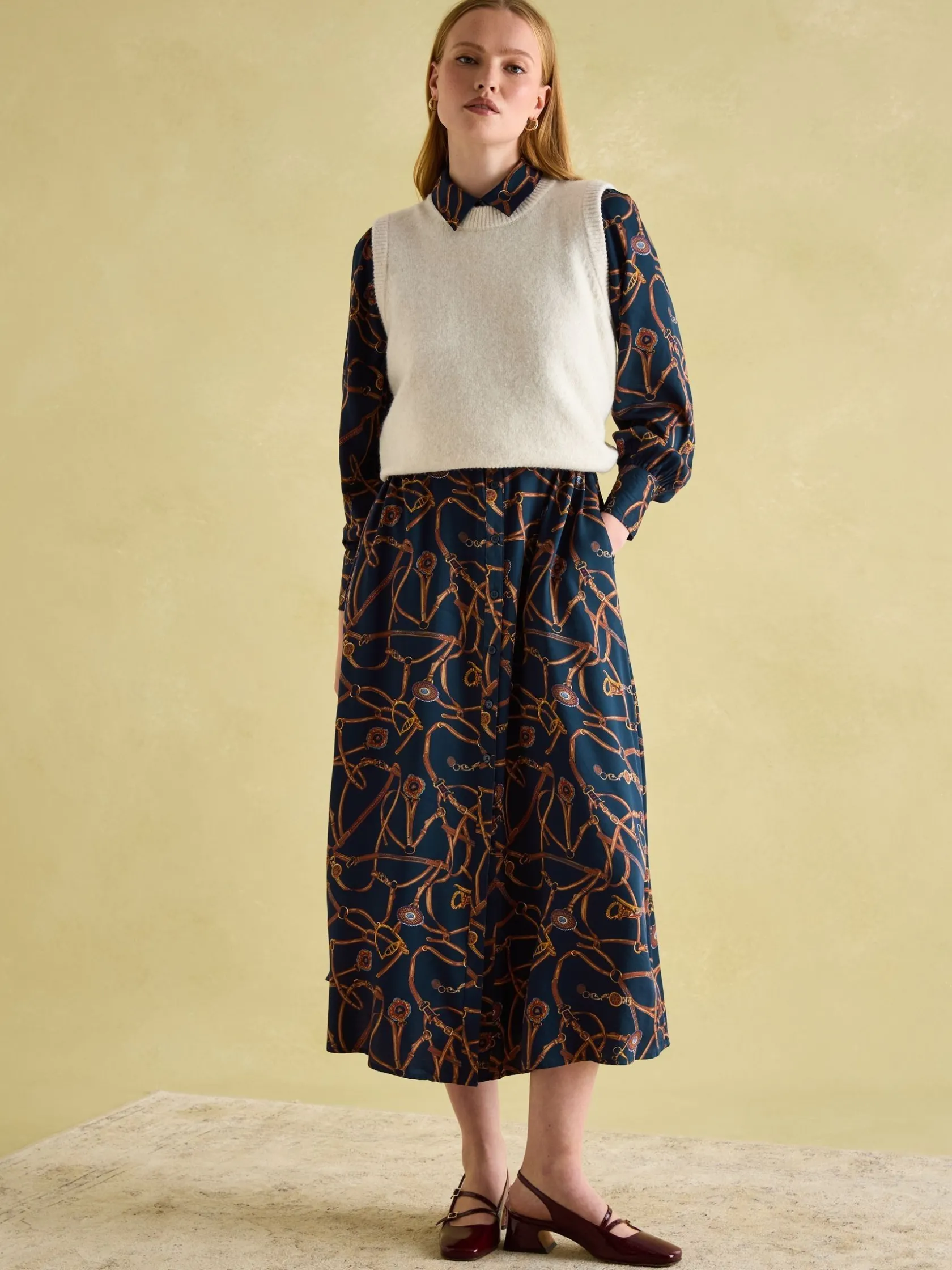 An elegant style with an equestrian twist, it’s time for your wardrobe to meet the Penelope dress. It’s designed in a classic shirt style with a button down fastening, collar and long sleeves with button cuffs. The belt not only allows you to cinch it in at the waist for a flattering look, but its detachable function means it can be worn in different ways. It falls to a midaxi length in an a-line shape which looks great teamed with any footwear from pumps and loafers to boots in the winter. The bridle print which adorns it makes a statement and is one that will transcend the seasons. Shirt dress. Midaxi length. Button down fastening. A-line shape. Collar. Long sleeves with button cuffs. Detachable belt. Buttons in the side seams. Equestrian-inspired bridle print.