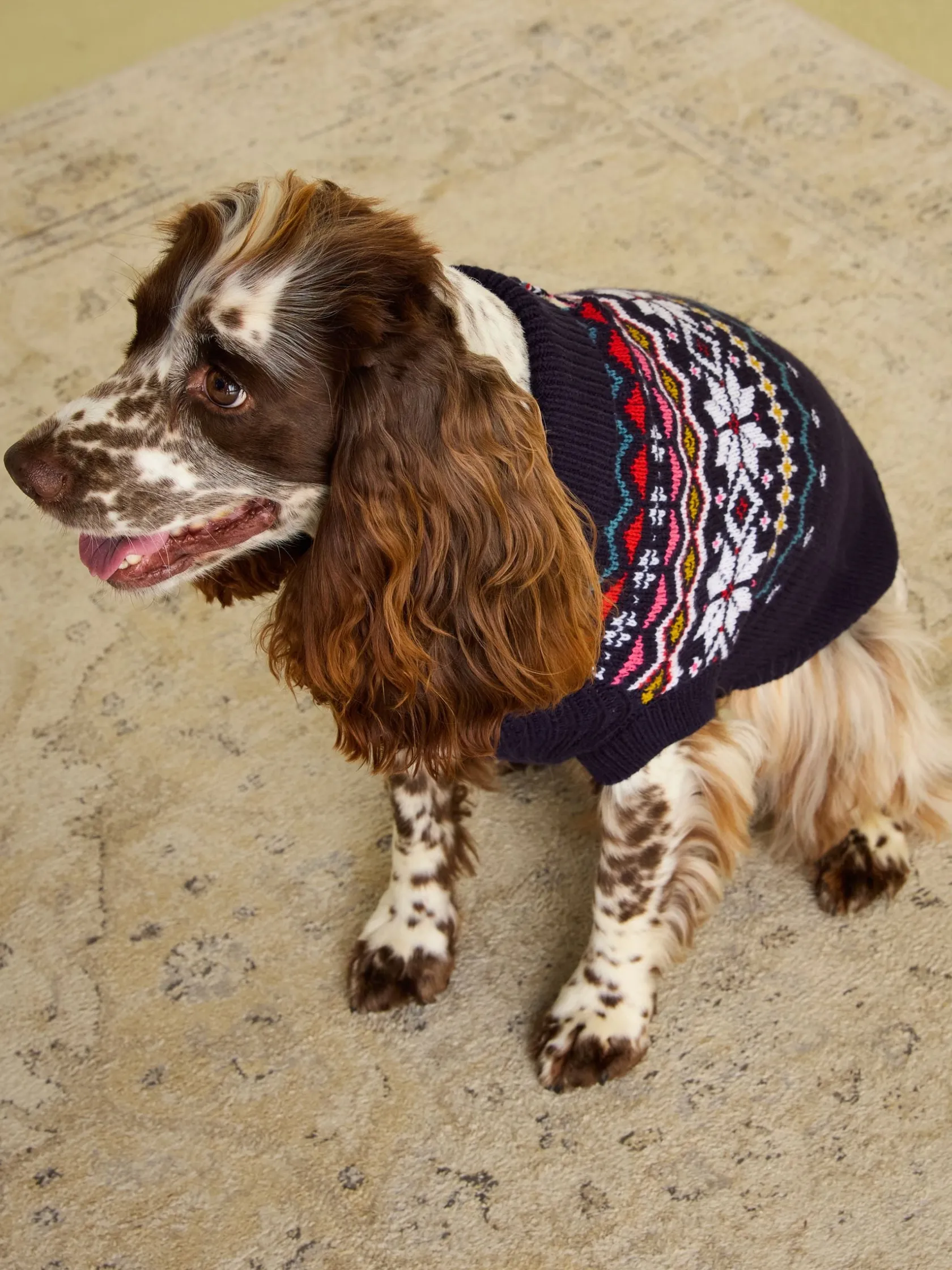 The Alba knitted dog jumper will get tails wagging this season. Designed for the cold weather, it’s crafted from a super soft knit, has a ribbed funnel neck and ribbed leg holes. For a seasonal twist it features a colourful Fair Isle pattern. It’s finished with a hole to the top for the lead to thread through. Knitted dog jumper. Fair Isle design. Ribbed roll neck. Ribbed leg holes. Hole for lead at the top.