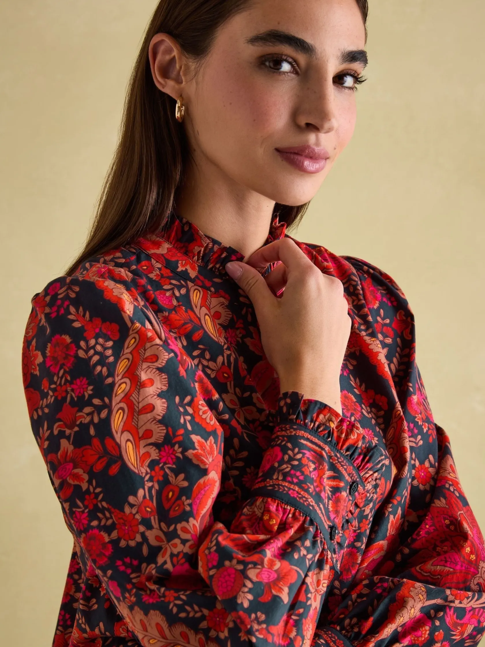 Introduce an elevated layer into your looks with the Auretta blouse. Bedecked in an ornate print which has been hand-drawn by the Joules in-house print team, it’s a piece unlike any other. It’s crafted from 100% cotton, has a classic button down fastening and a frilled neckline that will look great layered under round neck knitted vests. The sleeves are voluminous with gathered shoulders and feature button cuffs with a frilled trim. This is a style that can remain in your wardrobe year-round.100% cotton. Button down fastening. Voluminous sleeves with gathered shoulders. Button cuffs with frilled trim. Frilled neck. Hand-drawn print