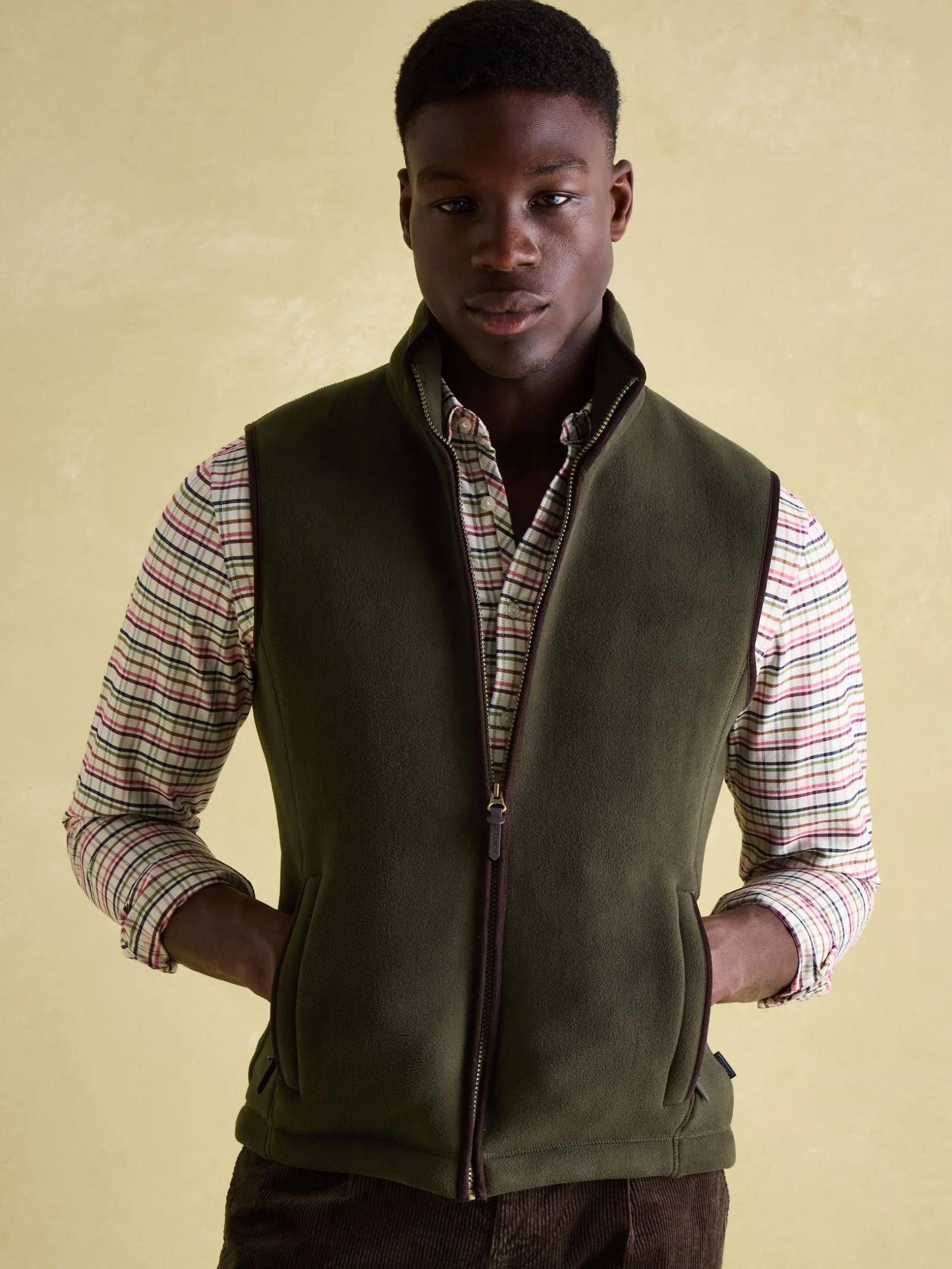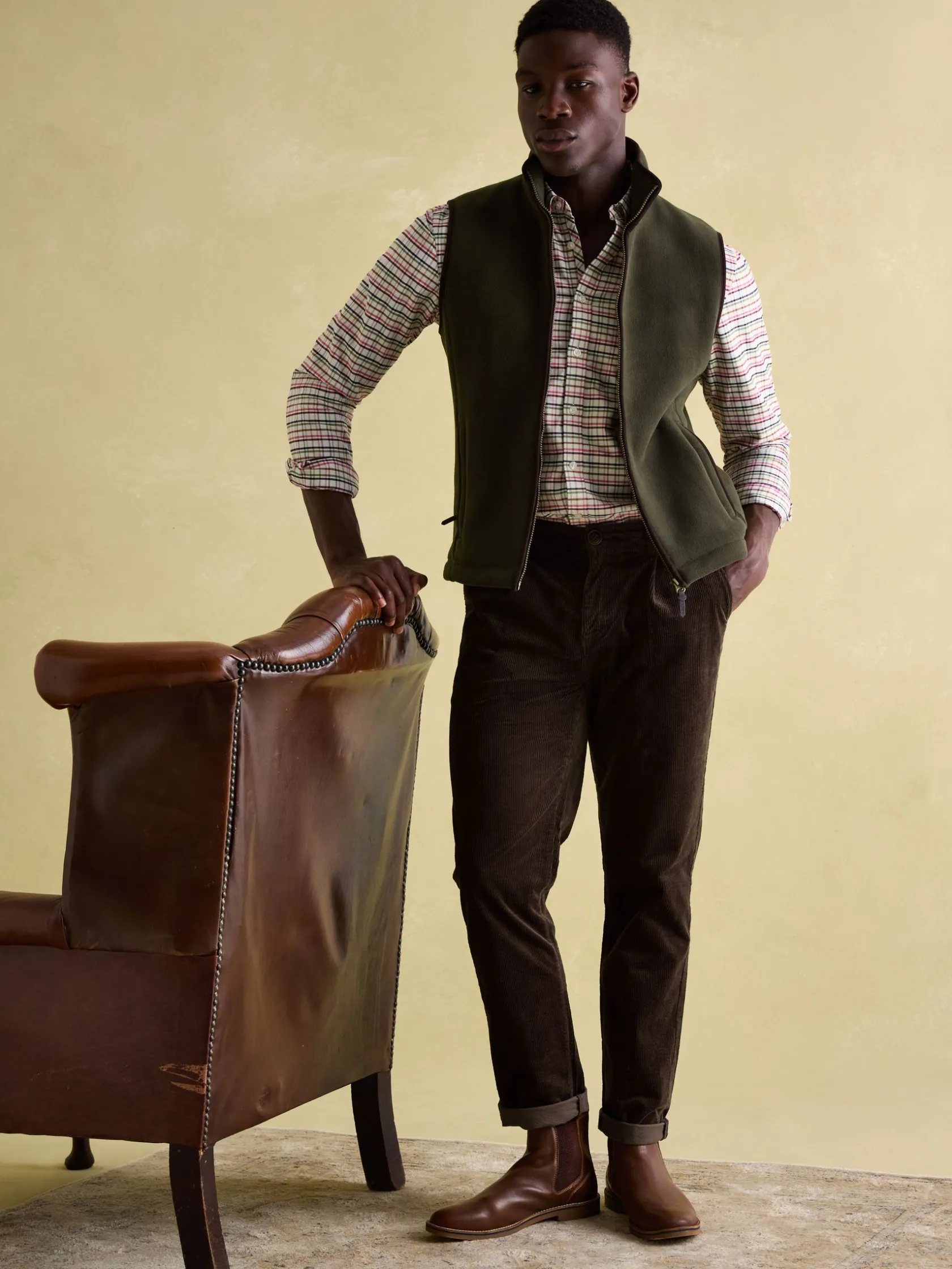 Worn over a shirt or a jumper (or both) this fleece gilet will cut a practical dash, whilst freeing your arms for clambering over stiles, foraging for autumn fruits or plundering the farm shop with ease. The funnel neck will ensure your neck stays warm, the zip fastening (with leather puller) is handy, as are the micro-fleece lined zip pocket and adjustable hem adds another level of function. nnFunnel necknZip fasteningnZip pocketsnAdjustable waistnCord trims and bindings