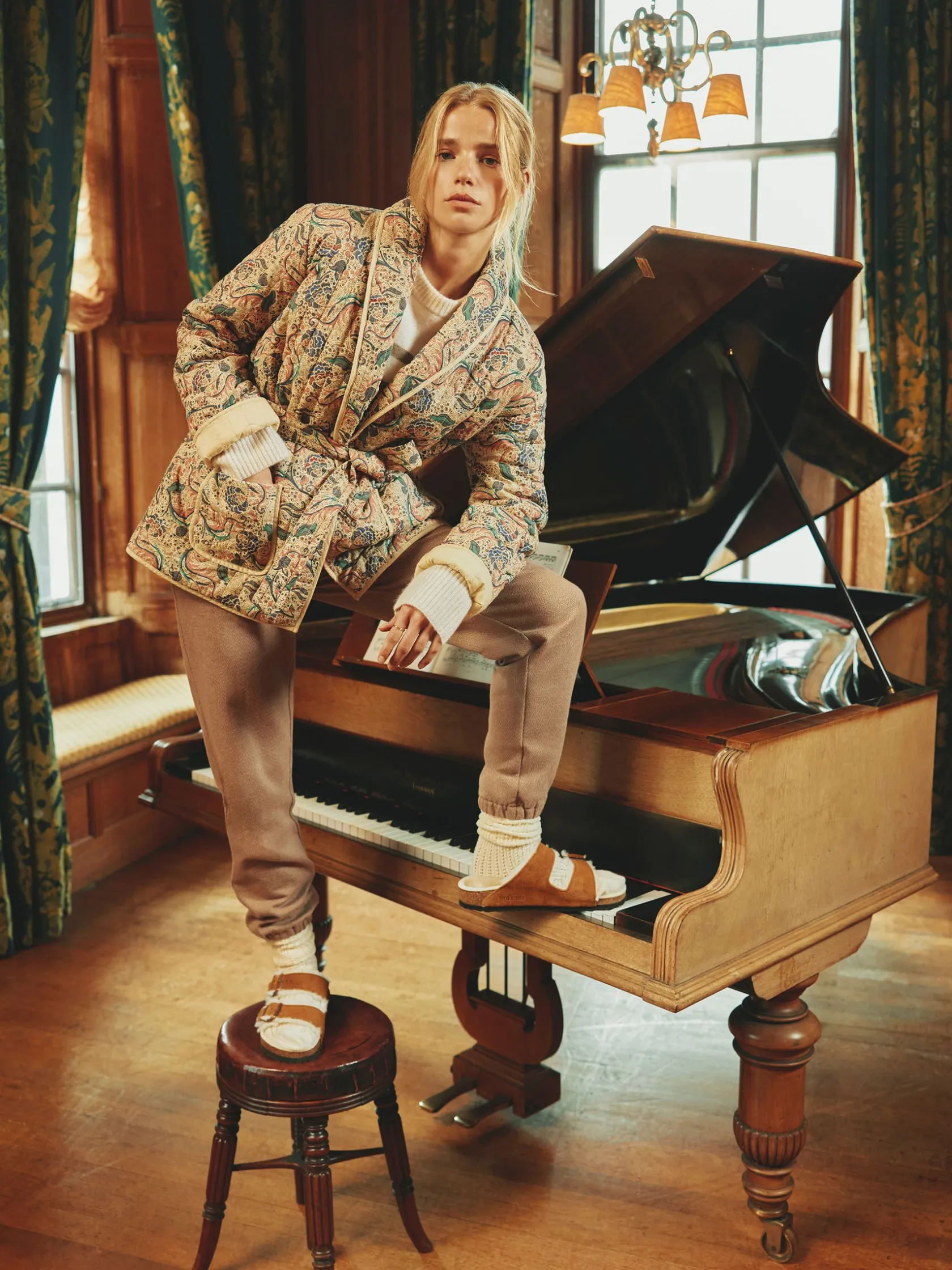 The housecoat has long been a way to elevate at-home attire. And while they have somewhat changed in appearance over the years, the aim remains the same – to offer a comfortable and casual layer. This piece is our take on a housecoat, which can be styled both in and out of the house. It maintains a classic shawl-style collar and fabric belt at the waist, but it’s quilted and filled with flat wadding for warmth when heading outside. The 100% cotton fabric makes it an enduring piece to invest in and its hand-drawn paisley print adds an opulent touch. At home, wear it with your favourite loungewear set and out and about team it with jeans and a t-shirt. 100% cotton. Quilted inside and out. Filled with flat wadding. Shawl-style collar. Adjustable belt. Two patch pockets to the front. Long, wide sleeves. Binding trim to the collar, cuffs and hem. Opulent print.