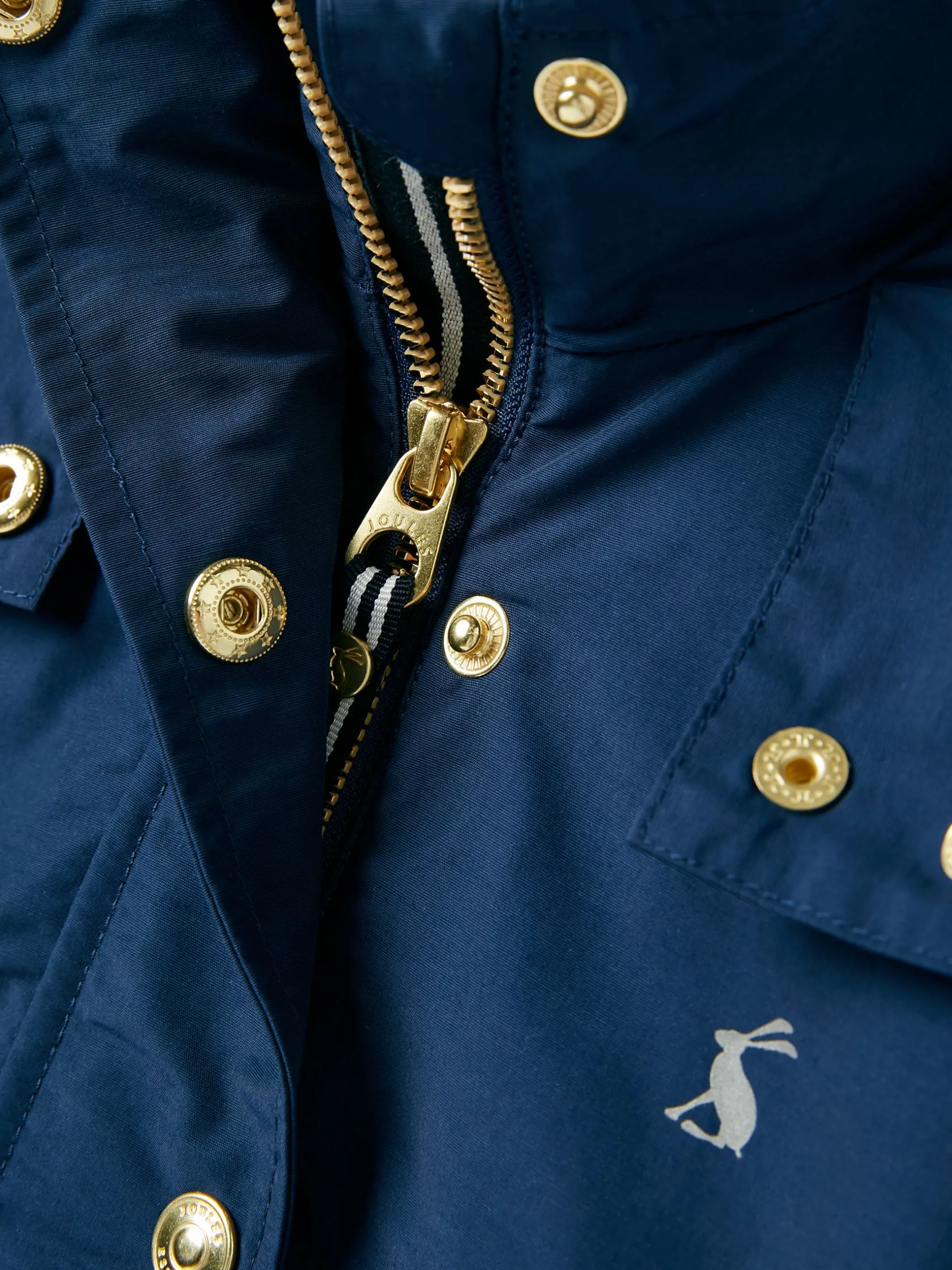 The Meadow coat will make a cute addition to your little one’s rainy-day wear. It uses a showerproof fabric that is water repellent perfect for light bursts of rain – and has a hood for extra protection. It has a swing shape, zip and popper fastening, two side pockets and elasticated cuffs. We’ve finished it with a reflective screen print to the chest and added a striped jersey lining. Cotton blend. Showerproof. Lightweight. Swing shape. Hood with striped lining. Zip and popper fastening. Two side pockets. Elasticated cuffs. Hare screen print to the chest. Striped lining.
