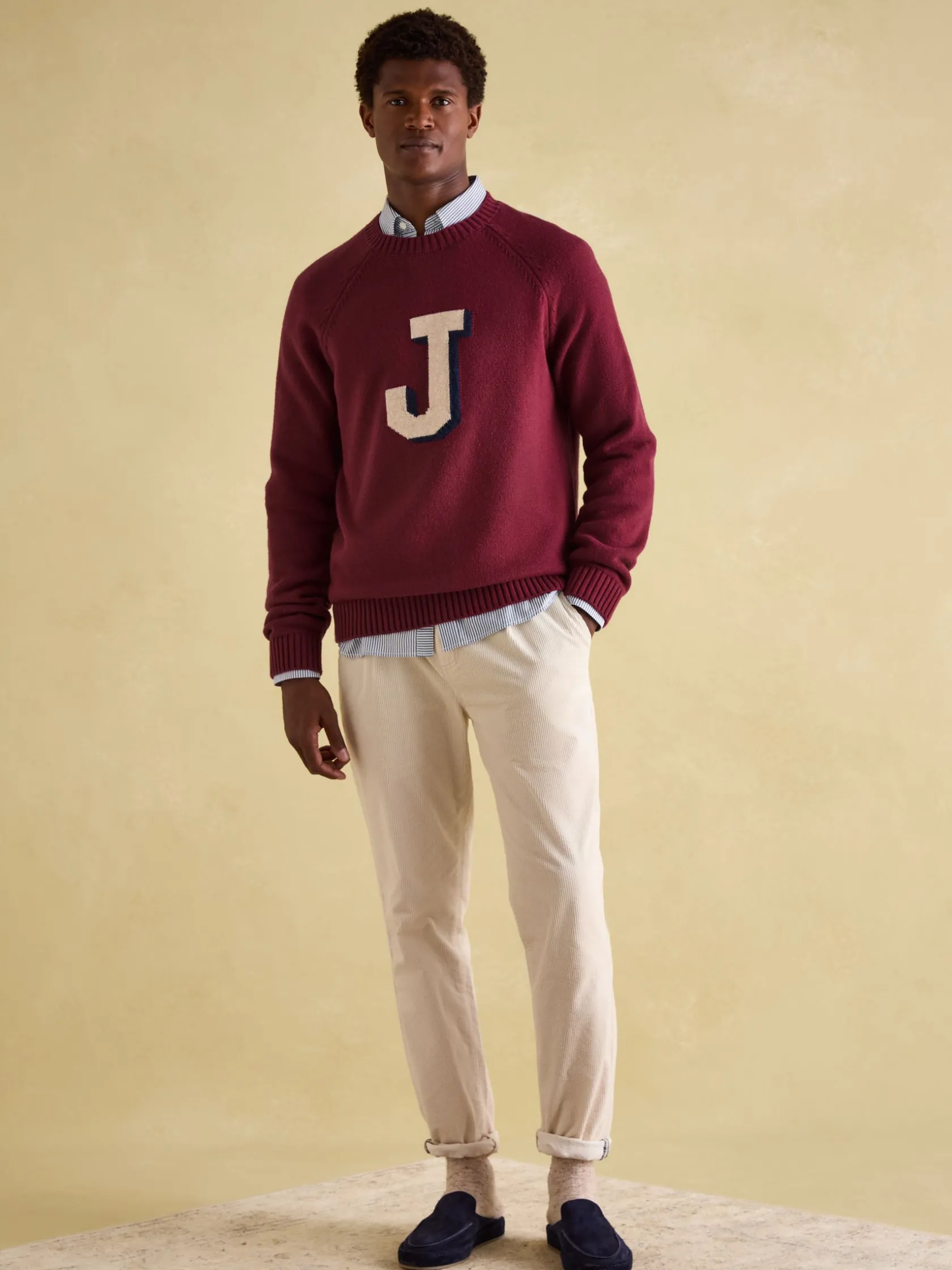 This jumper is the ultimate layer for any gent’s wardrobe. Suave and stylish, it features the initial ‘J’ knitted into the front and comes in a burgundy colour which mimics the palette of the season. It’s crafted from a soft merino wool blend which ensures it’s an enduring piece, has a classic ribbed crew neck for easy layering and is finished with a ribbed hem and cuffs. Team with a quilted gilet for a cool country look. Merino wool blend. Ribbed crew neck. Ribbed hem and cuffs. Intarsia letter ‘J’ to the front.