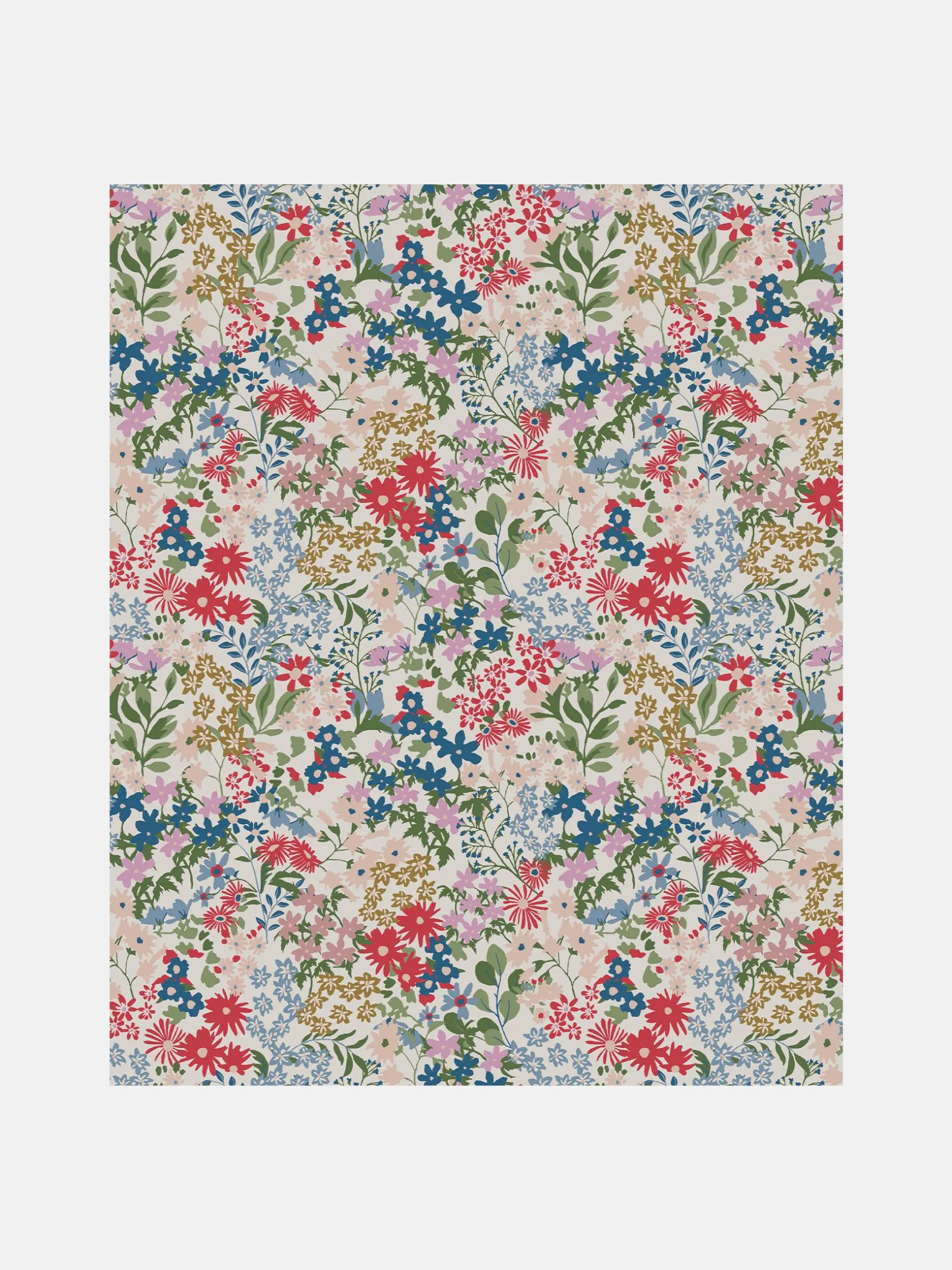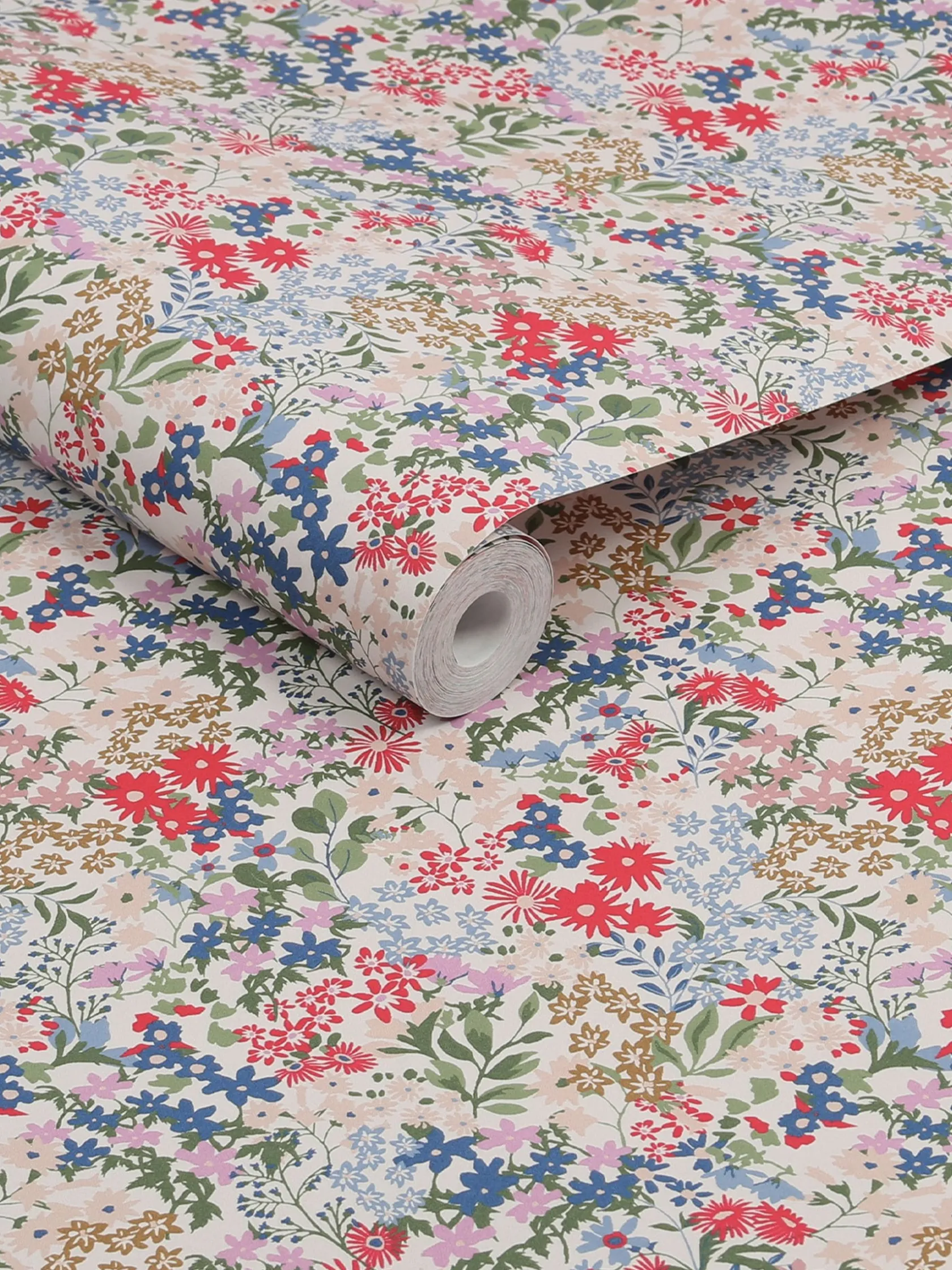 This ditsy design is a classic floral wallpaper in a soft, muted palette of soft reds, blues and garden greens. Perfectly sat upon a warm crème background. This intricate design will add warmth and the wonder of nature to any room. Printed on a matt substrate for a contemporary look and feel. This wallpaper is also paste-the-wall, making it easy to hang.
