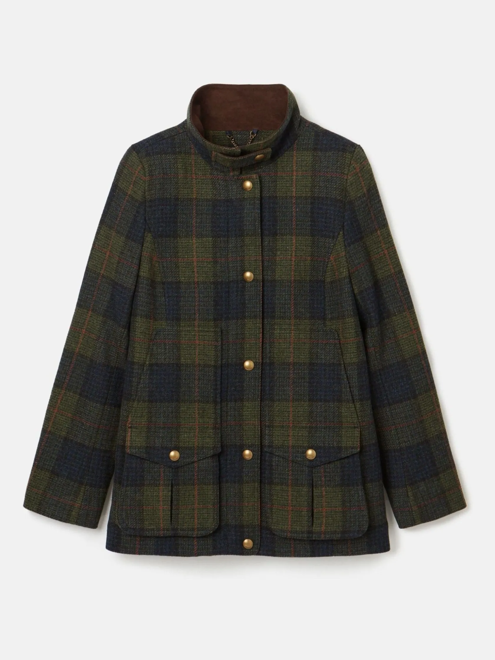 Our best-loved Fieldcoat is a style that we love to get reacquainted with every year. It’s crafted from a wool-blend that’s been adorned with an in-house designed check. It features a zip and popper fastening, suedette detailing and brass trims. The collar has been designed to be worn up or down and we’ve added to large pockets to the front. Inside you’ll find a printed lining and an internal pocket. Perfect for wearing on country walks or when dashing into town. A true investment piece.nnFieldcoatnWool blendnFlattering shapenSuedette detailnButton and zip fasteningnPocketsnPrinted lining