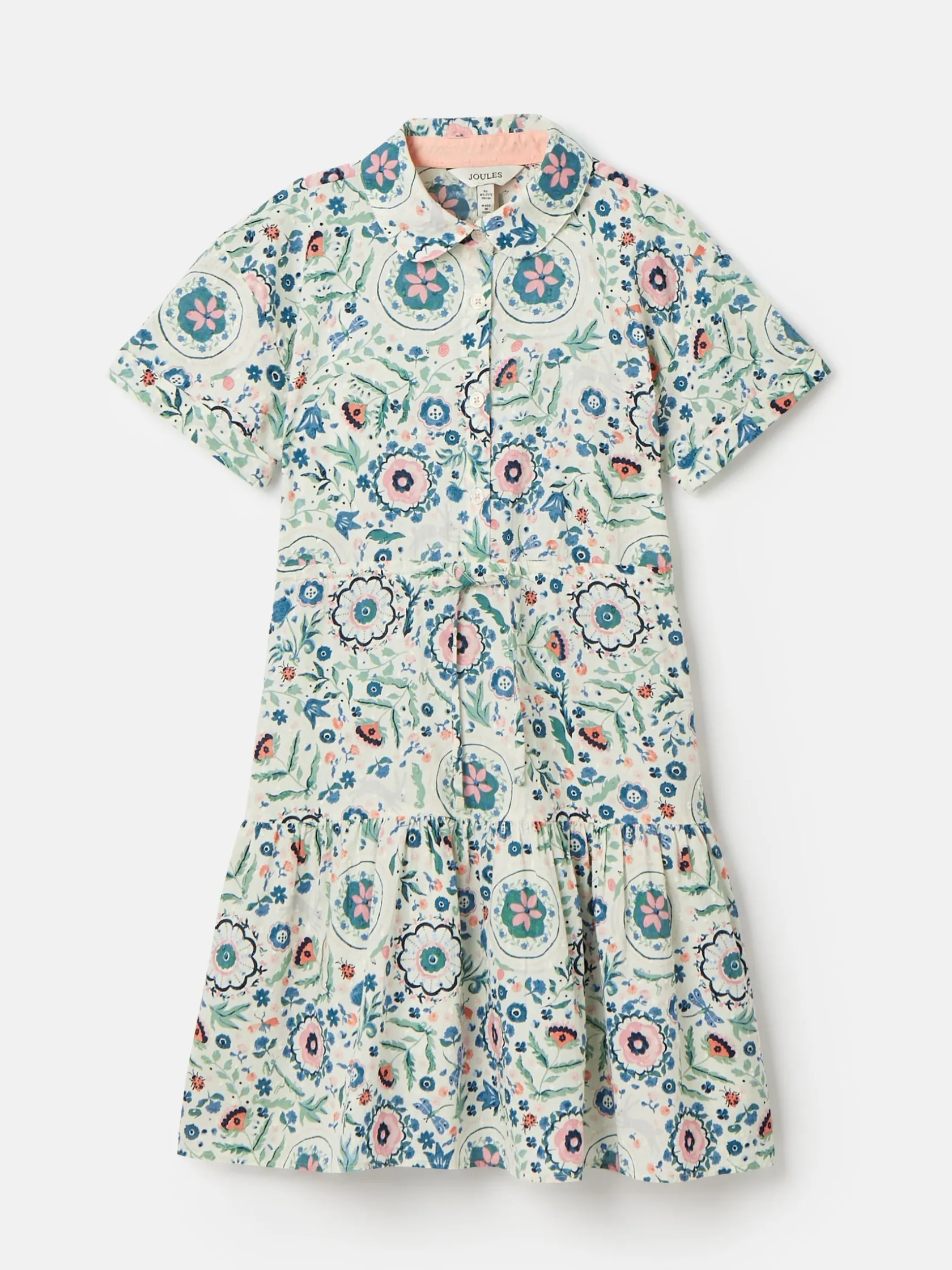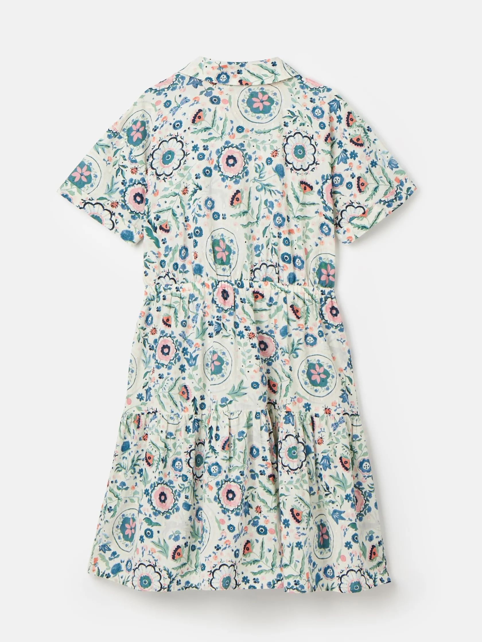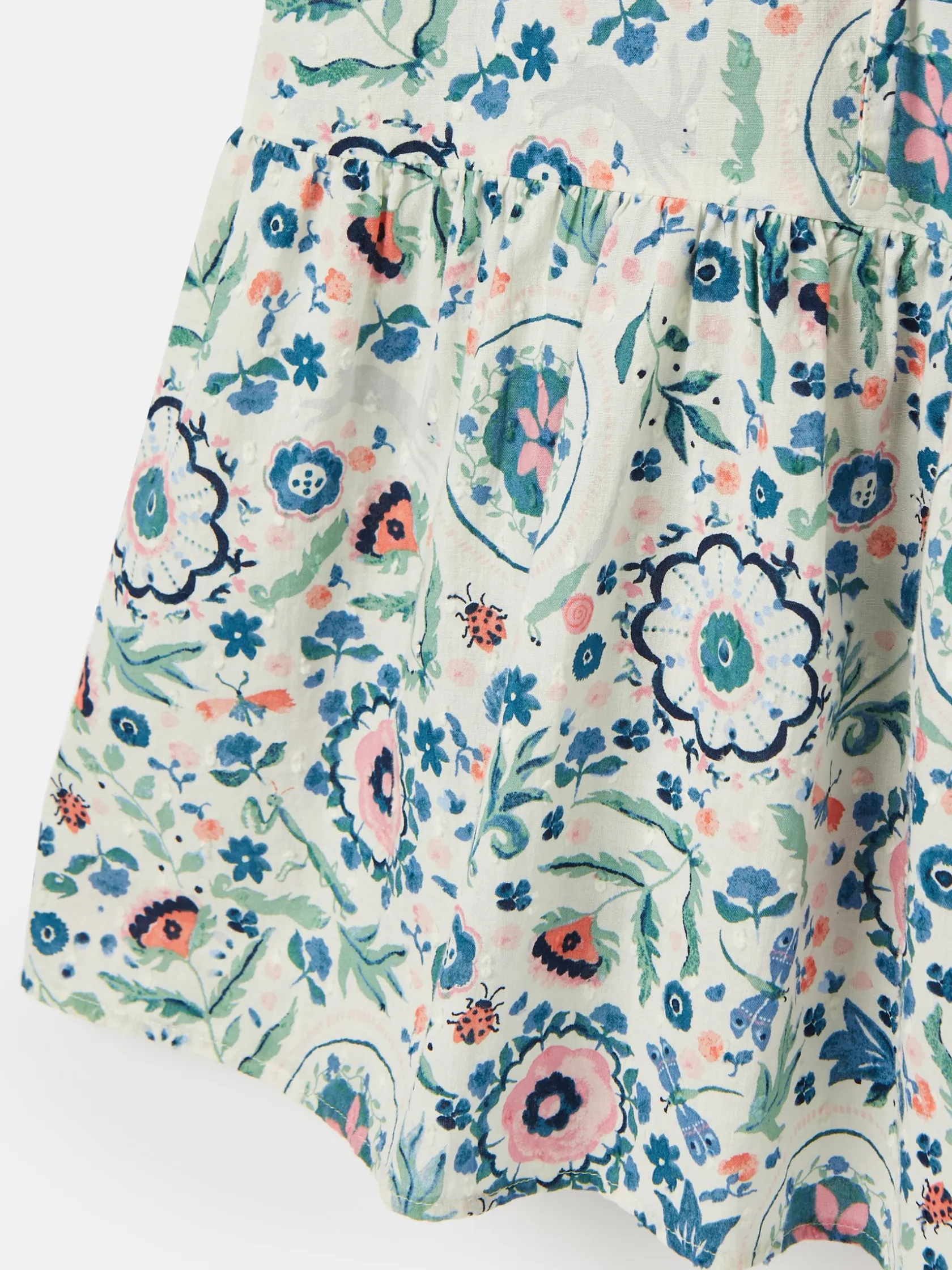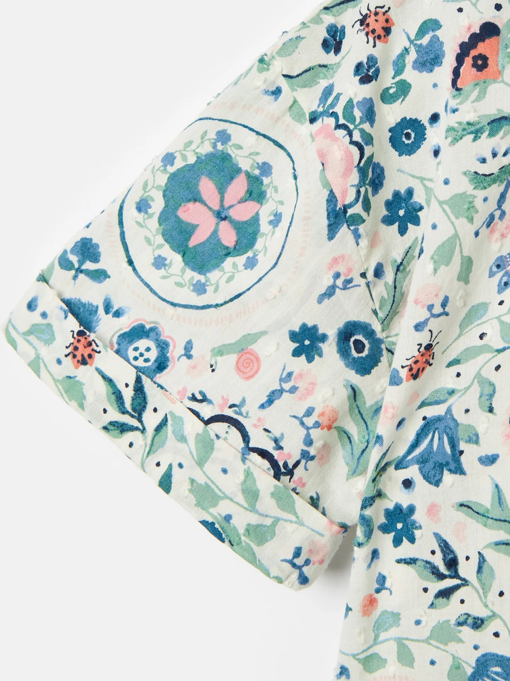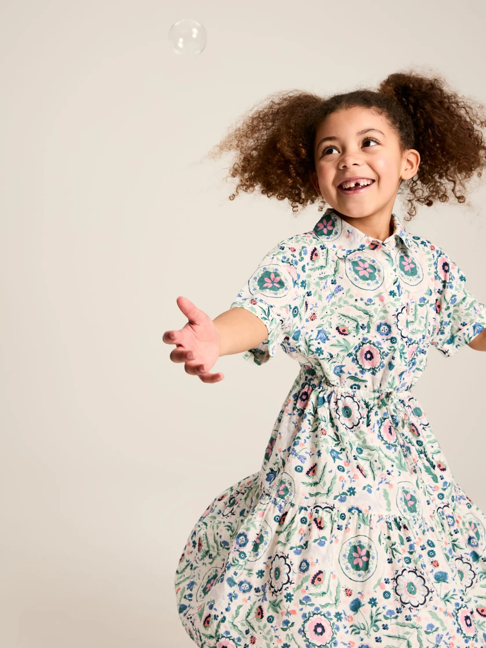 From tea parties to garden games, this pretty short-sleeved shirt dress is made for days filled with sunshine and smiles. The lightweight cotton fabric has a textured feel for that touch of something special, and the beautiful nature-inspired print will have them head over heels. It has a Peter Pan collar with a button-down front, and a pull-tie waistband that fastens in a bow at the front. The skirt has two pretty gathered tiers that are perfect for twirling in. 100% cotton textured fabric. Short sleeves. Peter Pan collar. Button-down front. Functional tie waist. Tiered skirt with gathers.