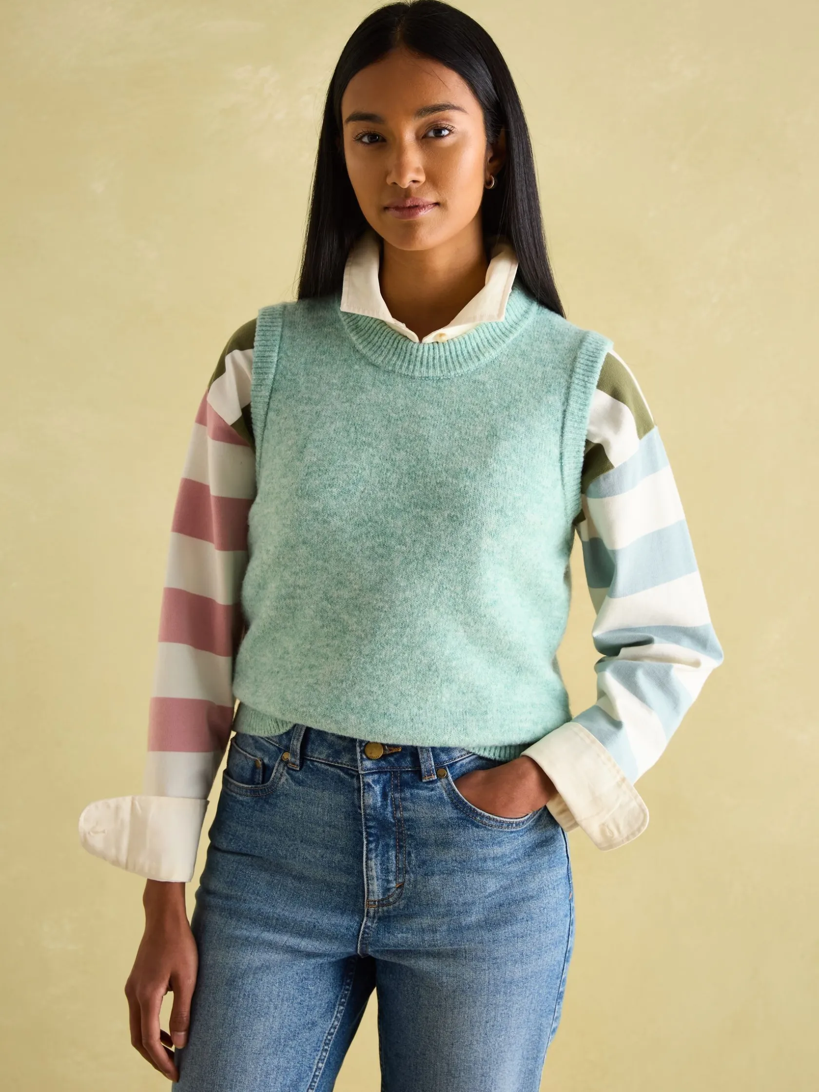 A knit you can wear now and later, the Holly vest is a versatile style to own. In milder weather style alone with chino or denim shorts and when temperatures drop, layer over a ruffle neck blouse of slim-fit top. It comes in an array of colours to choose from and is finished with a ribbed neck, hem and armholes. Knitted. Sleeveless. Regular fit. Ribbed neck. Ribbed hem. Ribbed armholes.