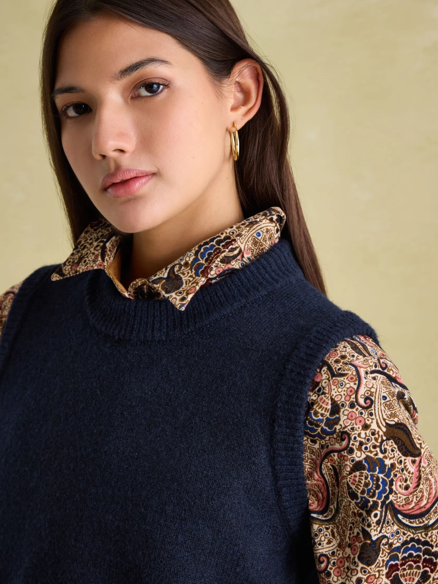 A knit you can wear now and later, the Holly vest is a versatile style to own. In milder weather style alone with chino or denim shorts and when temperatures drop, layer over a ruffle neck blouse of slim-fit top. It comes in an array of colours to choose from and is finished with a ribbed neck, hem and armholes. Knitted. Sleeveless. Longline. Ribbed neck. Ribbed hem. Ribbed armholes.