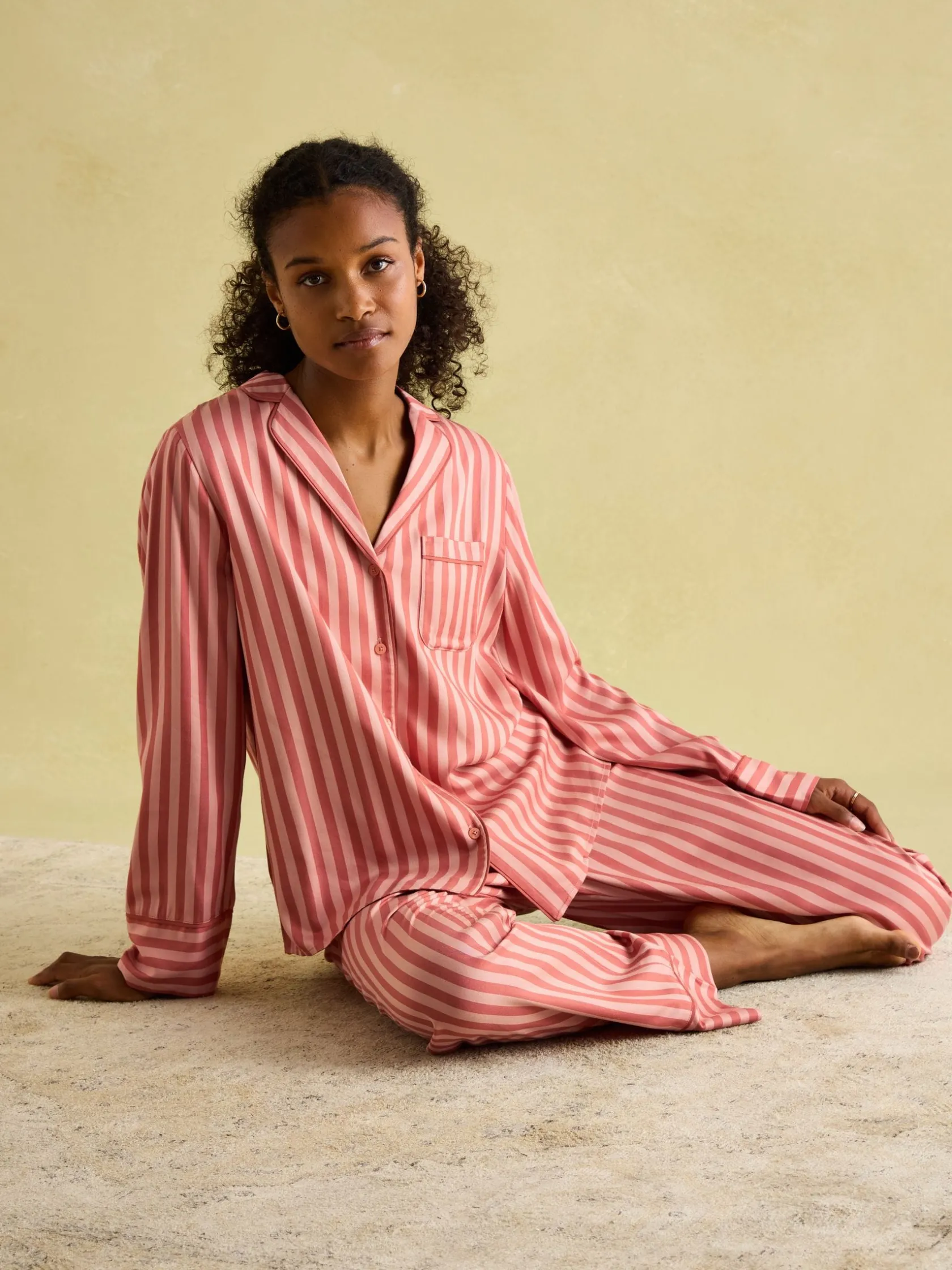 Drift off to dreamland with our Alma pyjama set. The set is crafted from lightweight and breathable viscose and comes with a long-sleeved button-up shirt, complete with a patch pocket and contrasting piped trims. The matching bottoms have a straight fit through the leg, an elasticated waist, luxurious velvet-topped drawcords and slanted side pockets. With a collection of heritage-inspired hand-drawn prints available, you’ll be truly spoilt for choice.nnViscosenLong sleevesnButton-down fasteningnPatch pocket to the chestnPiped trimsnVelvet topped drawcordsnElasticated waistnSlanted side pocketsnHeritage print