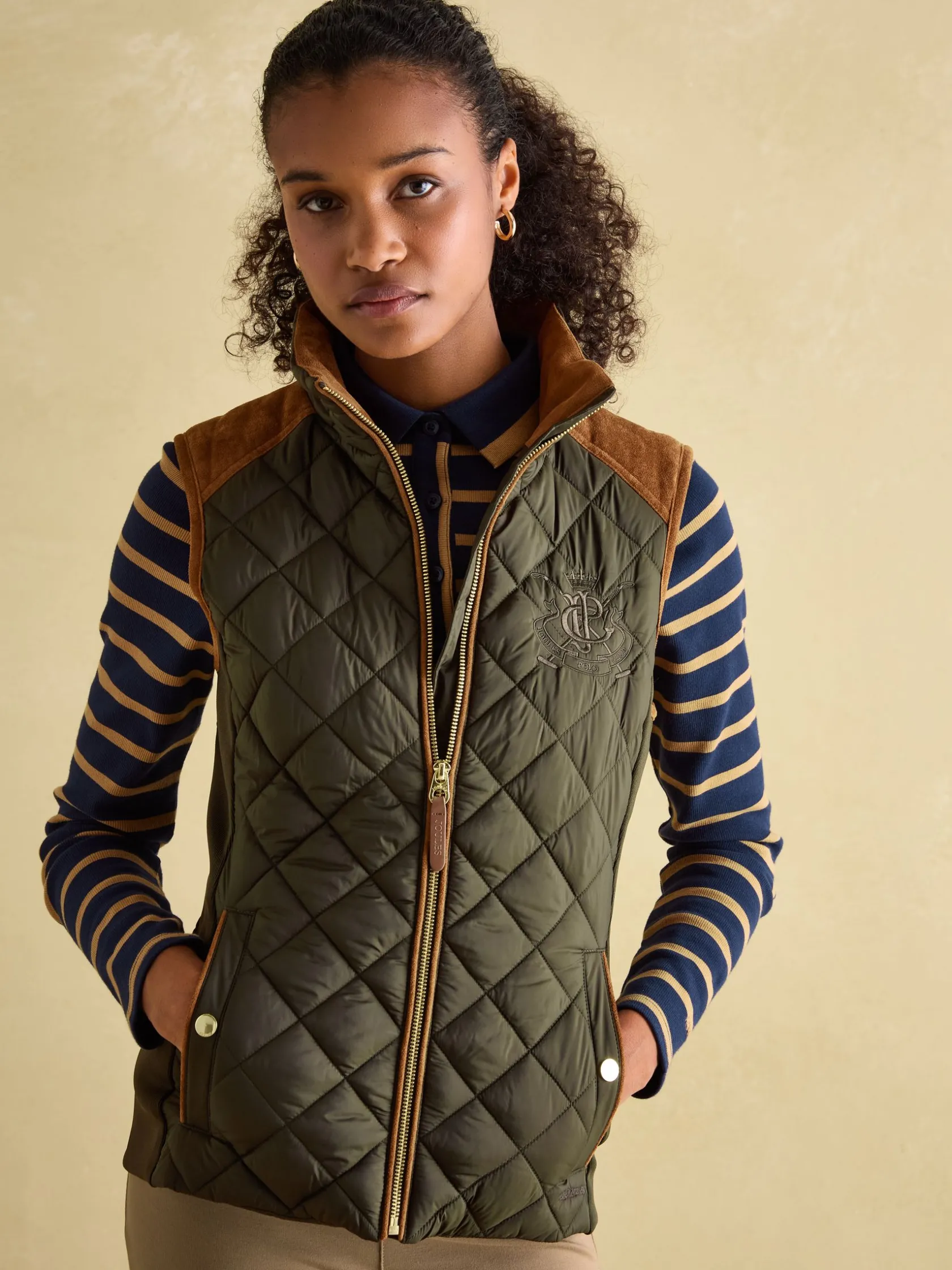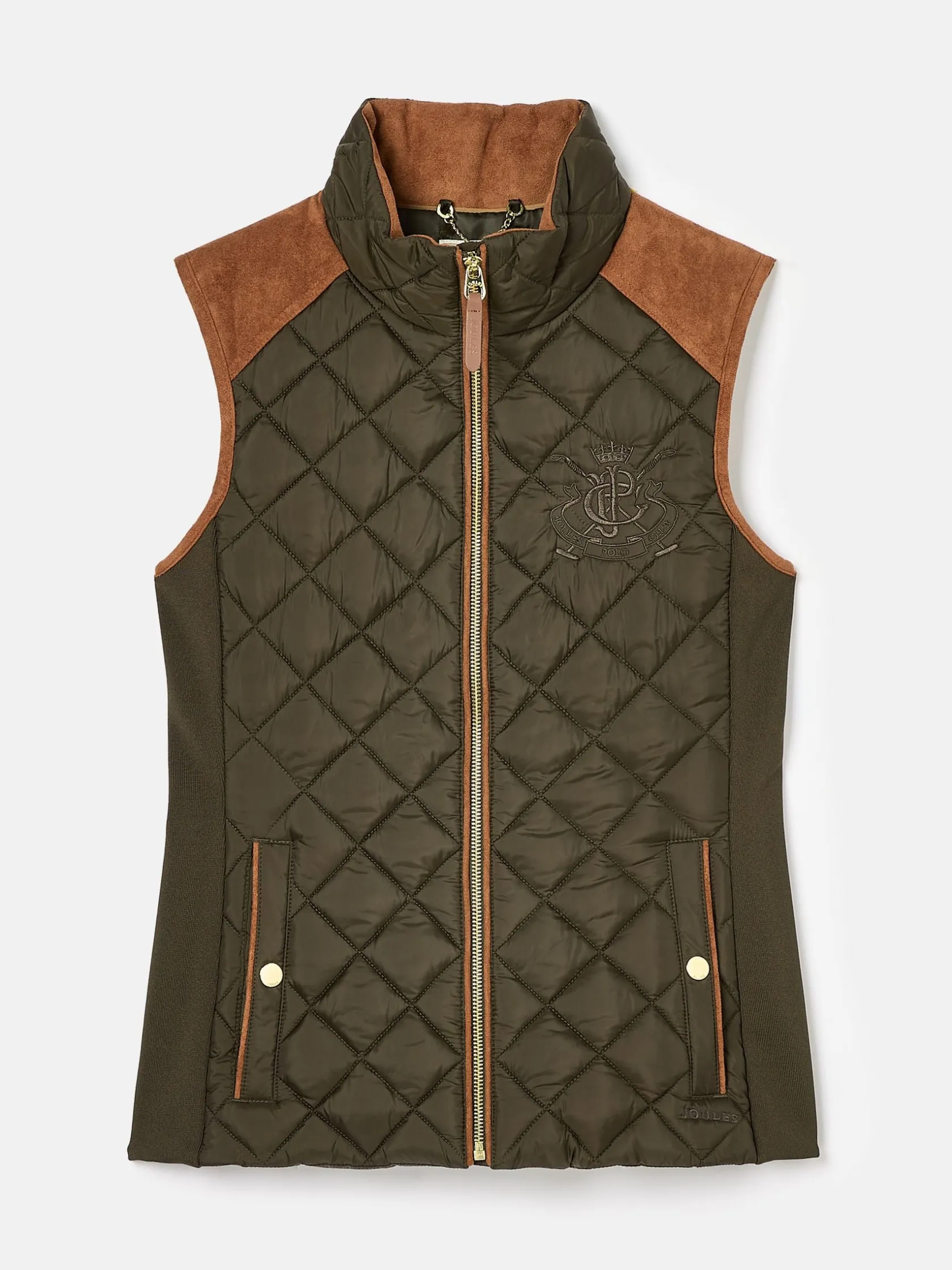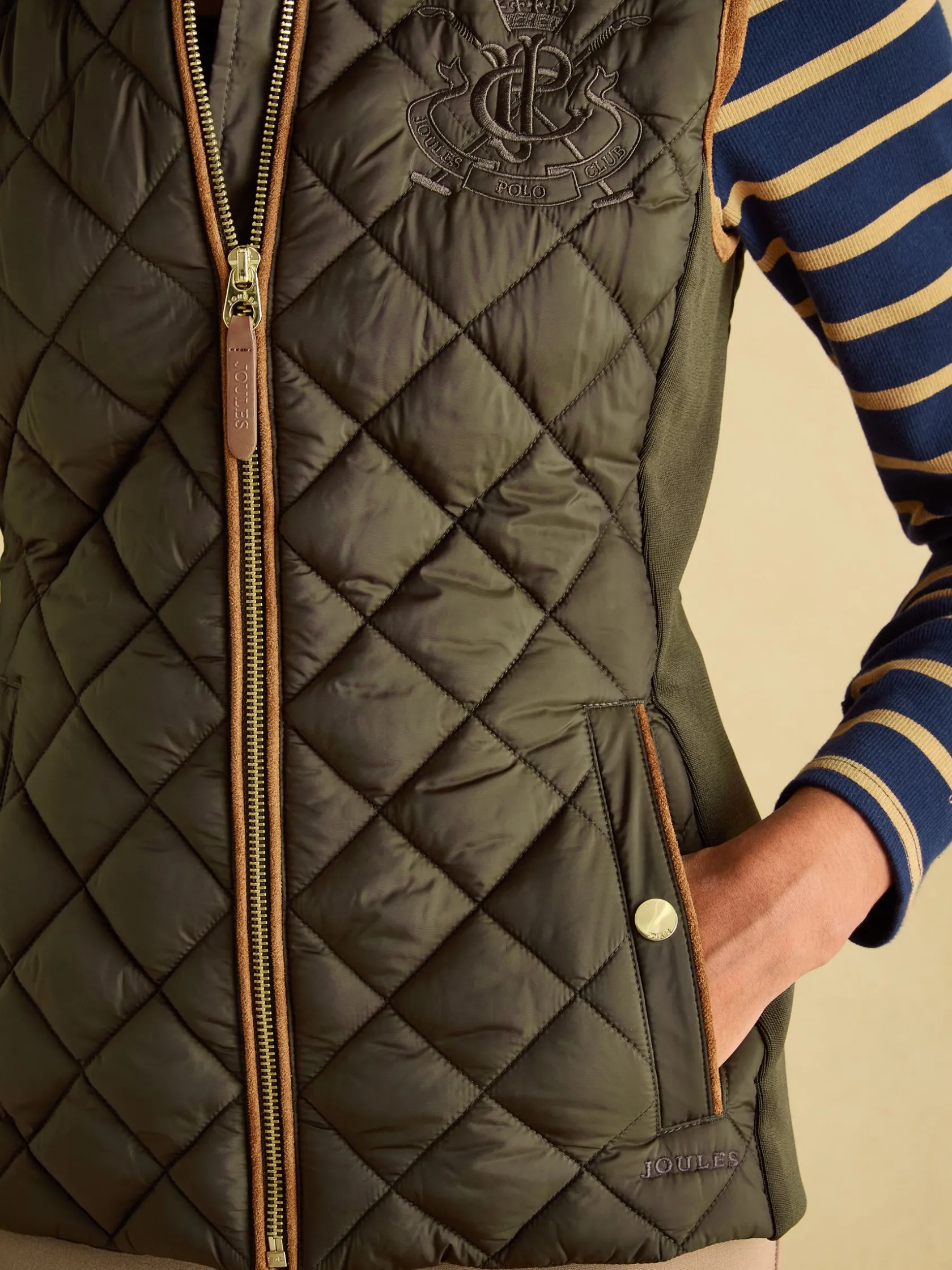 A true celebration of our rural heritage and style, this gilet really does go the extra country mile. Showerproof (meaning a little rain won’t stop play) and in a traditional diamond quilt pattern, it comes in a flattering silhouette and is home to well-considered detail and functional features. Suedette details offer a little change in texture, the intricate crest embroidery is a reminder of the quality and craft and the quilted back belt is further proof that this coat is more than just a gilet – it’s an expression of true countryside style. nnShowerproofnDiamond quiltednFunnel neck with suedette liningnZip fasteningnSuedette on shouldersnCrest embroiderynAdjustable back beltnFront pockets with popper fasteningsnCurved hem with lower back