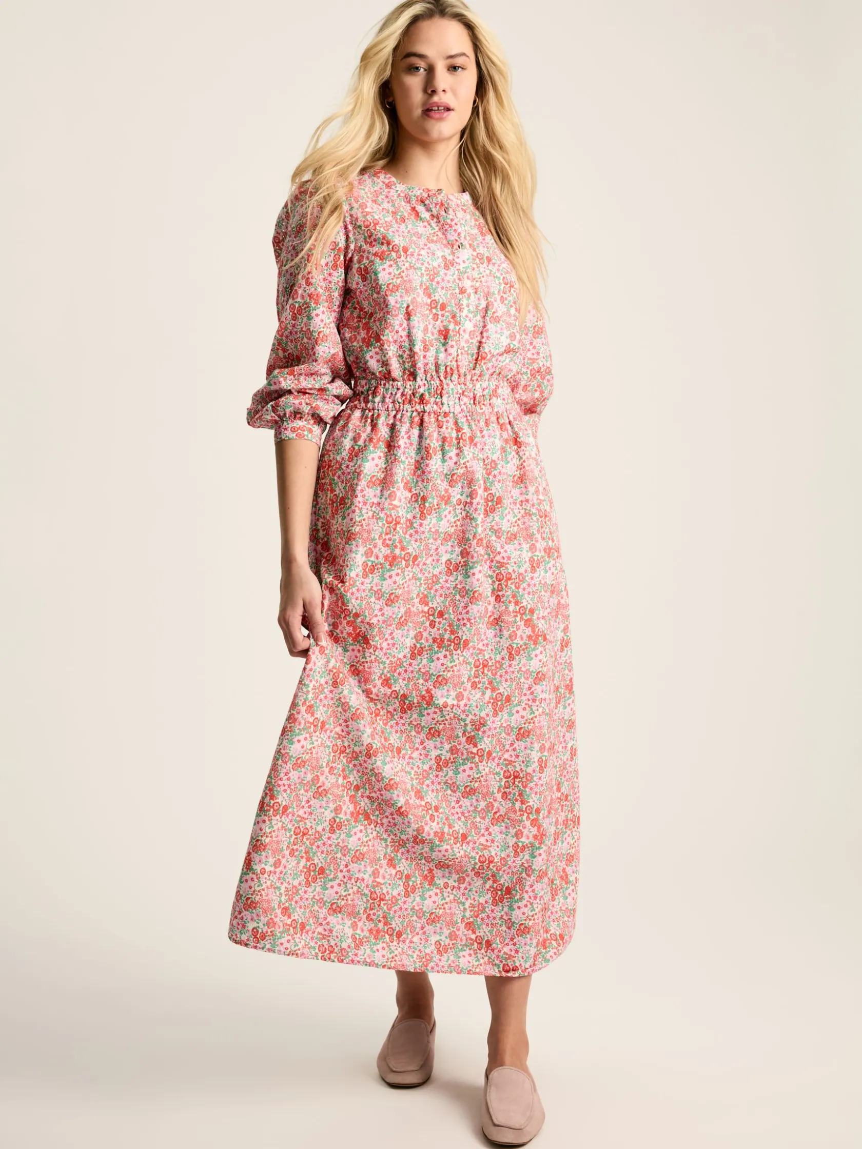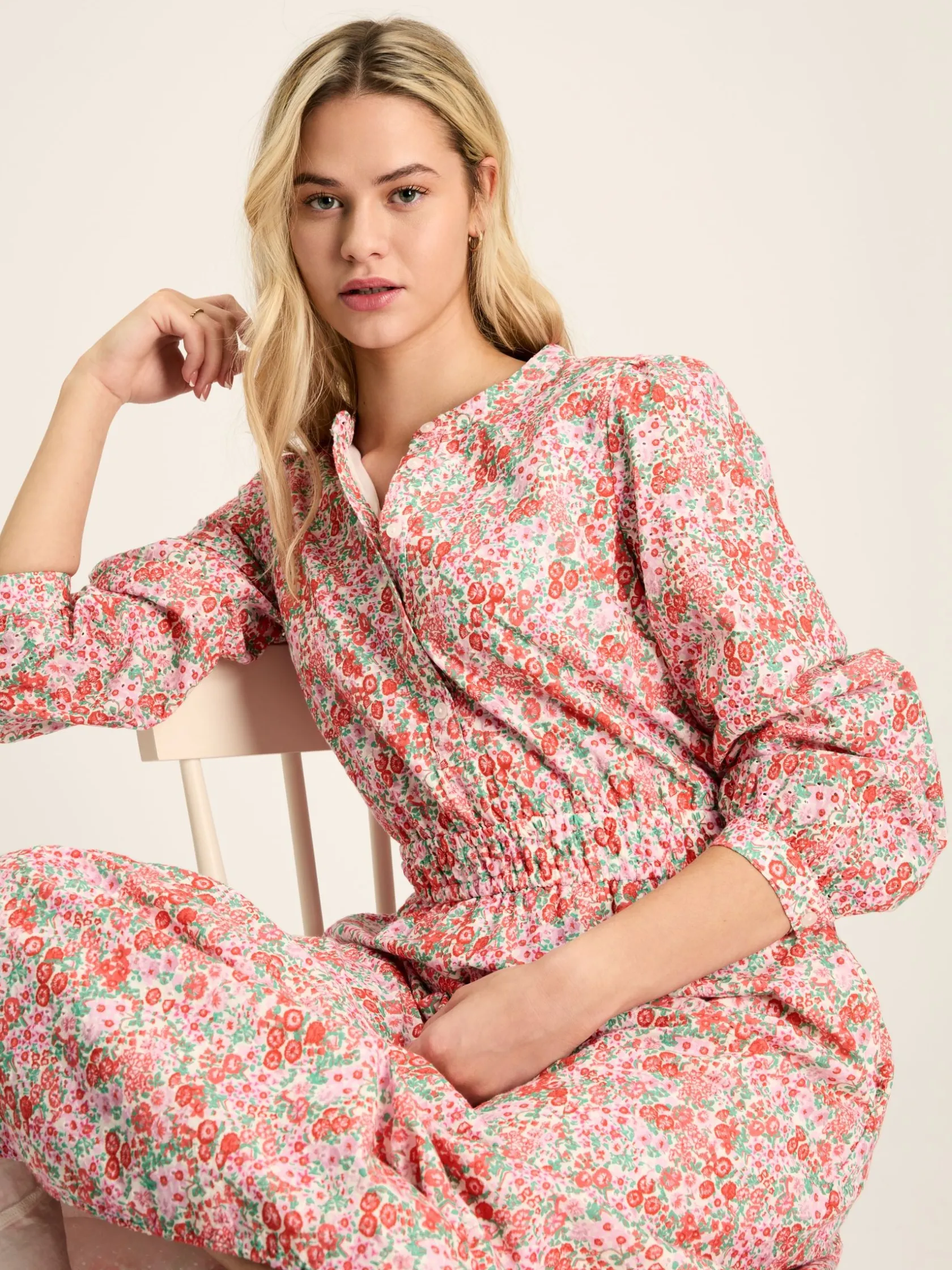 Made from 100% cotton, falling to an elegant maxi length and using a beautiful broderie anglaise cutwork technique, Cassie is the summer dress of your dreams. It has a flattering a-line shape which cinches at the waist via an elasticated panel and has a button placket to the front. The long sleeves are gathered at the shoulders and fasten with button cuffs. The body of the dress is lined for peace of mind, while the sleeves remain unlined to show-off the broderie detailing. Cotton. Maxi length. Broderie anglaise detailing. A-line shape. Elasticated waist panel. Button placket to the front. Round neck. Long sleeves with button cuffs. Lined body.