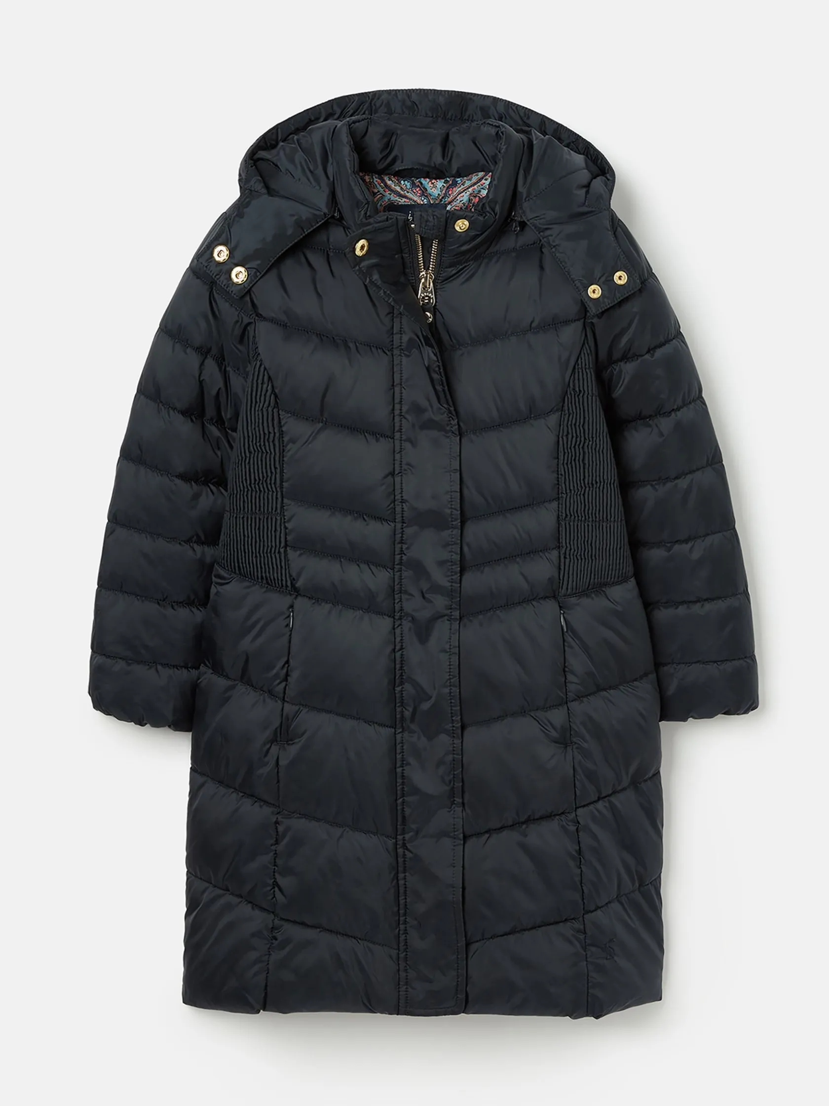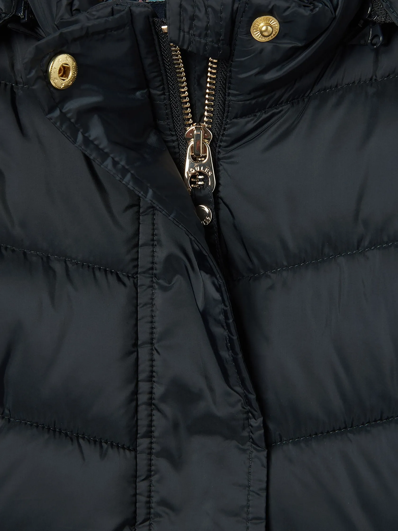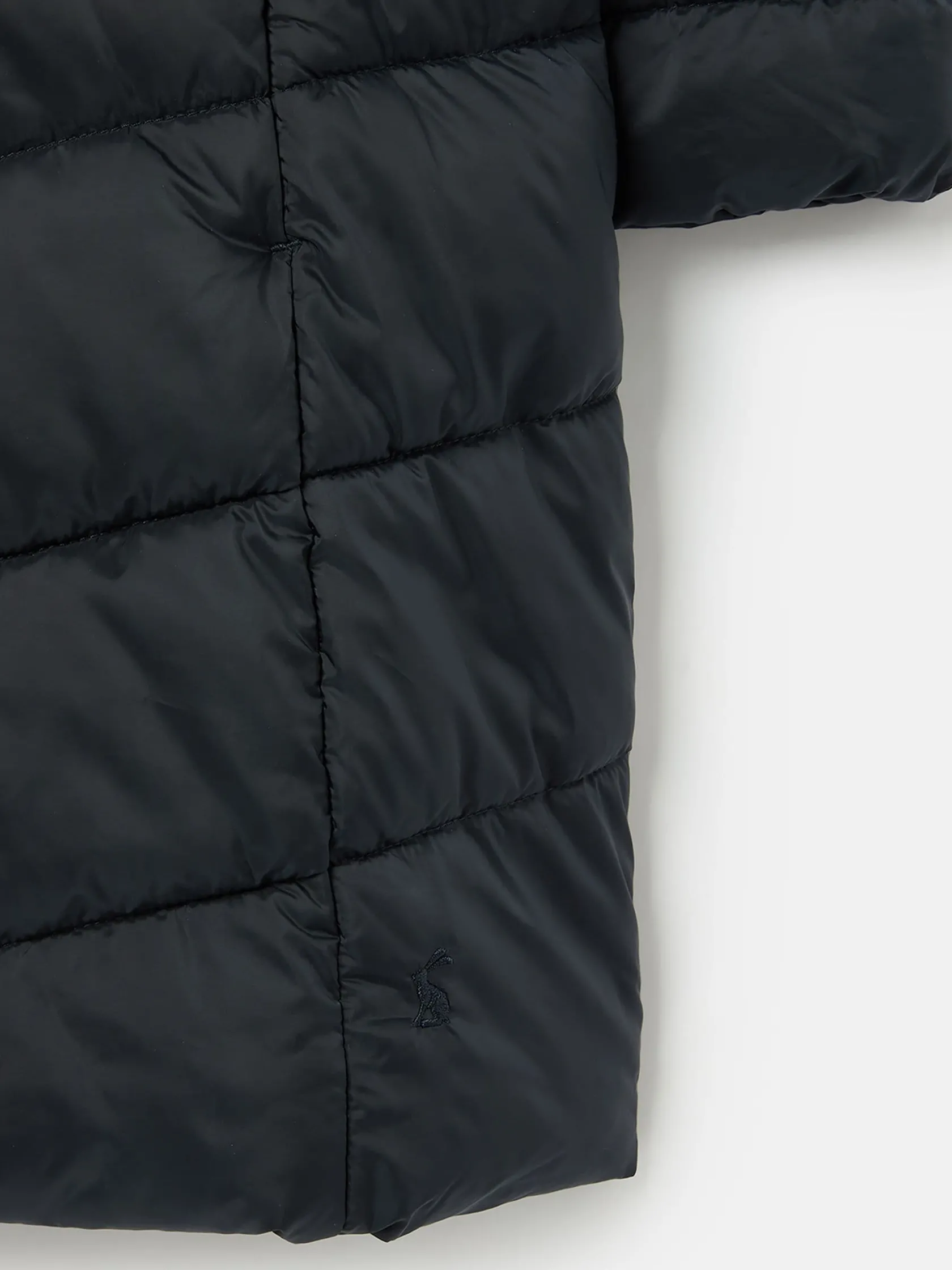 If you’re looking for a trustworthy new coat that will welcome the cold weather in style, then the Pembury has you covered. Our designers have cleverly added shirred side panels, slimmer chevron baffles to the waist and curved seams to the centre to balance out its shape for a more flattering fit without compromising on cosiness. The fabric has a soft-to-touch pearlised finish that’s also showerproof, making it perfect for light bursts of rain, and the hood is detachable so you can decide your level of protection before you head out. The high neck and chin guard with popper fastenings also add an additional touch of coverage to snuggle into when the wind starts to whistle on through. You’ll find two invisible zip pockets to each side and a beautiful hand-drawn printed lining inside. Showerproof. Padded with chevron quilting and variegated baffles to the waist. Shirred side panels. Detachable hood with zip and internal waist adjusters. Pearlised finish. Printed lining. Zip and popper fastening. Two hidden zip side pockets. Joules hare embroidery to hem and Joules script logo to the sleeve.