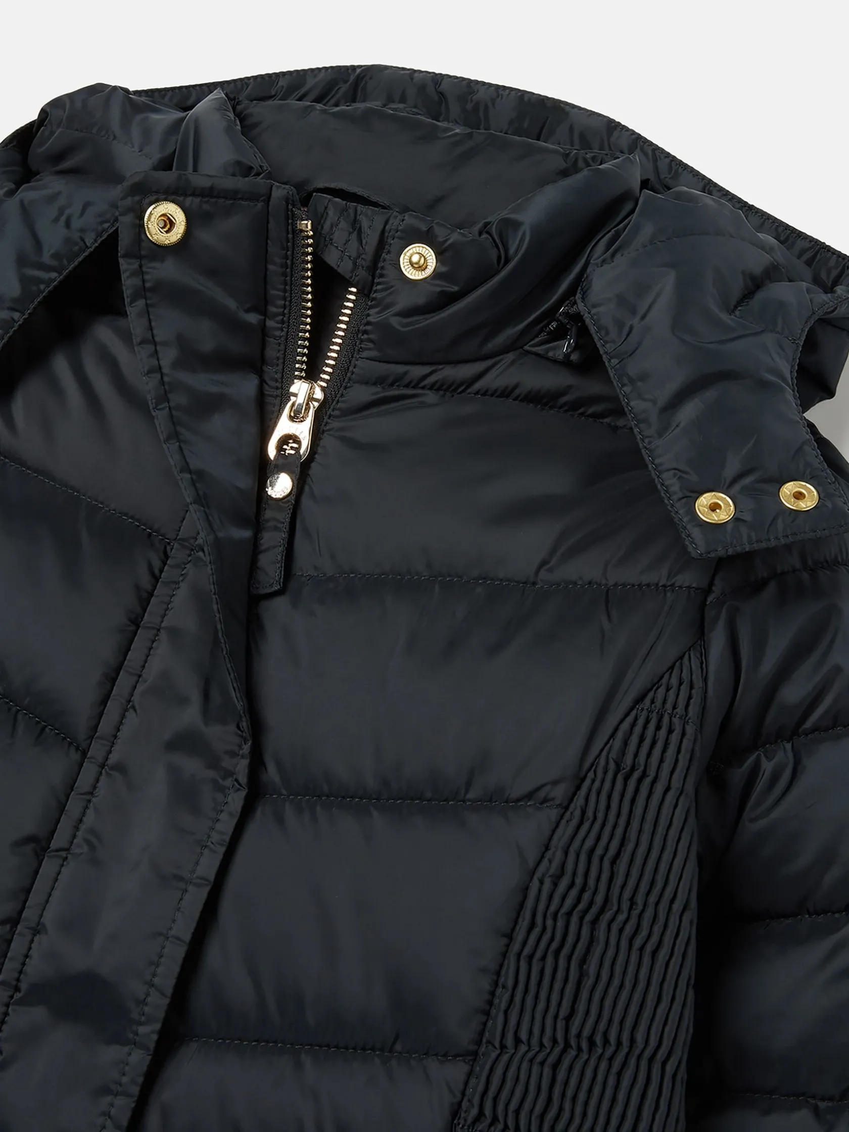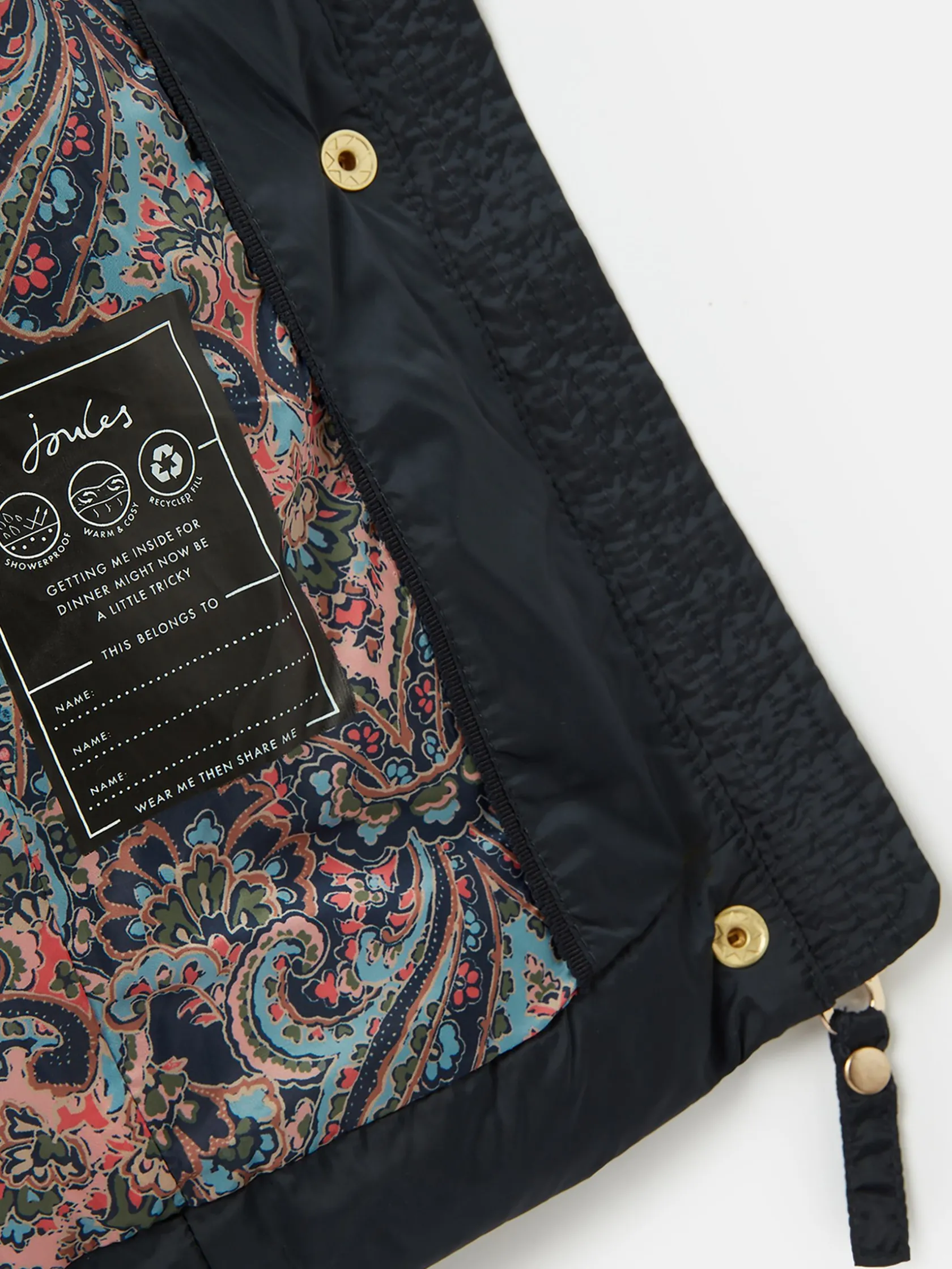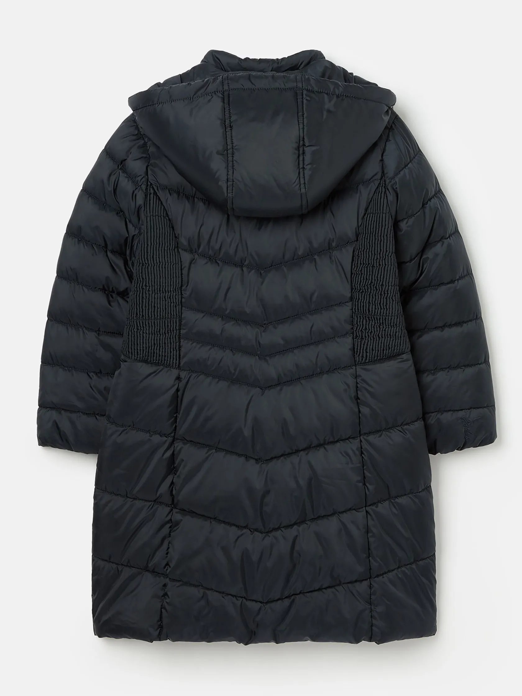 If you’re looking for a trustworthy new coat that will welcome the cold weather in style, then the Pembury has you covered. Our designers have cleverly added shirred side panels, slimmer chevron baffles to the waist and curved seams to the centre to balance out its shape for a more flattering fit without compromising on cosiness. The fabric has a soft-to-touch pearlised finish that’s also showerproof, making it perfect for light bursts of rain, and the hood is detachable so you can decide your level of protection before you head out. The high neck and chin guard with popper fastenings also add an additional touch of coverage to snuggle into when the wind starts to whistle on through. You’ll find two invisible zip pockets to each side and a beautiful hand-drawn printed lining inside. Showerproof. Padded with chevron quilting and variegated baffles to the waist. Shirred side panels. Detachable hood with zip and internal waist adjusters. Pearlised finish. Printed lining. Zip and popper fastening. Two hidden zip side pockets. Joules hare embroidery to hem and Joules script logo to the sleeve.