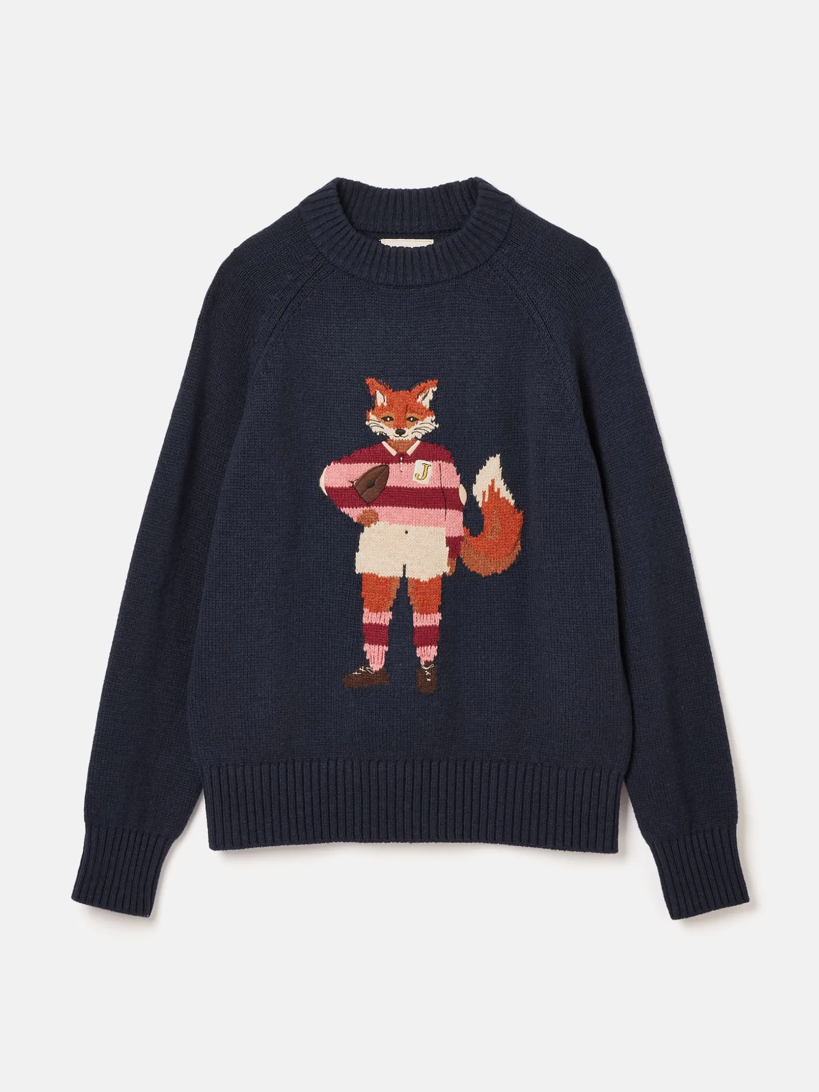 Bright eyed and bushy tailed, this jumper will make quite the statement in your wardrobe. First and foremost let us introduce Jonty the fox. This rather distinguished character is the focal point of the piece and represents the eccentricity of British style. The fox is knitted into the jumper and ever a fan of being well-dressed, comes in either rugby kit or country attire for you to choose from. The jumper itself has been crafted with care from a quality cotton blend, it has a classic fit through the body and raglan sleeves for supreme comfort. The round neck and ribbed hem and cuffs offers the opportunity to layer almost anything underneath while its heritage colour palette is perfect for the season. Quirky and loveable, this is a style that will raise many a smile. Cotton blend. Classic fit. Intarsia Jonty the fox design. Long raglan sleeves. Round neck. Ribbed hem, neck and cuffs. Rugby outfit or country attire
