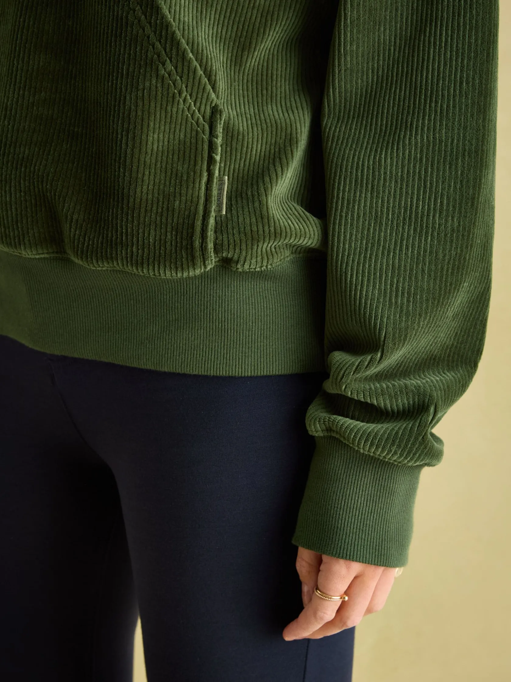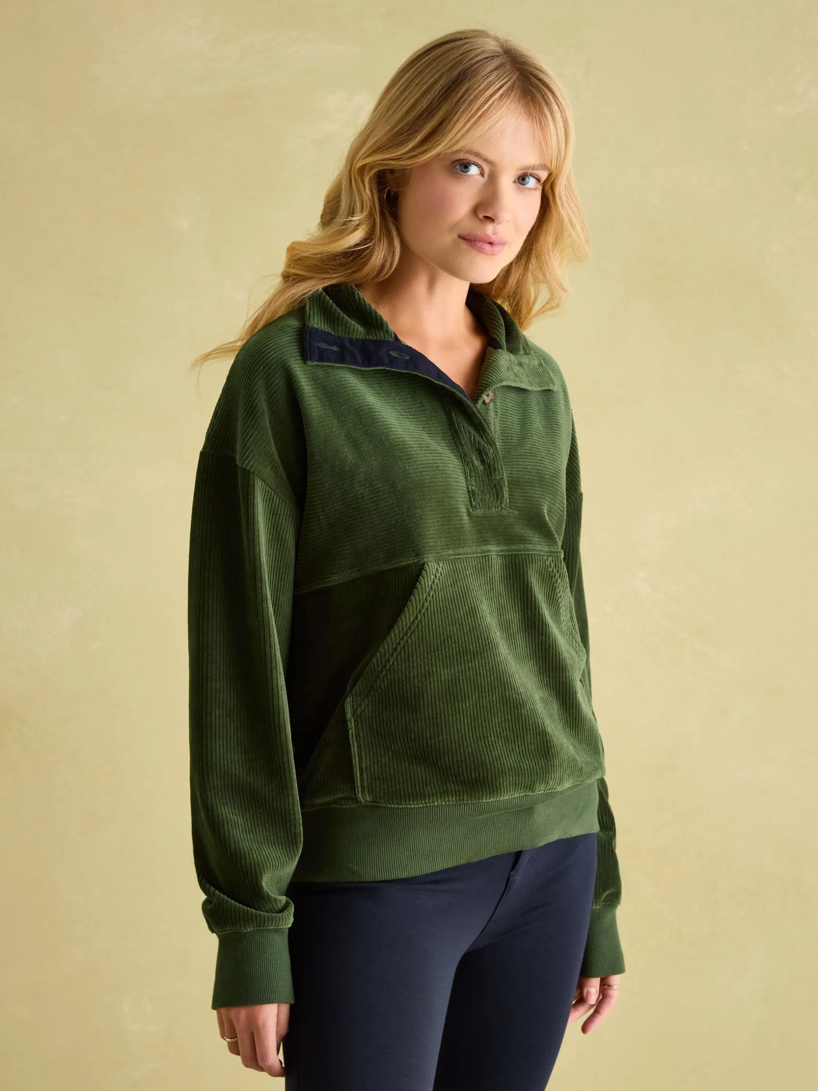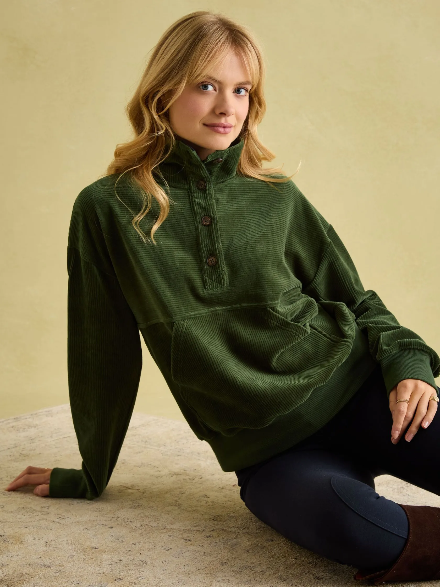 Combining classic corduroy fabric with an easy-to-wear sweatshirt design, the Renee will be your go-to of the season. Supremely soft inside and out, and featuring a button placket with funnel neck, it makes both a practical and stylish layering piece. It has a boxy fit, dropped shoulders and a kangaroo pocket to the front and is finished with a ribbed hem and cuffs. The utimate time-off style. Cotton corduroy. Boxy fit. Dropped shoulders. Button placket. Funnel neck. Kangaroo pocket to the front. Ribbed hem and cuffs. Joules embroidery to the back neck.