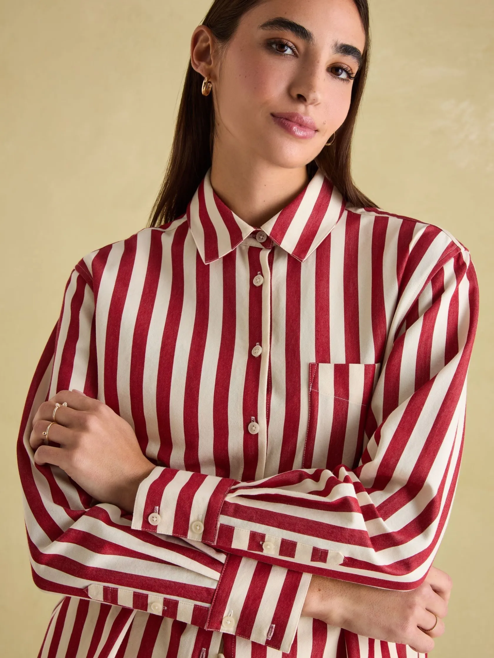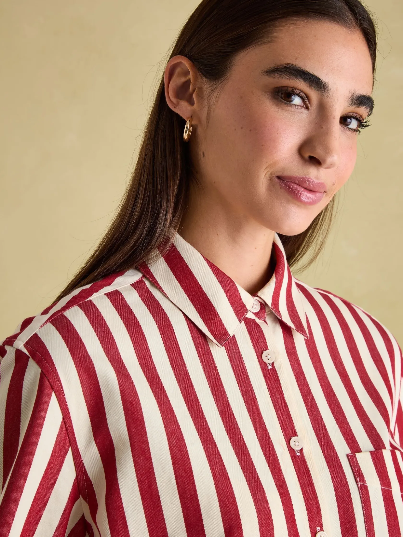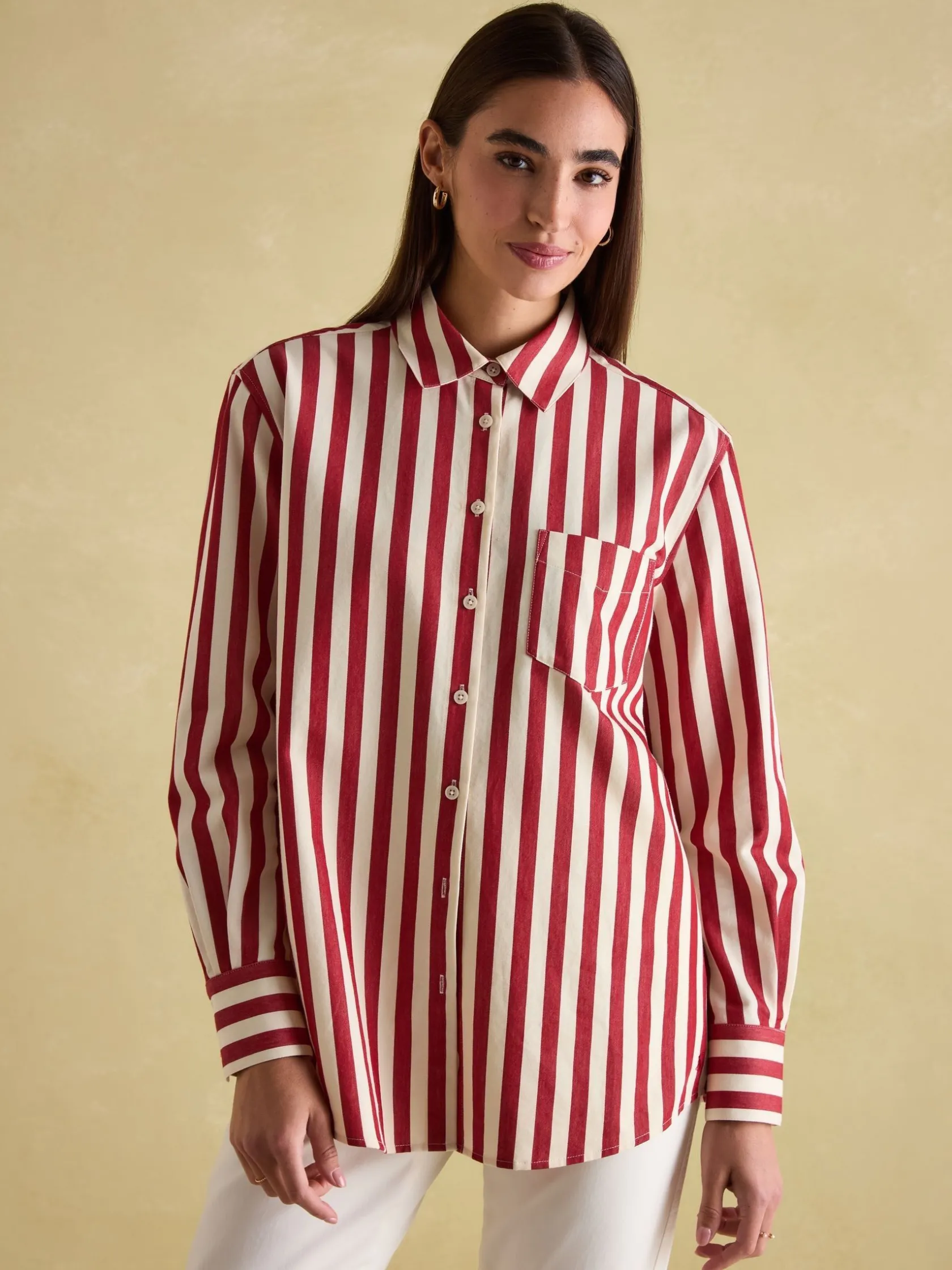 Your favourite shirt from the summer has been updated for the autumn and winter season in an array of new stripes. The Amilla is made from a crisp 100% cotton, has a relaxed fit to create an easy ‘throw on’ feel and has a button down fastening. The button cuffs allow you to create a laid-back look by rolling up the cuffs while the single patch pocket and hanging loop to the reverse are classic finishing features. A versatile piece, you can wear it un-tucked for a casual look or tucked in to create an effortless outfit that feels put-together. 100% cotton. Relaxed fit. Curved, dropped hem. Button down fastening. Collar. Long sleeves with button cuffs. Single patch pocket to the chest. Hanging loop to the reverse